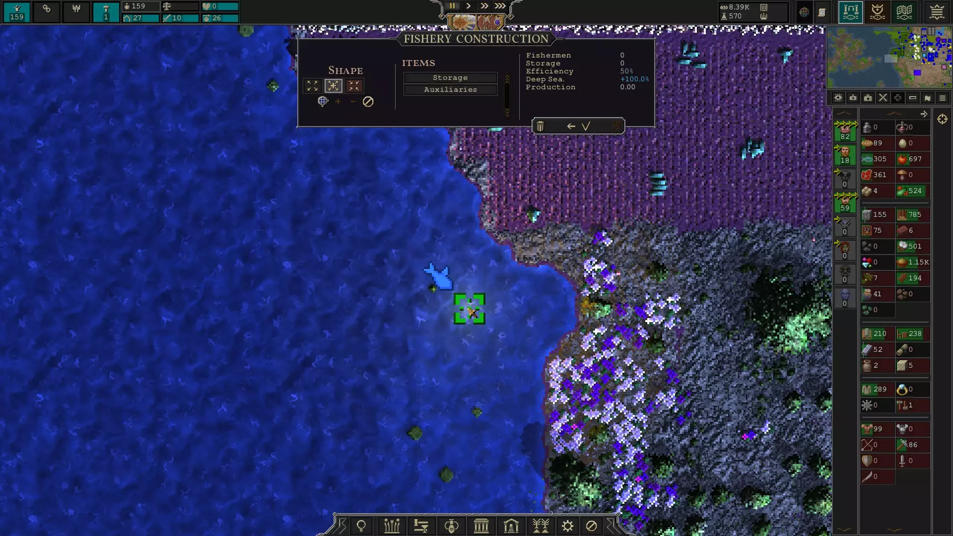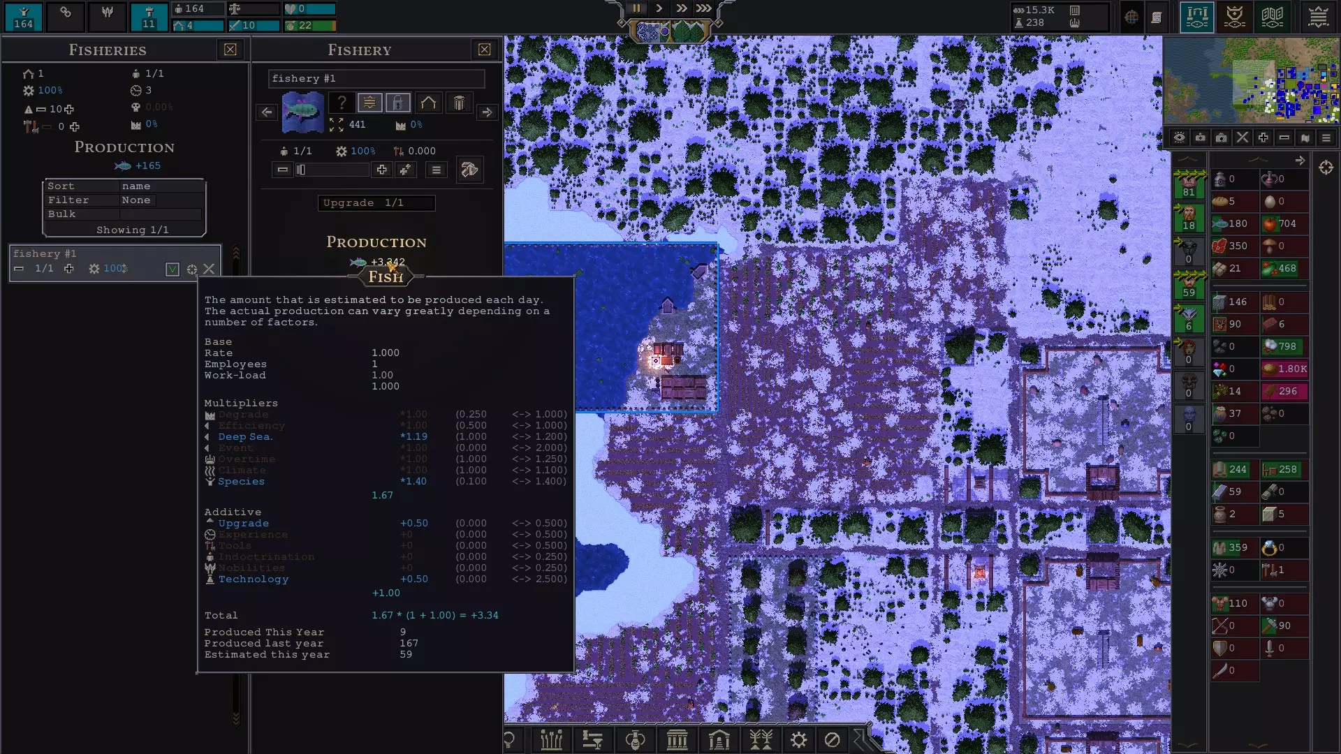如上面截图所示,计算最终【每名工人每日捕鱼量】的方法是:1.67×(1+1.00)=3.34。 其中,1.67这个数值的计算方式为:1.19(深水)×1.40(阿梅维亚鱼群)=1.67;而相加项的计算方式为:1(基础值)+0.5(升级加成)+0.5(科技加成)=1.00。然后将前一个结果与后一个结果相乘。如果我之前的表述不够清晰,可参考以下计算过程: (1.19×1.40)×(1+(0.5+0.5))=每日捕鱼量 1.67×(1+1.00)=每日捕鱼量 1.67×2=每日捕鱼量 3.34=每日捕鱼量 建造渔场时,你需要尽可能覆盖范围内的鱼群图标,以获得比浅水区更多的渔民数量。下方截图中可以看到其中一个鱼群图标。