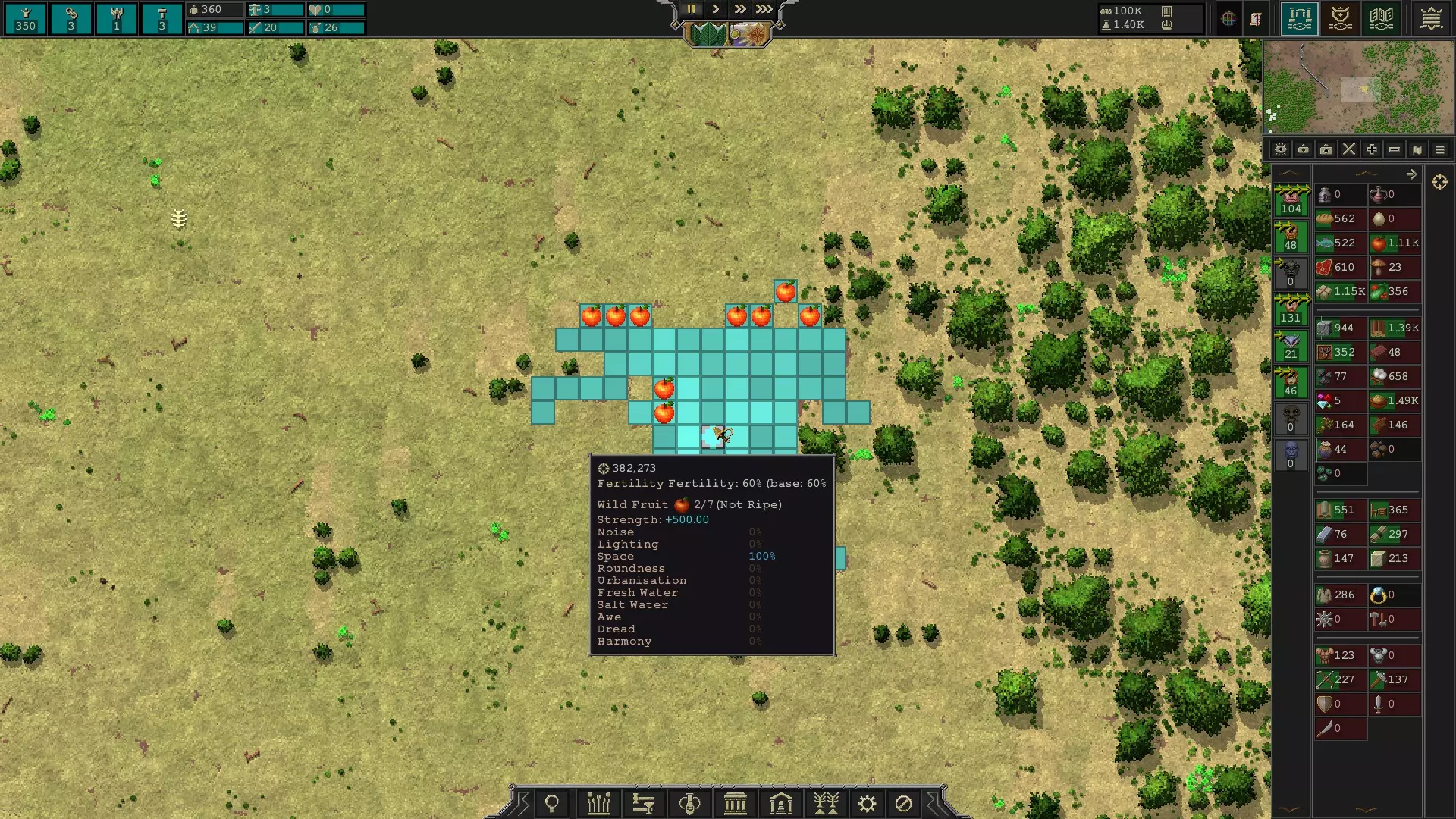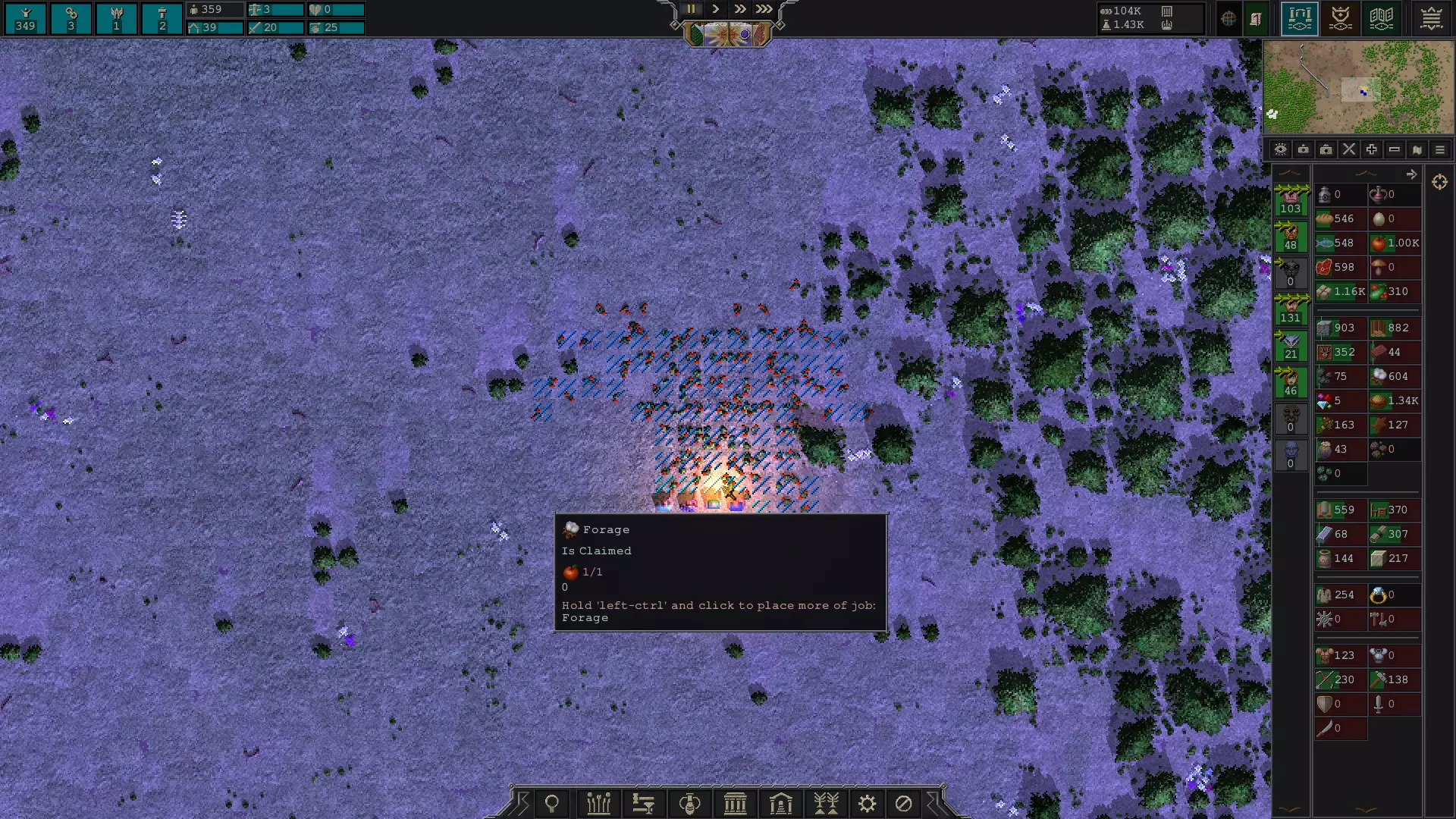 按住鼠标右键可以查看占据地块的详细信息,例如水果。如果靠近黏土,会显示黏土图标以及该黏土矿的采集品质。 要采集水果,点击底部栏用户界面中的【工作】(从右数第三个选项,也可以将鼠标悬停在各菜单选项上查看名称),然后从弹出菜单中选择【觅食】。接着,拖动选择框覆盖想要采集的食物,杂役们会在夏末开始采集食物。同时要注意,如果给杂役安排的工作过多,比如建造大型牧场、砍伐树木或挖掘山脉,他们可能无法在夏末及时采集食物。在游戏初期,觅食很有用。如果你食物不足,需要在夏末小幅增加食物储备,觅食能让你的零工产出食物。此外,觅食还能帮你获取足够的水果、蔬菜、谷物、蘑菇、棉花、草药或鸦片,以便开始耕种。出口时最赚钱的采集物是鸦片。以下是鸦片的截图。