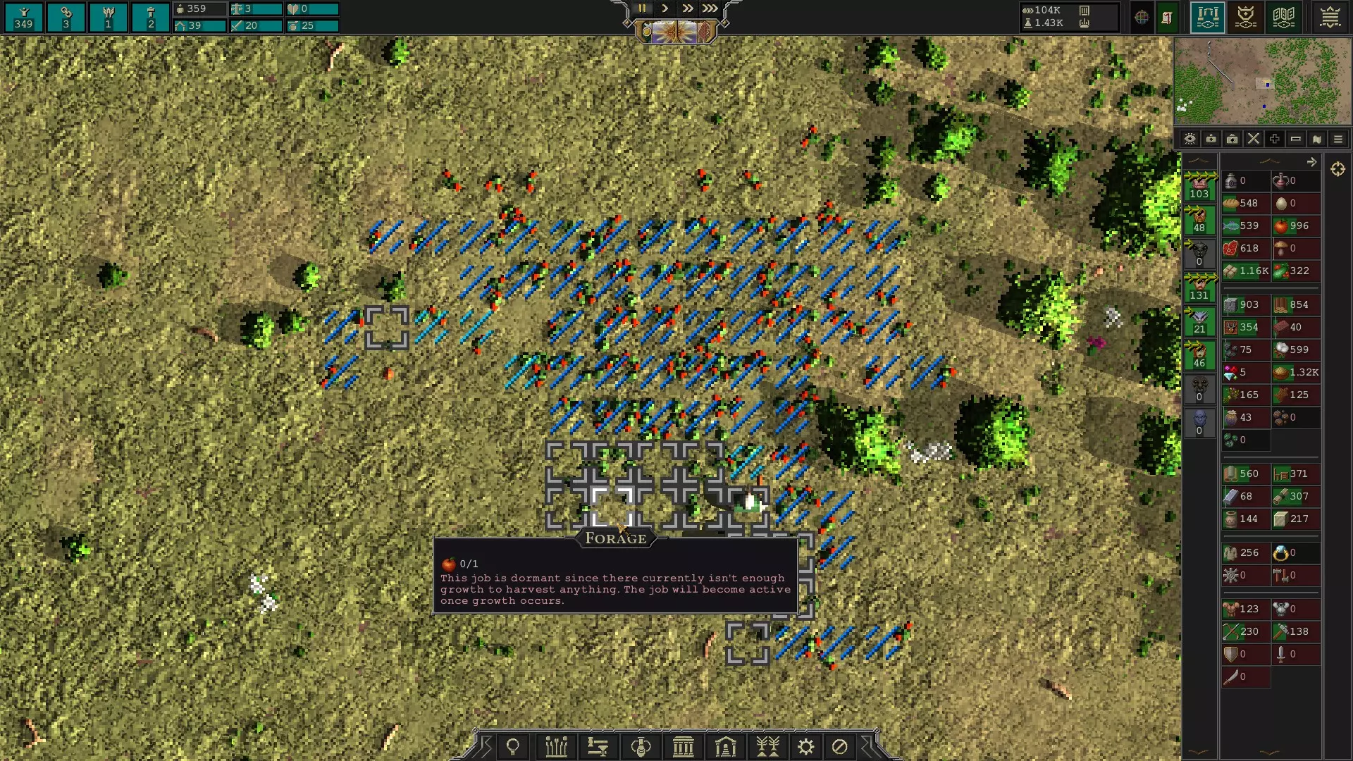 这就是果实成熟可以采摘时的样子。果实上会有蓝色的斜线,你可以在我的截图中看到我的临时工正在采摘一些果实。