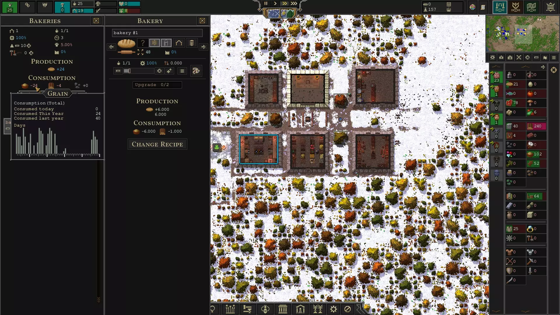 查看面包房时,面包房每年消耗的谷物数量所在位置。或者,你可以将光标悬停在右侧的谷物图标上,查看每日谷物预估产量。这将显示谷物的产量和消耗量。