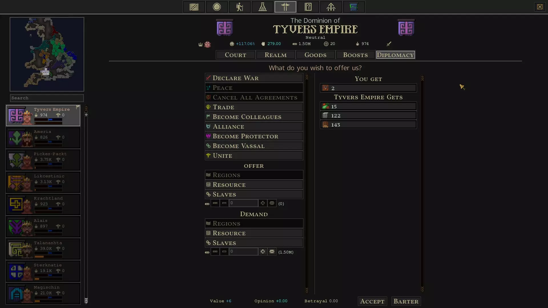 这是我所说的尺寸和工人需求的截图。 我知道其他玩家建议建造更大的牧场和农场,但我在初期会尽量把每个都建得小一些,因为首先需要清理树木,然后收集80-100木材来完成牧场的建造,这可能会很困难,具体取决于附近树木的数量。而且,你仍然需要你的零工去收集水果和蔬菜,而不是花数年时间建造一个大型牧场。 请记住,如果你的牧场太大而无法完成每日照料,动物就会死亡。你可以在点击已完全建造好的牧场查看其详情时,将鼠标悬停在每日照料信息上查看此信息。如果你的城市已在建设中且牲畜耗尽,就需要进口牲畜。你有两种交易方式。一种是通过外交窗口进行交易。另一种是使用自动进口仓库和自动出口仓库,这需要贸易协定。 外交交易:通过外交窗口交易无需事先达成贸易协定。你需要点击右上角显示金币、科技、储备和敌人的摘要,然后点击带有两面旗帜图标的派系标签,在左侧选择你想要交易的派系,接着点击外交部分。