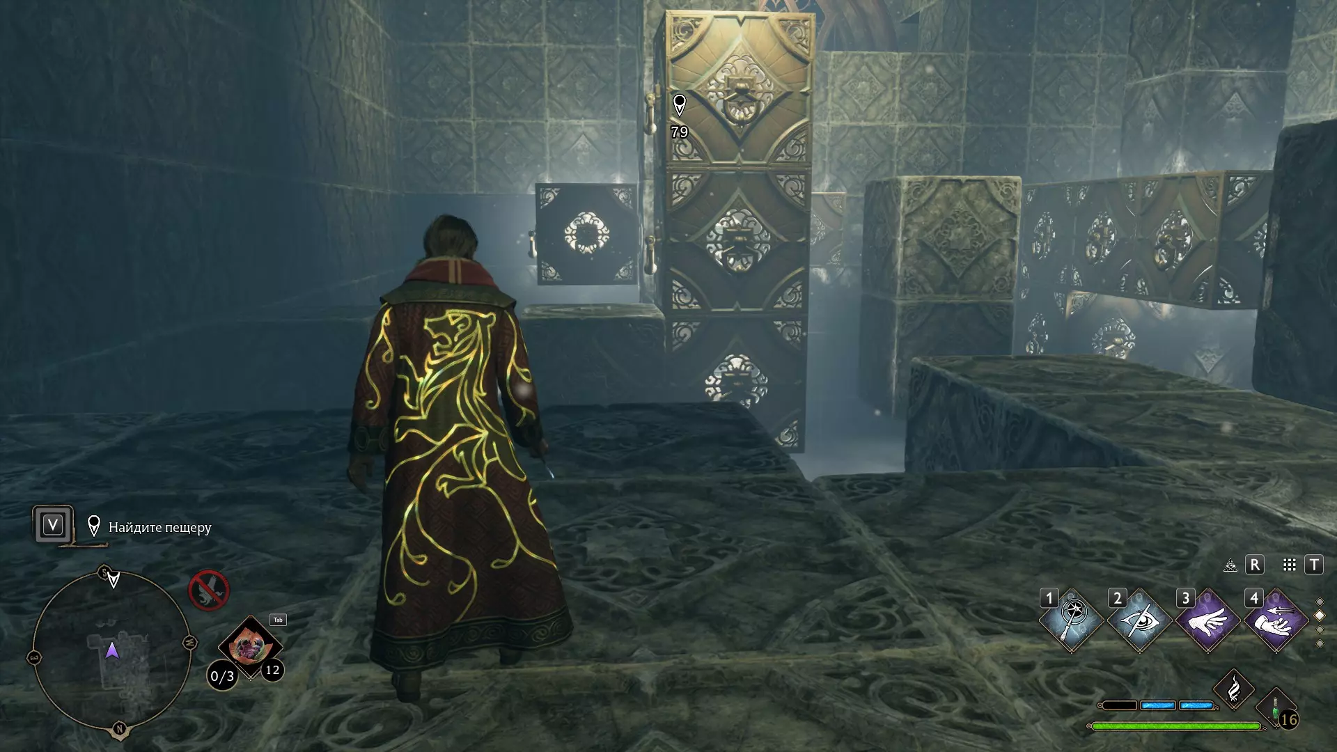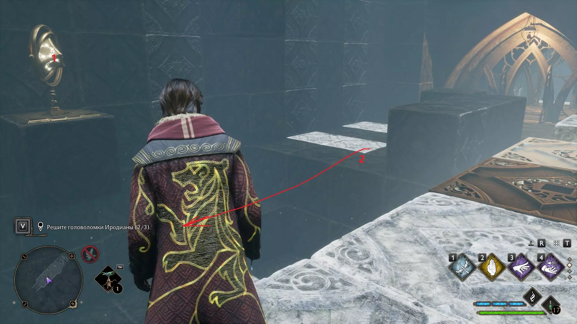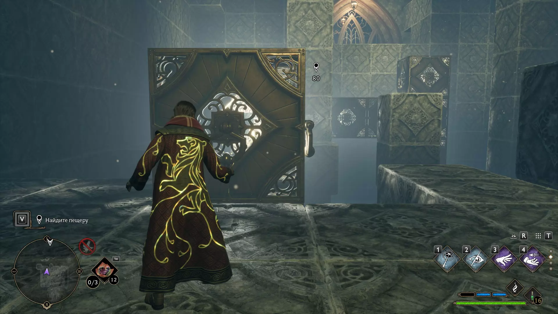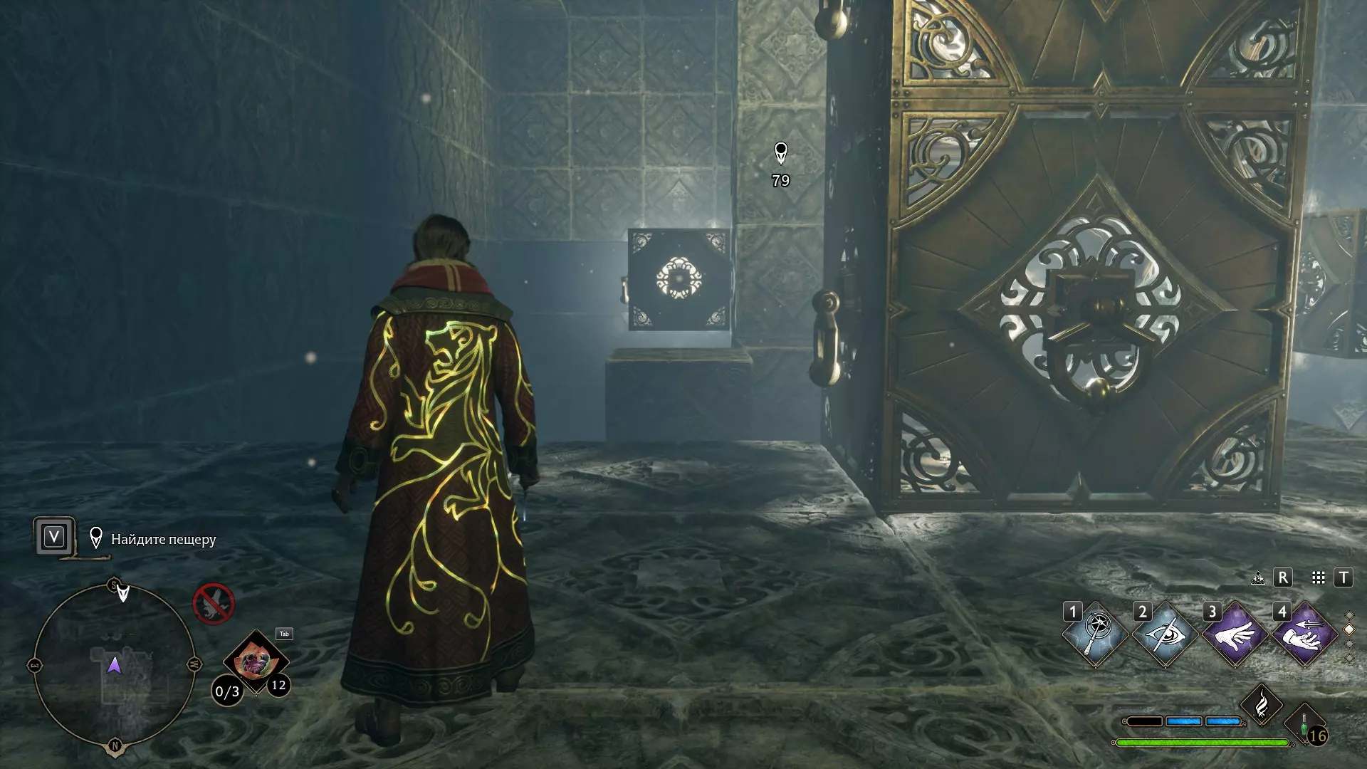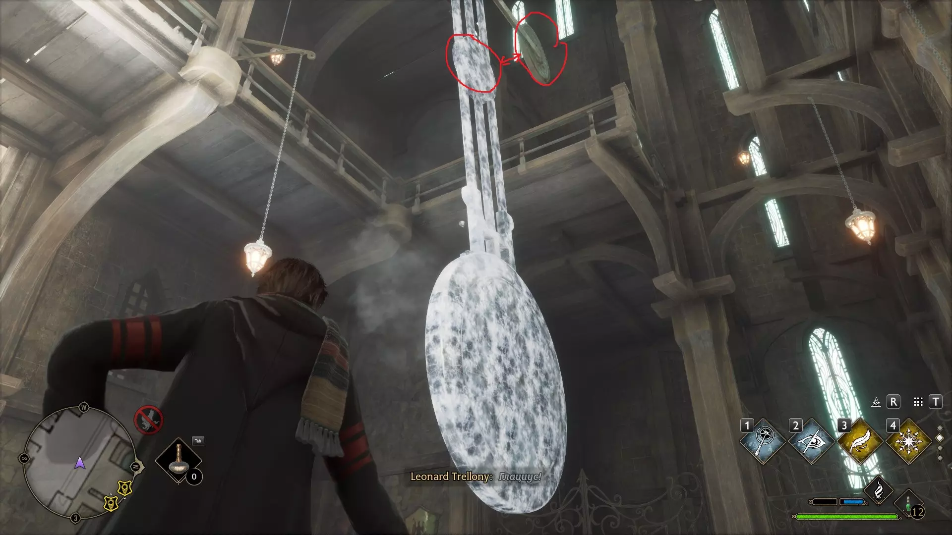只有在游戏接近中期,当你学会【冰刺术】(Глациус)或【时间停止】(Арресто моментум)这两个咒语后,才能进入这扇门。我们会看到头顶上有一个巨大的钟摆,需要在它开始从右向左摆动之前,将其停在最终位置。