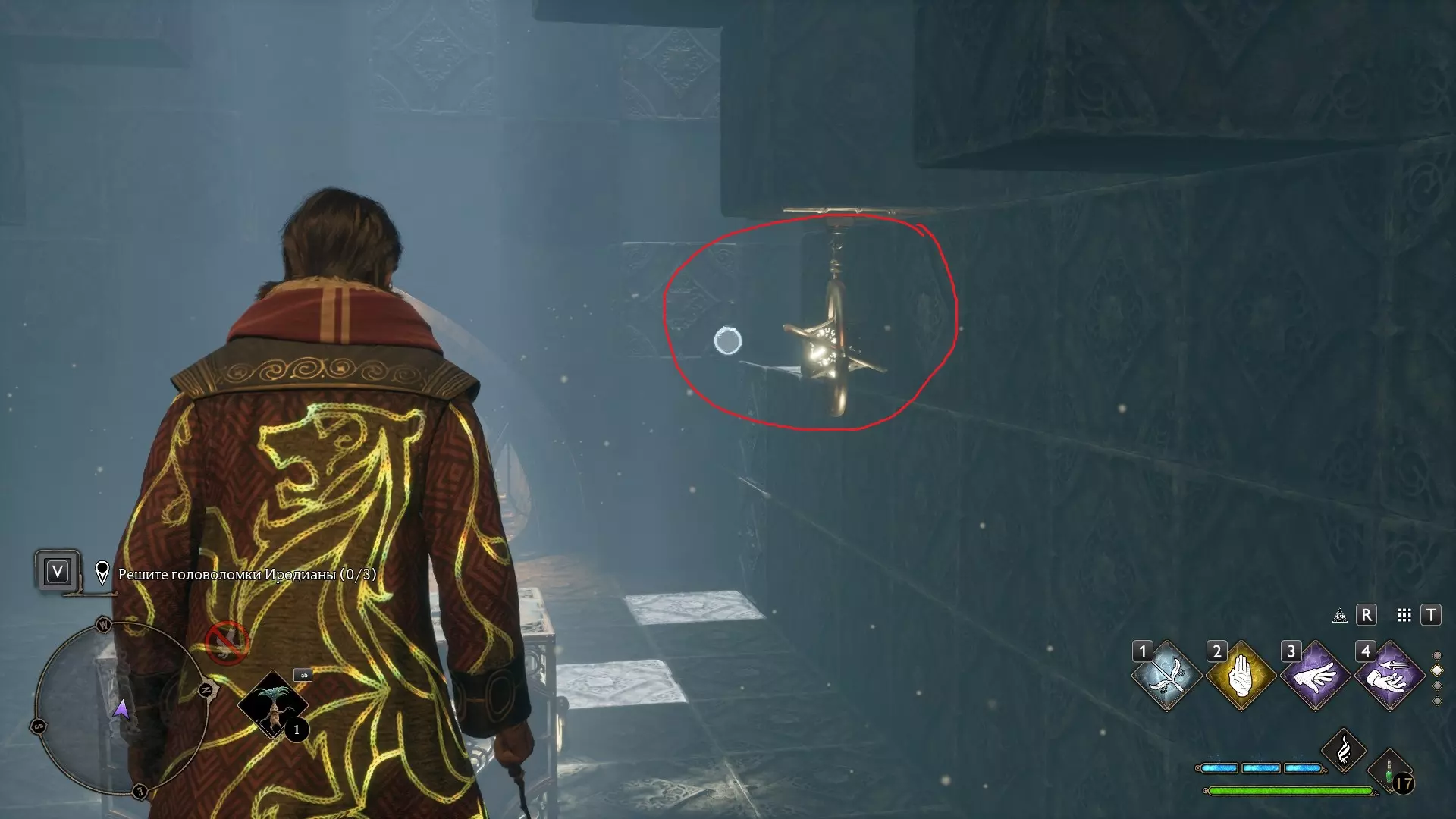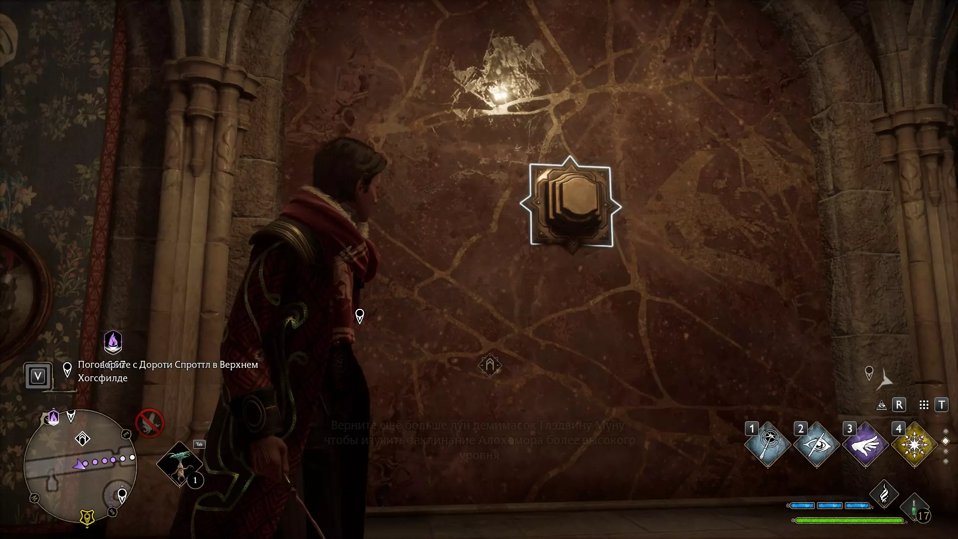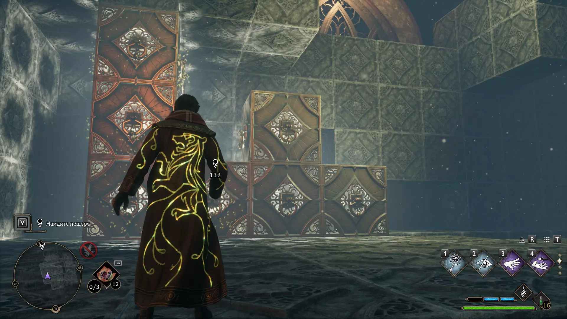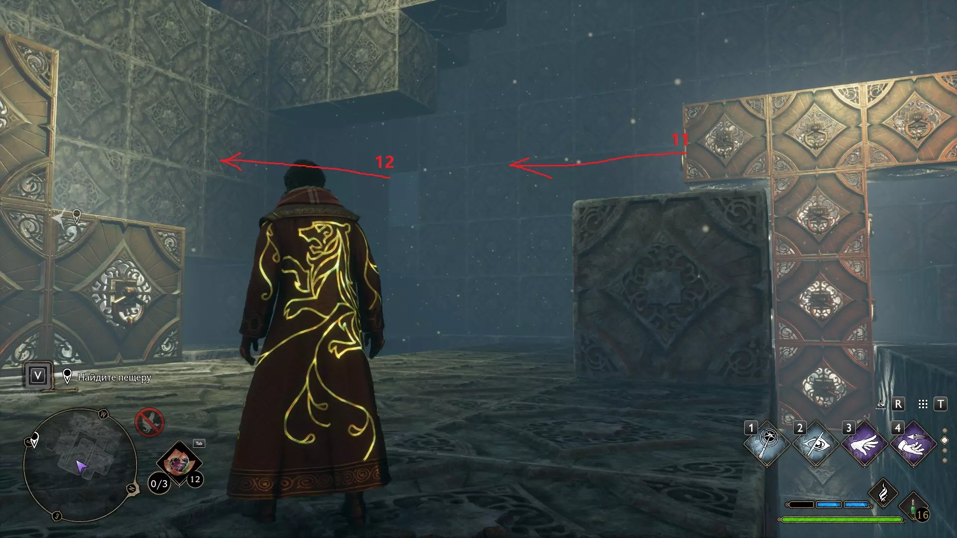 只有在游戏接近中期,当你学会【冰刺术】(Глациус)或【时间停止】(Арресто моментум)这两个咒语后,才能进入这扇门。我们会看到头顶上有一个巨大的钟摆,需要在它开始从右向左摆动之前,将其停在最终位置。