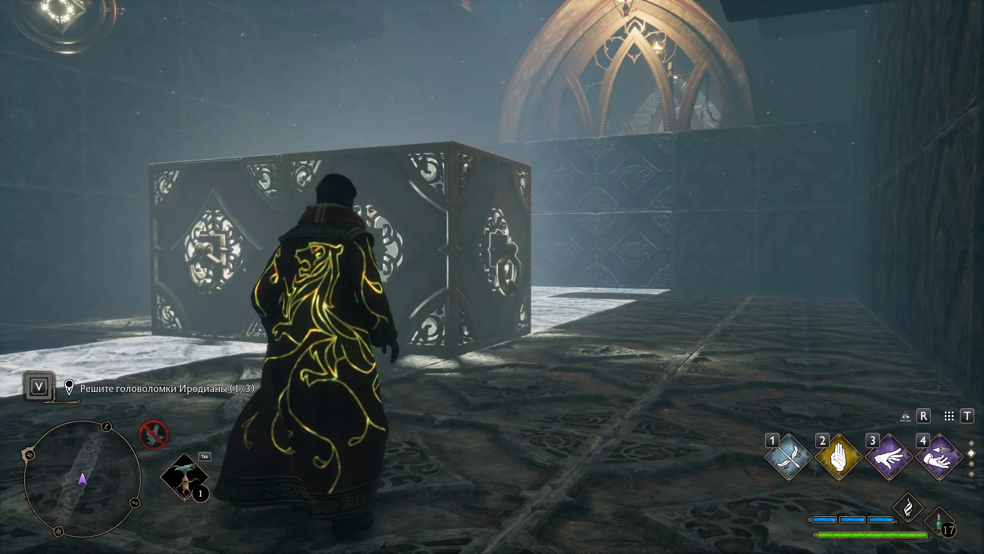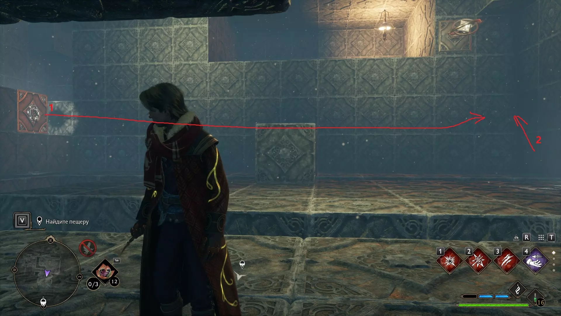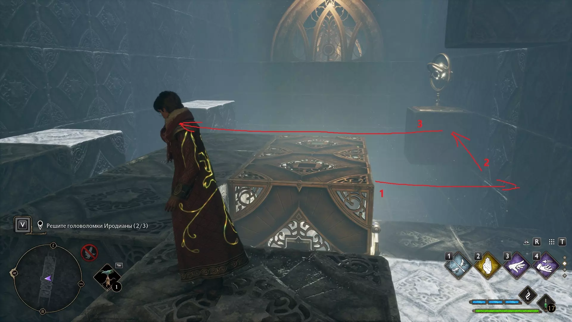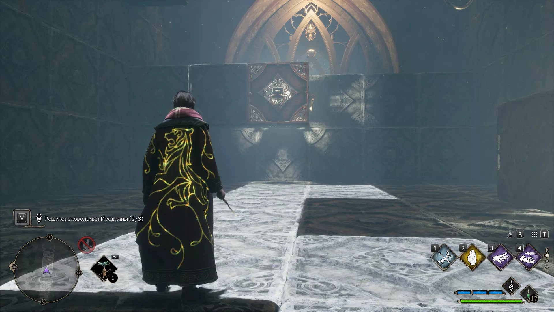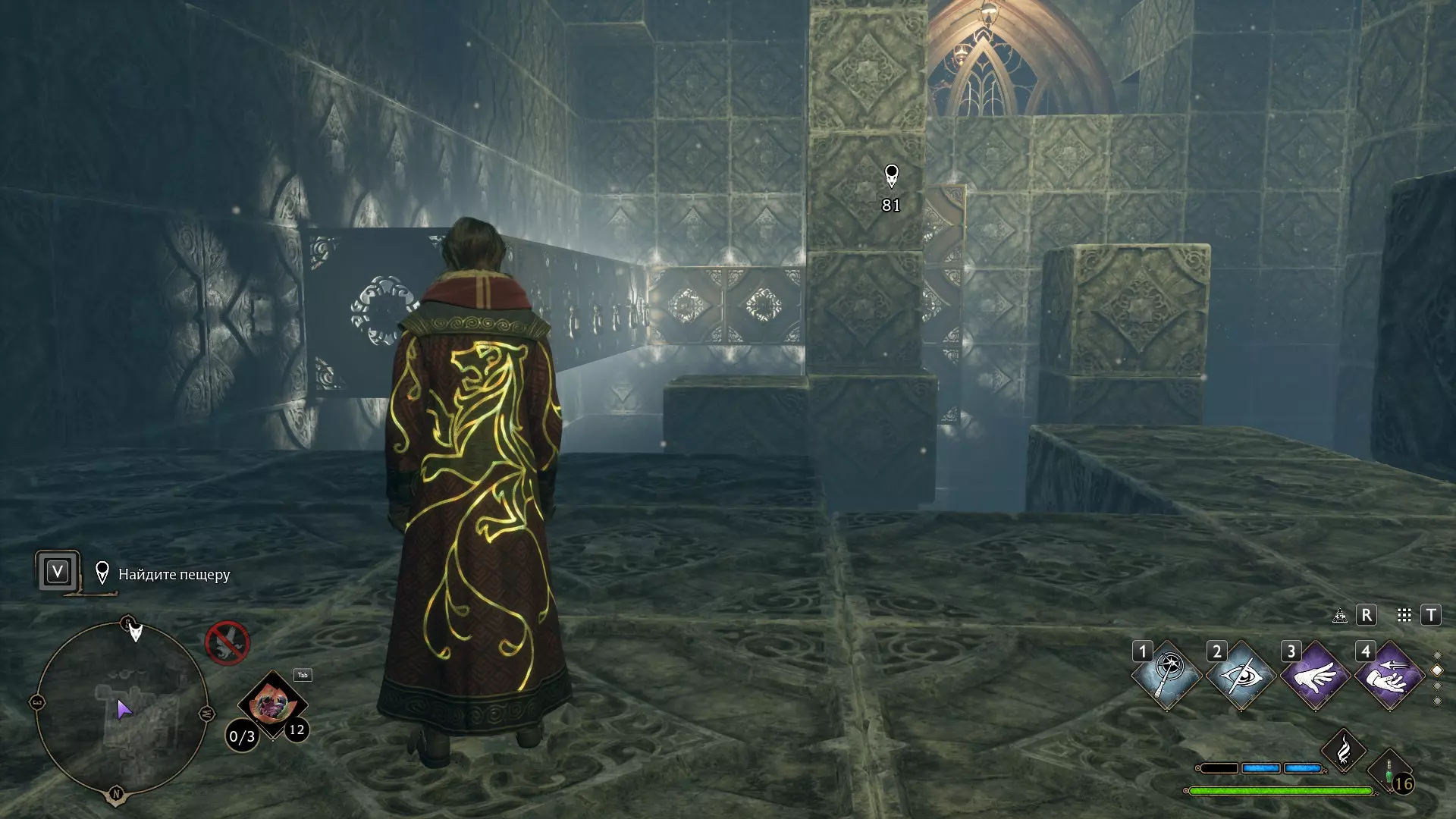 只有在游戏接近中期,当你学会【冰刺术】(Глациус)或【时间停止】(Арресто моментум)这两个咒语后,才能进入这扇门。我们会看到头顶上有一个巨大的钟摆,需要在它开始从右向左摆动之前,将其停在最终位置。