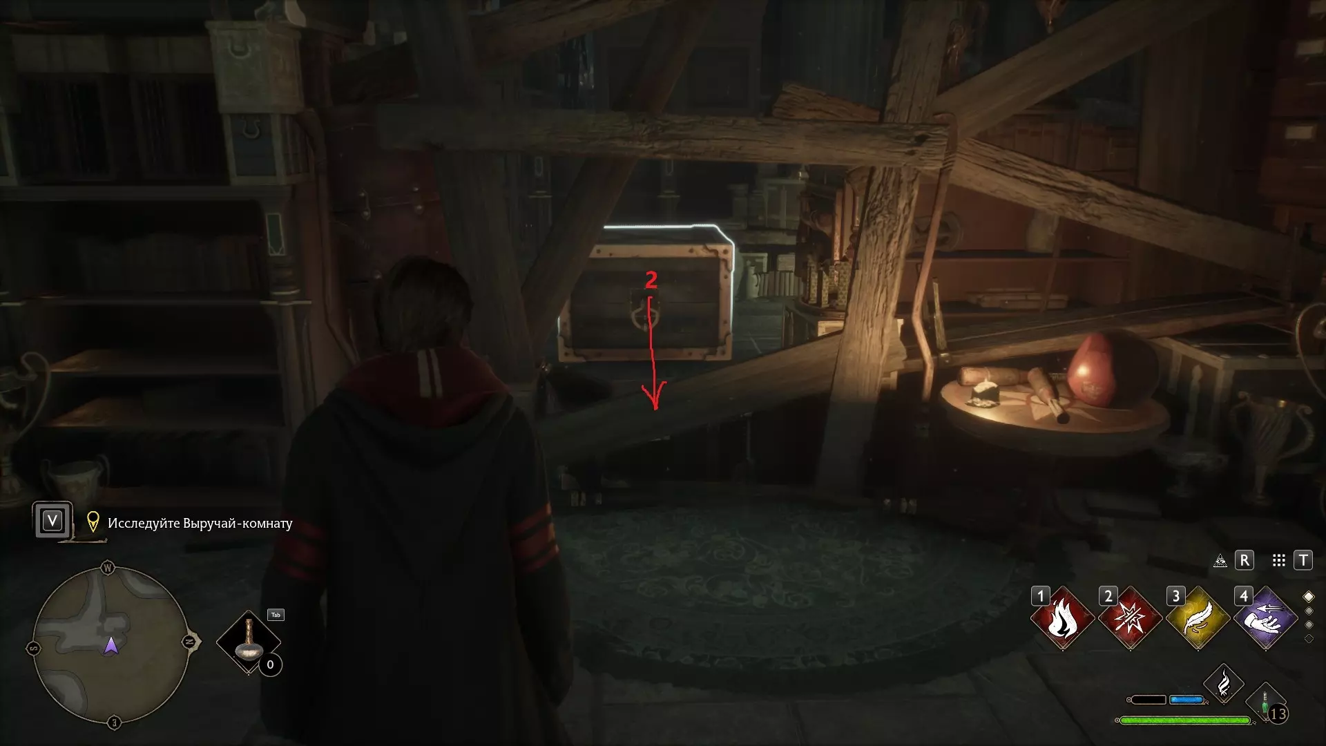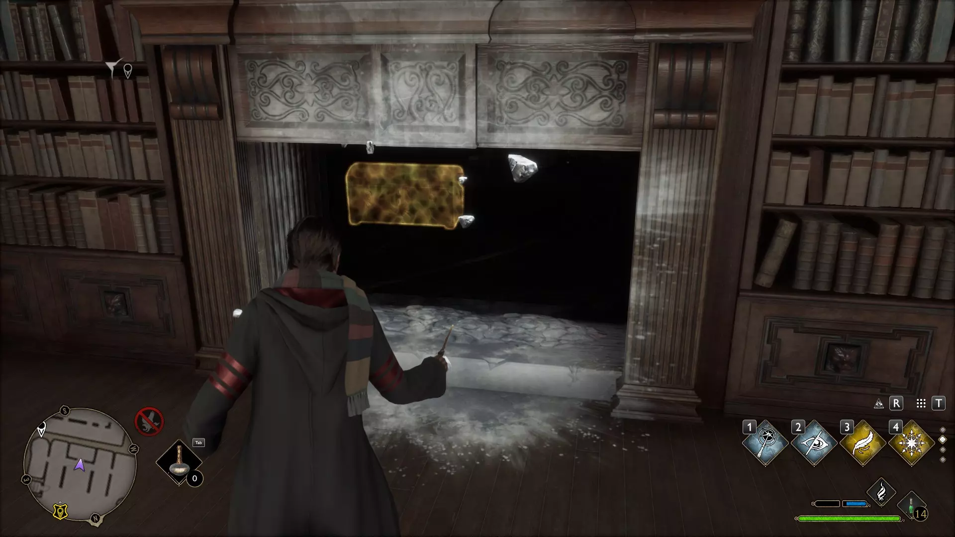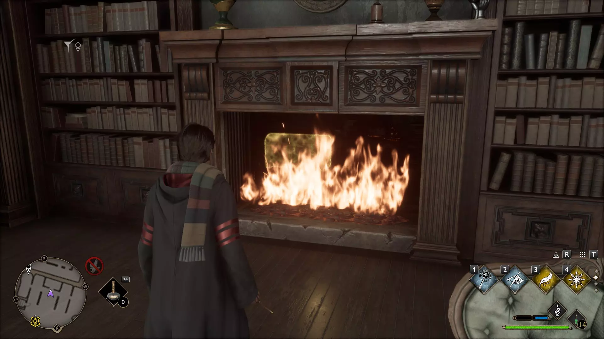 图书馆的壁炉 再次来到图书馆可能会为你揭开另一个小秘密。比如,壁炉正在燃烧,而它后面有一个箱子。不过,【冰冻咒】(Глациус)可以解决这个问题。