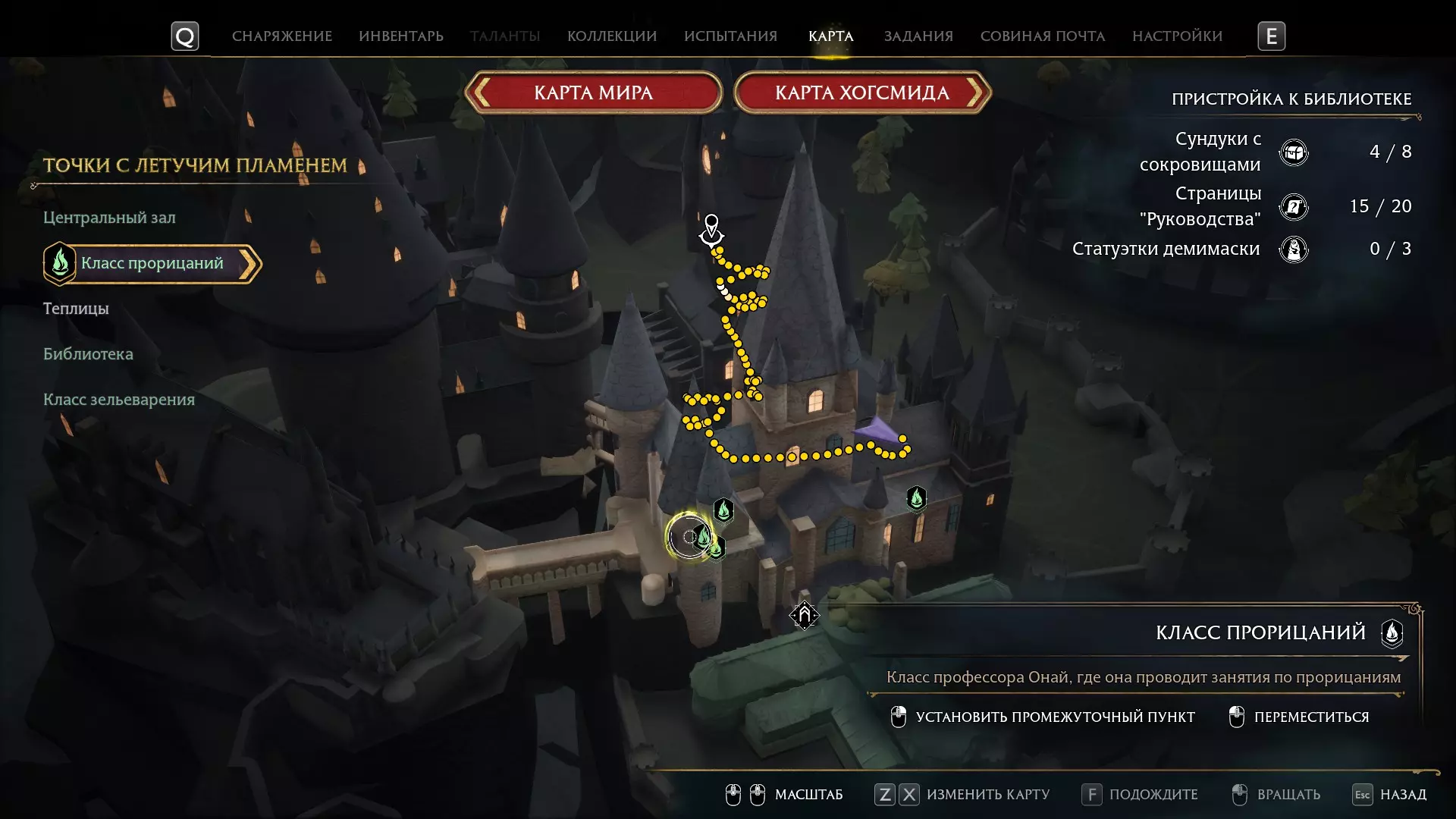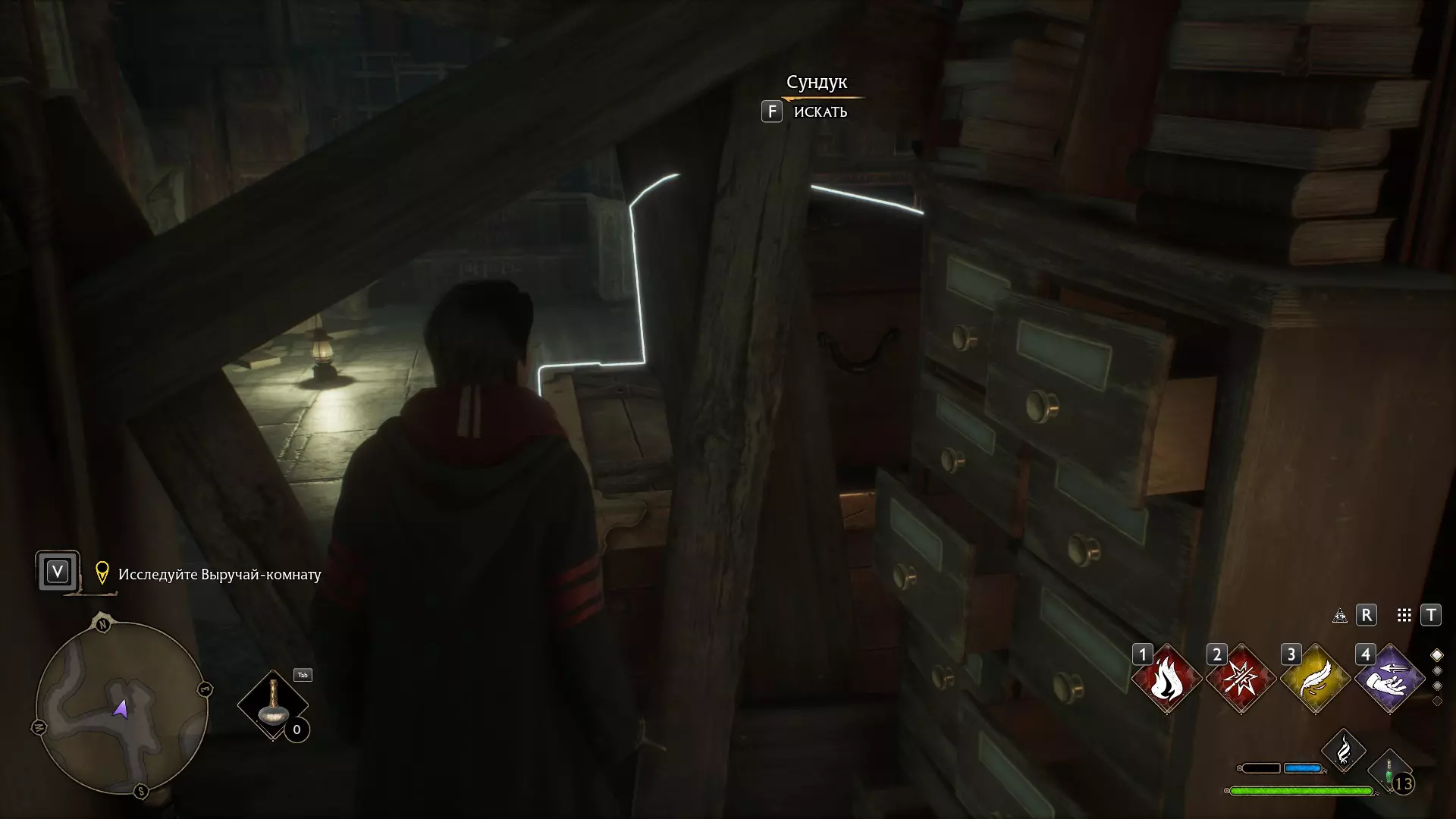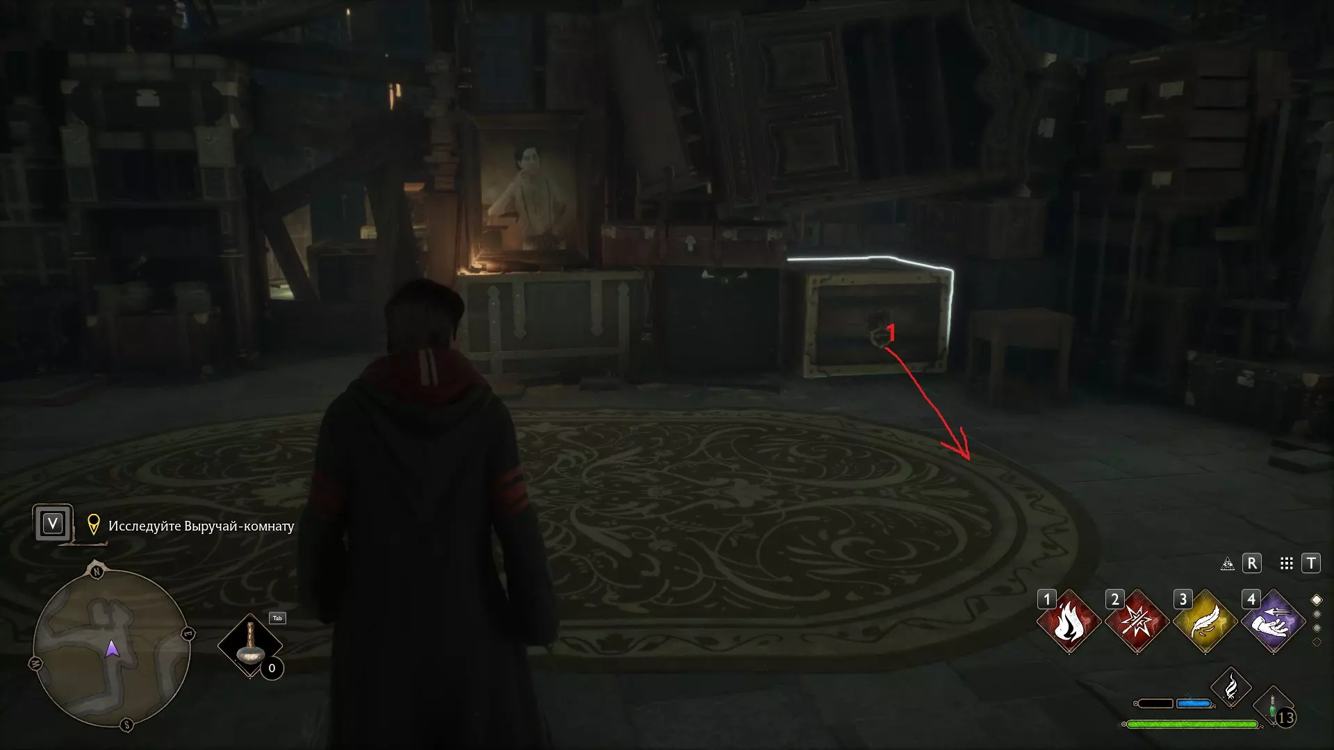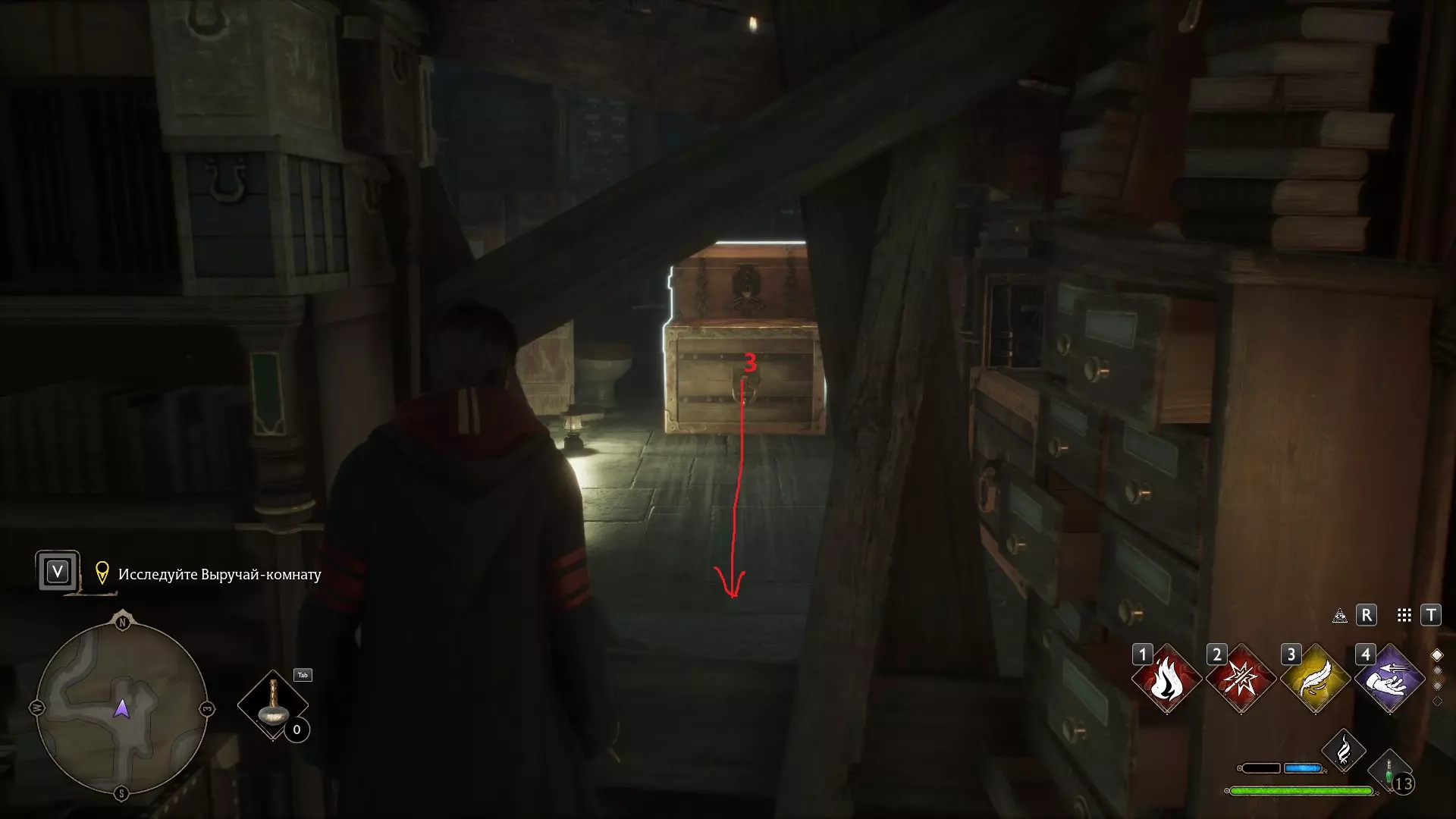 图书馆的壁炉 再次来到图书馆可能会为你揭开另一个小秘密。比如,壁炉正在燃烧,而它后面有一个箱子。不过,【冰冻咒】(Глациус)可以解决这个问题。