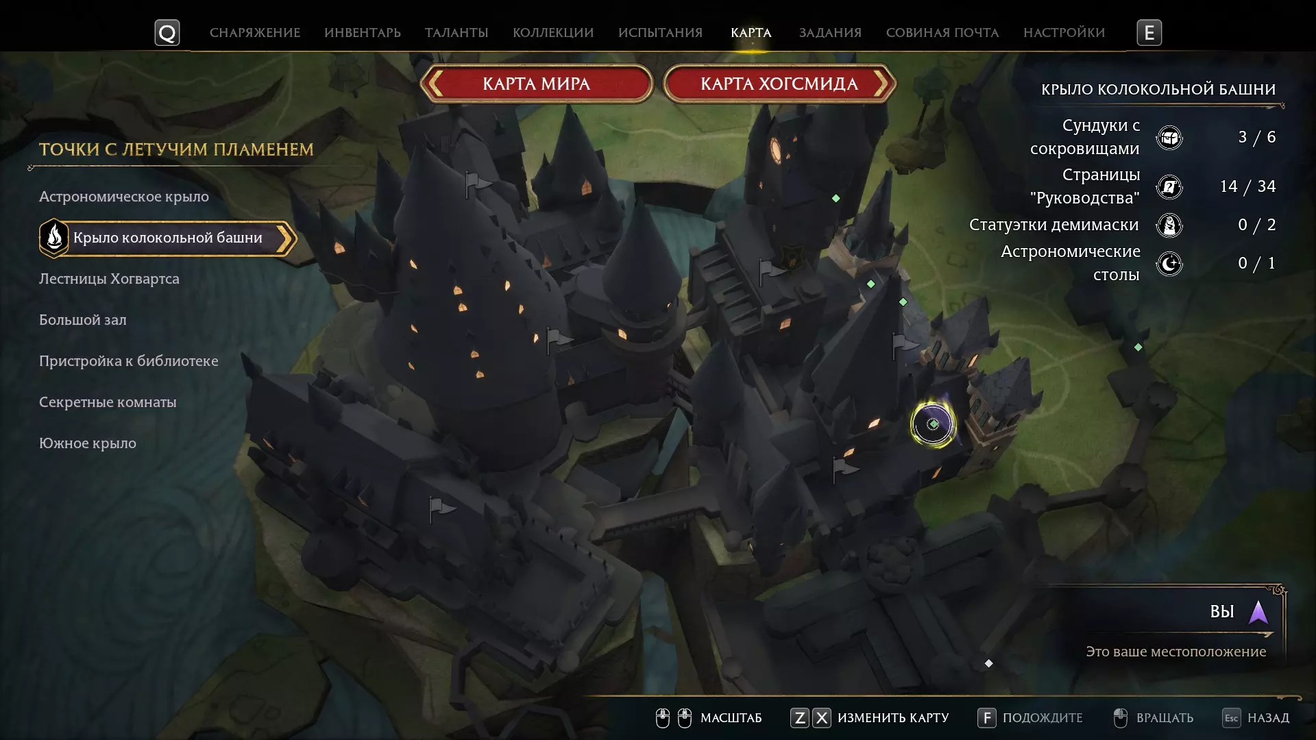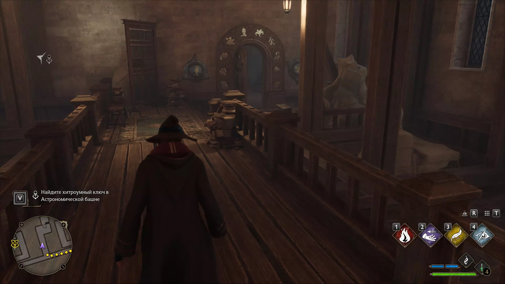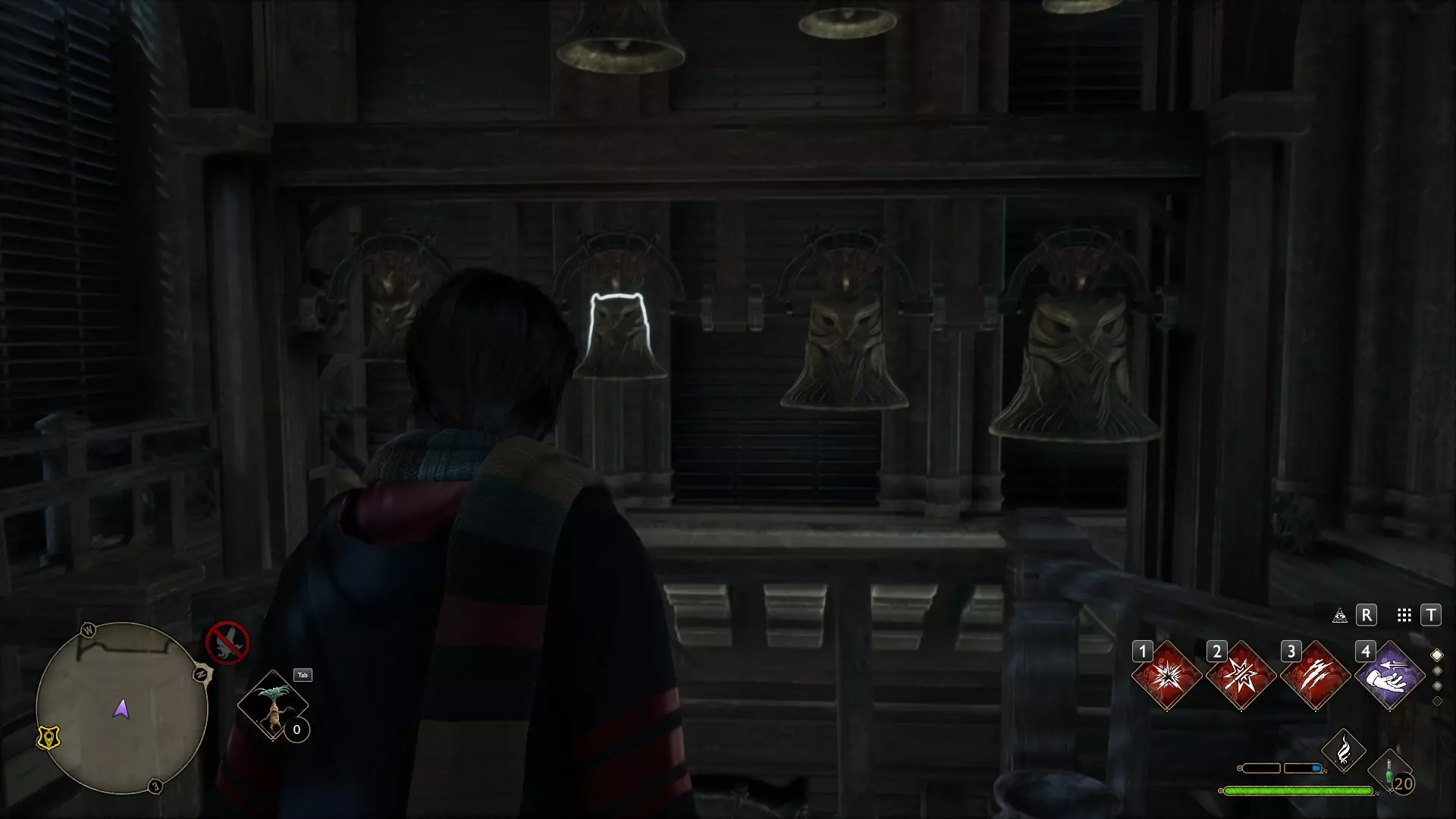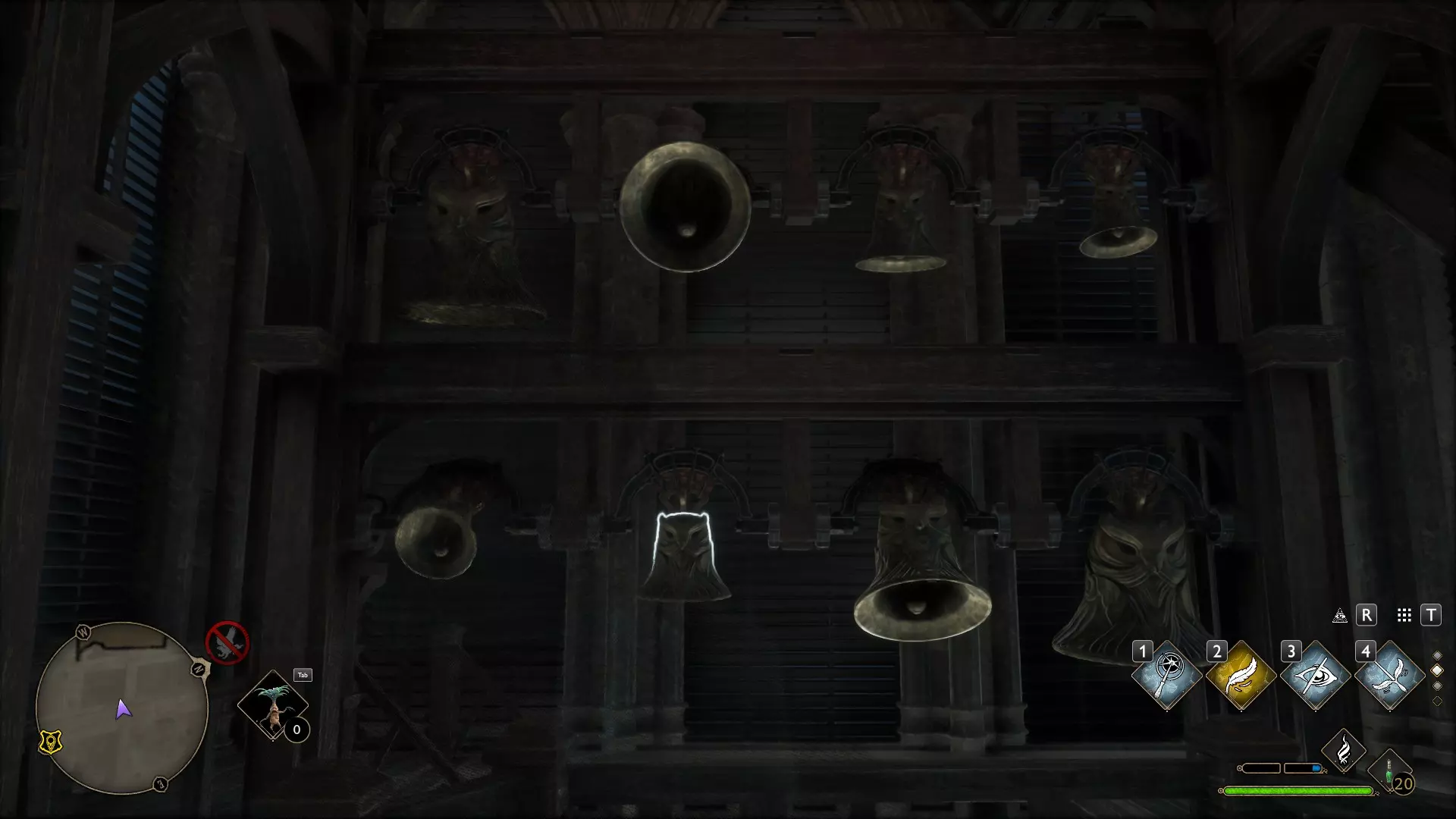 有一个谜题很显眼,但我一直没去管它——就是那个铃铛谜题。 如果有人已经在任务中打开了楼上的门,那就可以跳过这个,因为铃铛只用来开门! 但如果是在探索时偶然发现的,那你就得费点功夫了。好,我们开始。首先,理想情况下,你需要学会“羽加迪姆 勒维奥萨”这个咒语。也可以组合使用“悬浮咒(Levioso)”和“飞来咒(Accio)”,不过当时实在懒得麻烦。总之,需要用这些咒语把两个铃铛放到指定位置。 要到达那里,需要传送到钟楼的侧翼,然后爬到顶部。