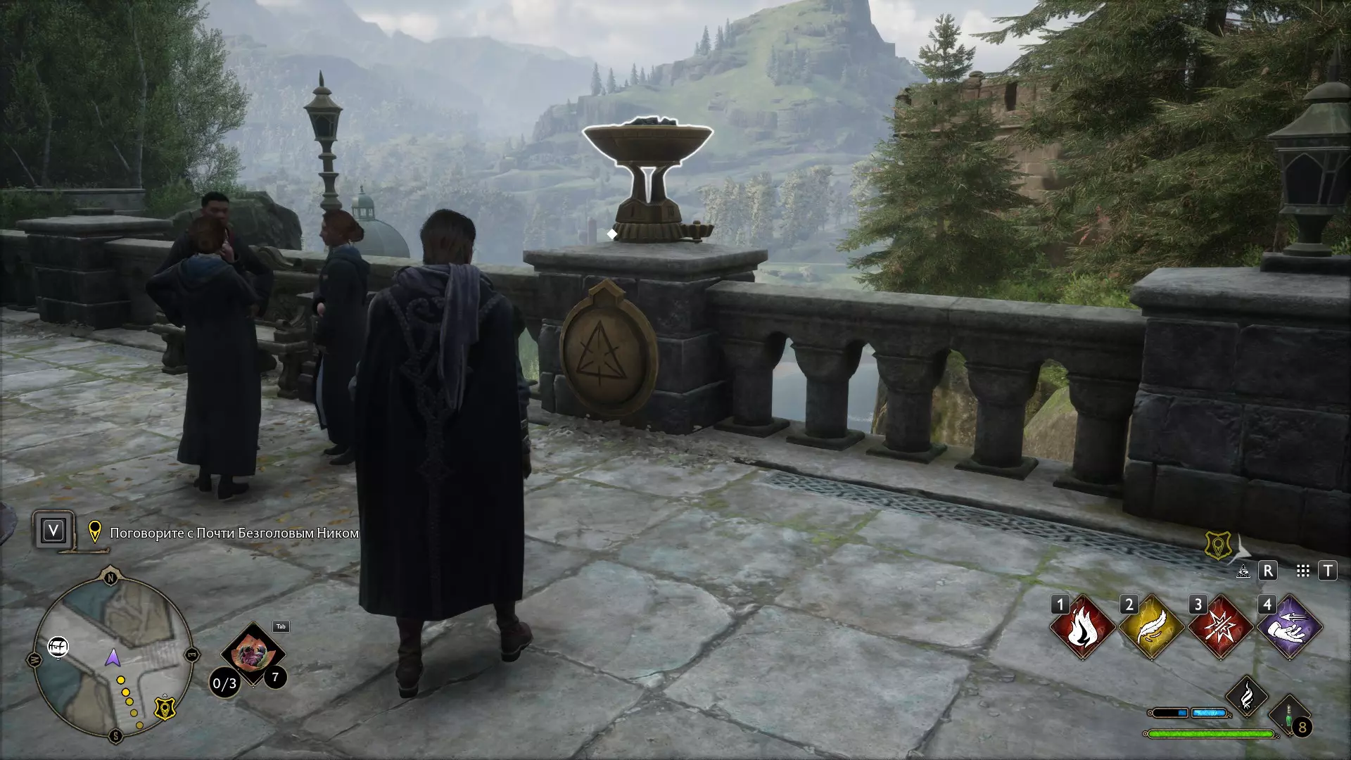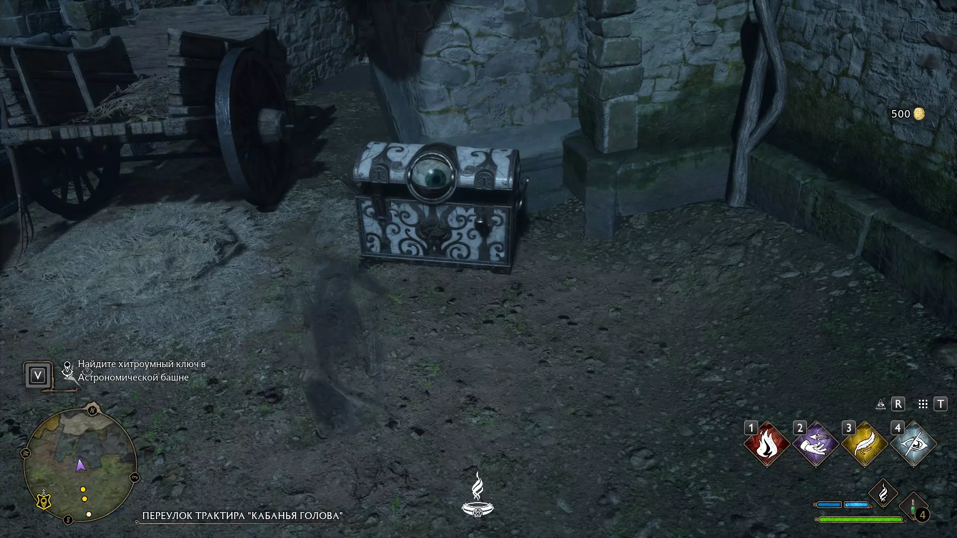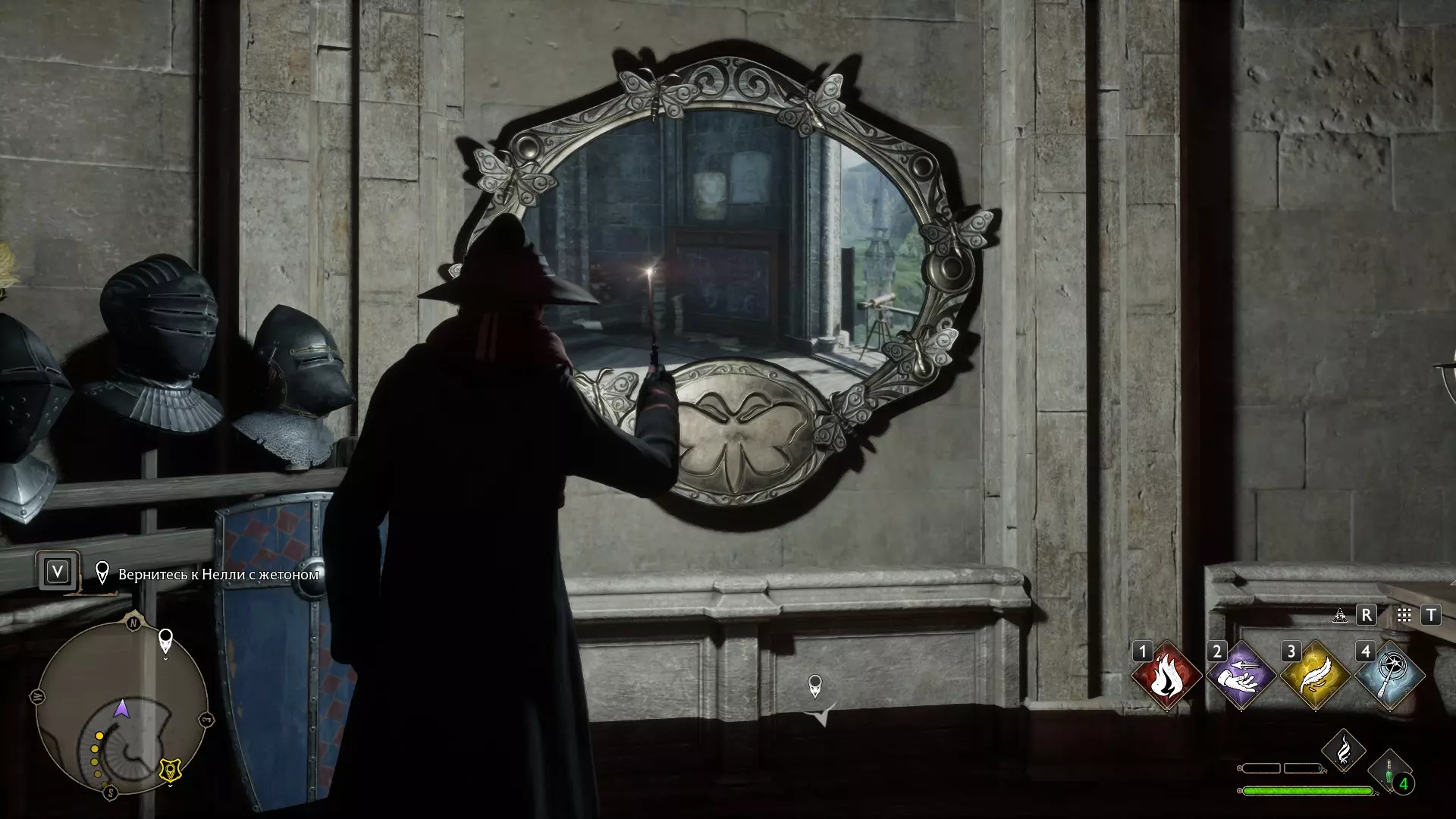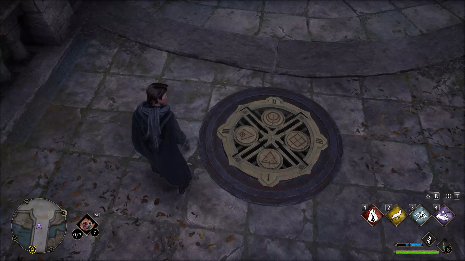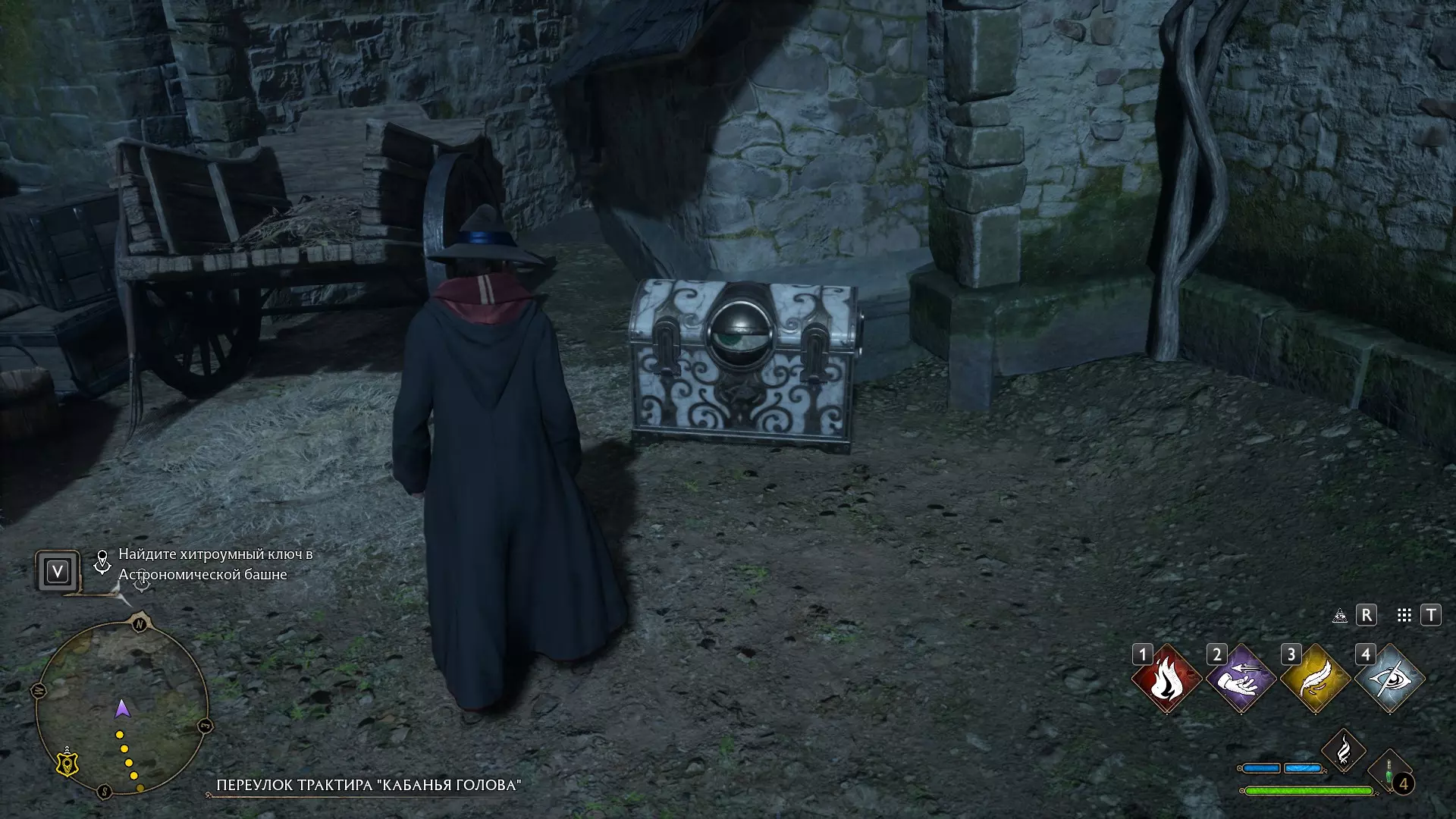 有一个谜题很显眼,但我一直没去管它——就是那个铃铛谜题。 如果有人已经在任务中打开了楼上的门,那就可以跳过这个,因为铃铛只用来开门! 但如果是在探索时偶然发现的,那你就得费点功夫了。好,我们开始。首先,理想情况下,你需要学会“羽加迪姆 勒维奥萨”这个咒语。也可以组合使用“悬浮咒(Levioso)”和“飞来咒(Accio)”,不过当时实在懒得麻烦。总之,需要用这些咒语把两个铃铛放到指定位置。 要到达那里,需要传送到钟楼的侧翼,然后爬到顶部。