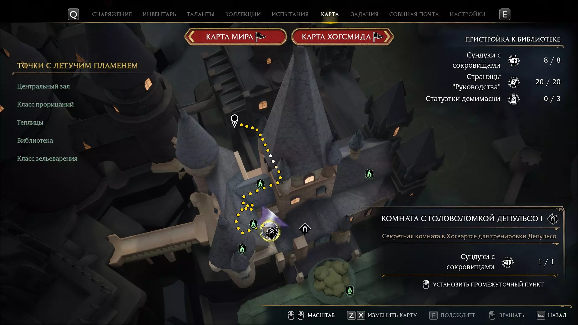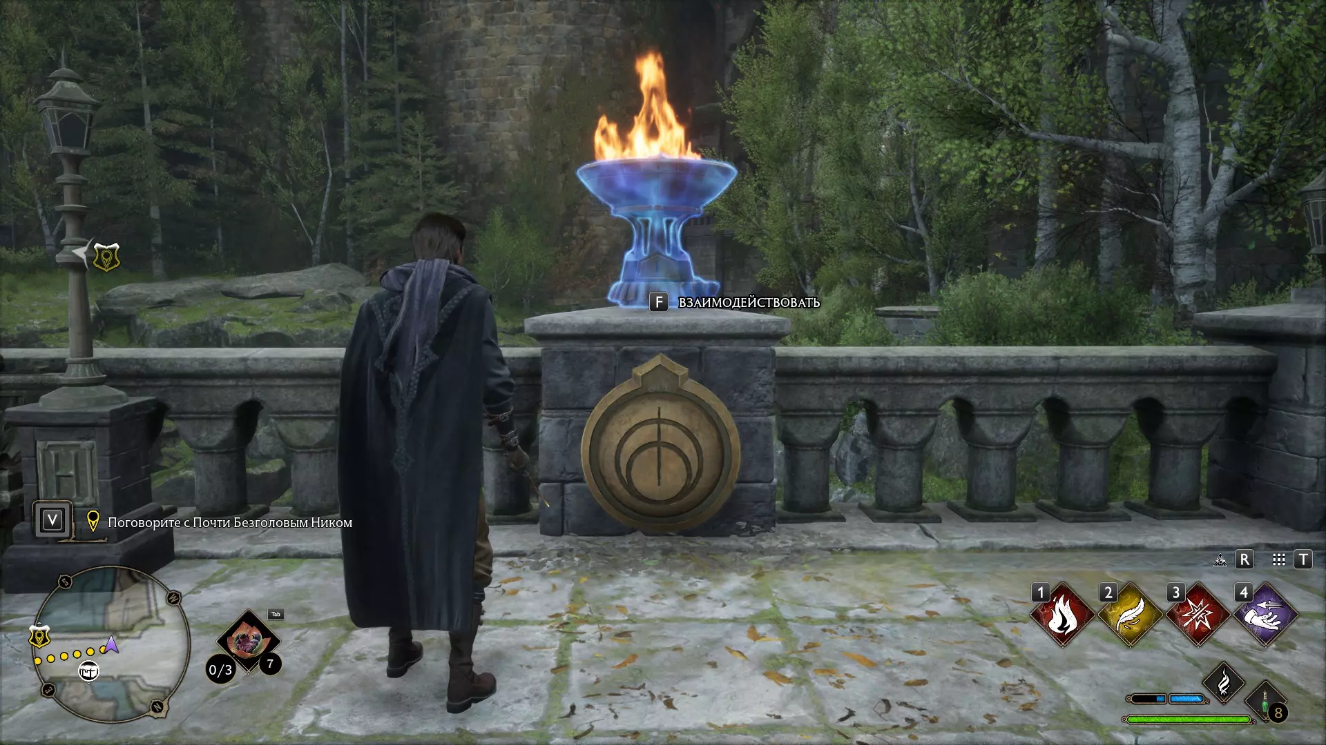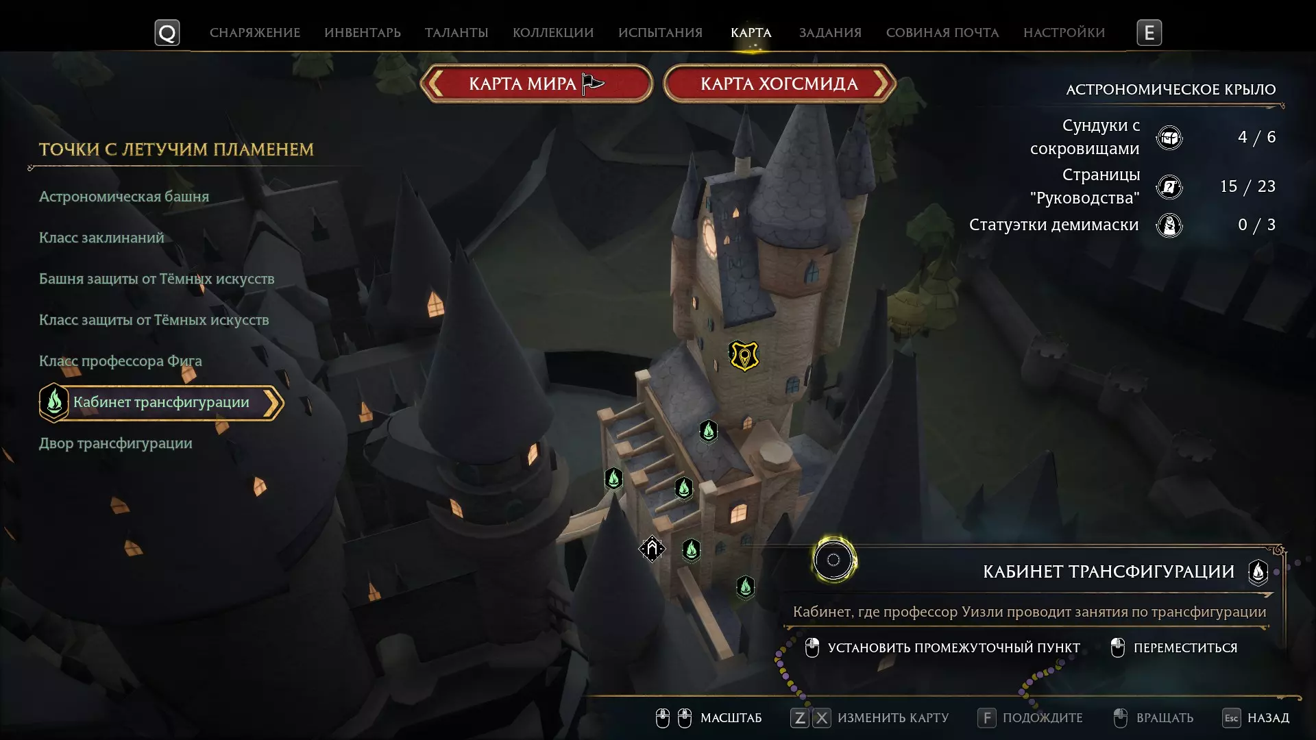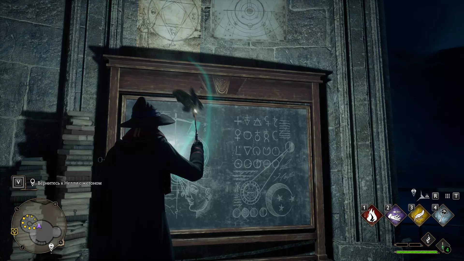 有一个谜题很显眼,但我一直没去管它——就是那个铃铛谜题。 如果有人已经在任务中打开了楼上的门,那就可以跳过这个,因为铃铛只用来开门! 但如果是在探索时偶然发现的,那你就得费点功夫了。好,我们开始。首先,理想情况下,你需要学会“羽加迪姆 勒维奥萨”这个咒语。也可以组合使用“悬浮咒(Levioso)”和“飞来咒(Accio)”,不过当时实在懒得麻烦。总之,需要用这些咒语把两个铃铛放到指定位置。 要到达那里,需要传送到钟楼的侧翼,然后爬到顶部。