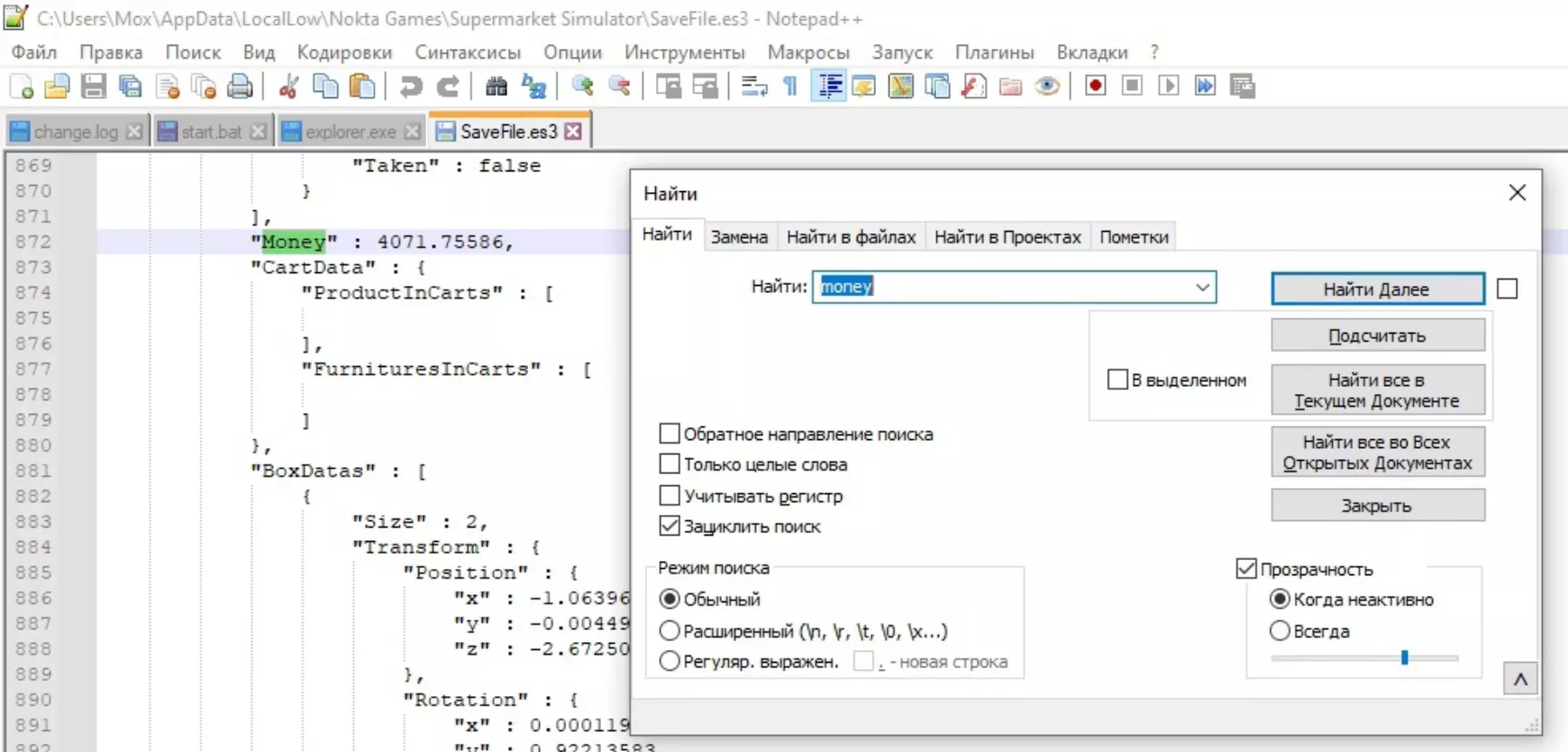 注意!请先进行备份!感谢您的关注。 金钱 打开上述文件,使用快捷键Ctrl+F搜索“money”,然后将我们的金钱数值(在我的例子中是4071及小数部分)更改为我们急需的数值;) (建议使用记事本或notepad++打开文件)