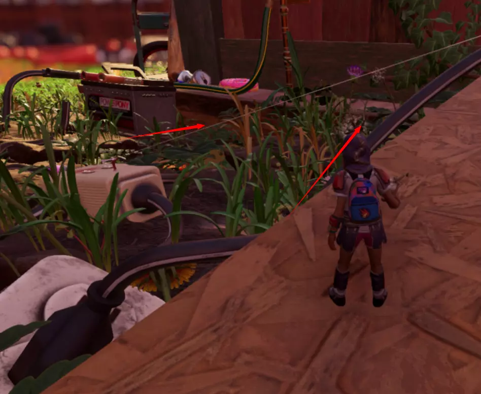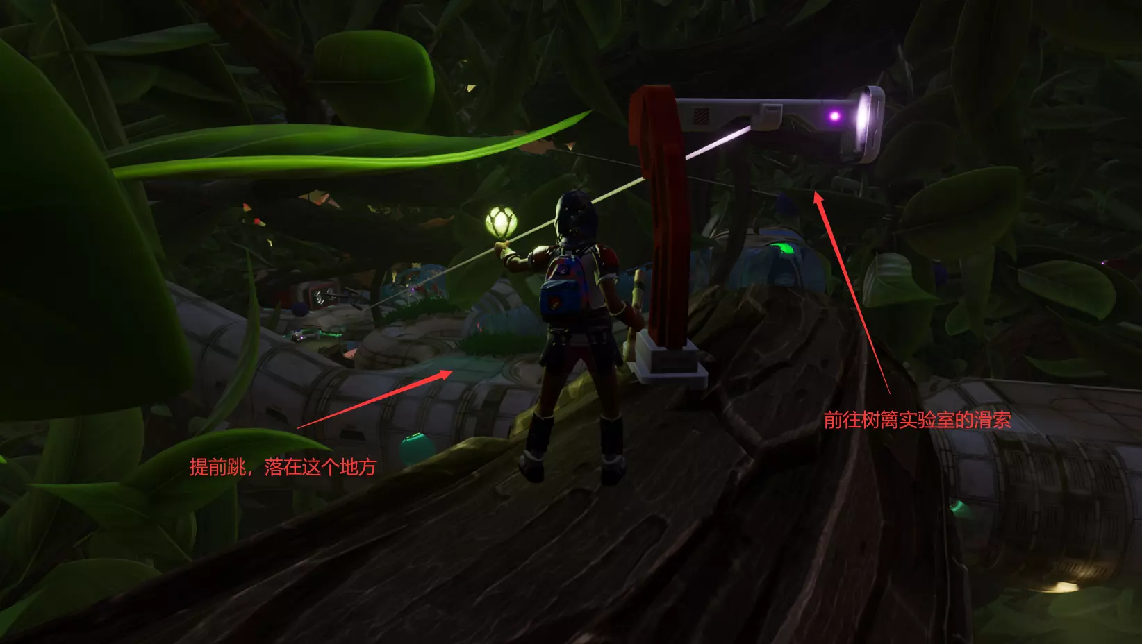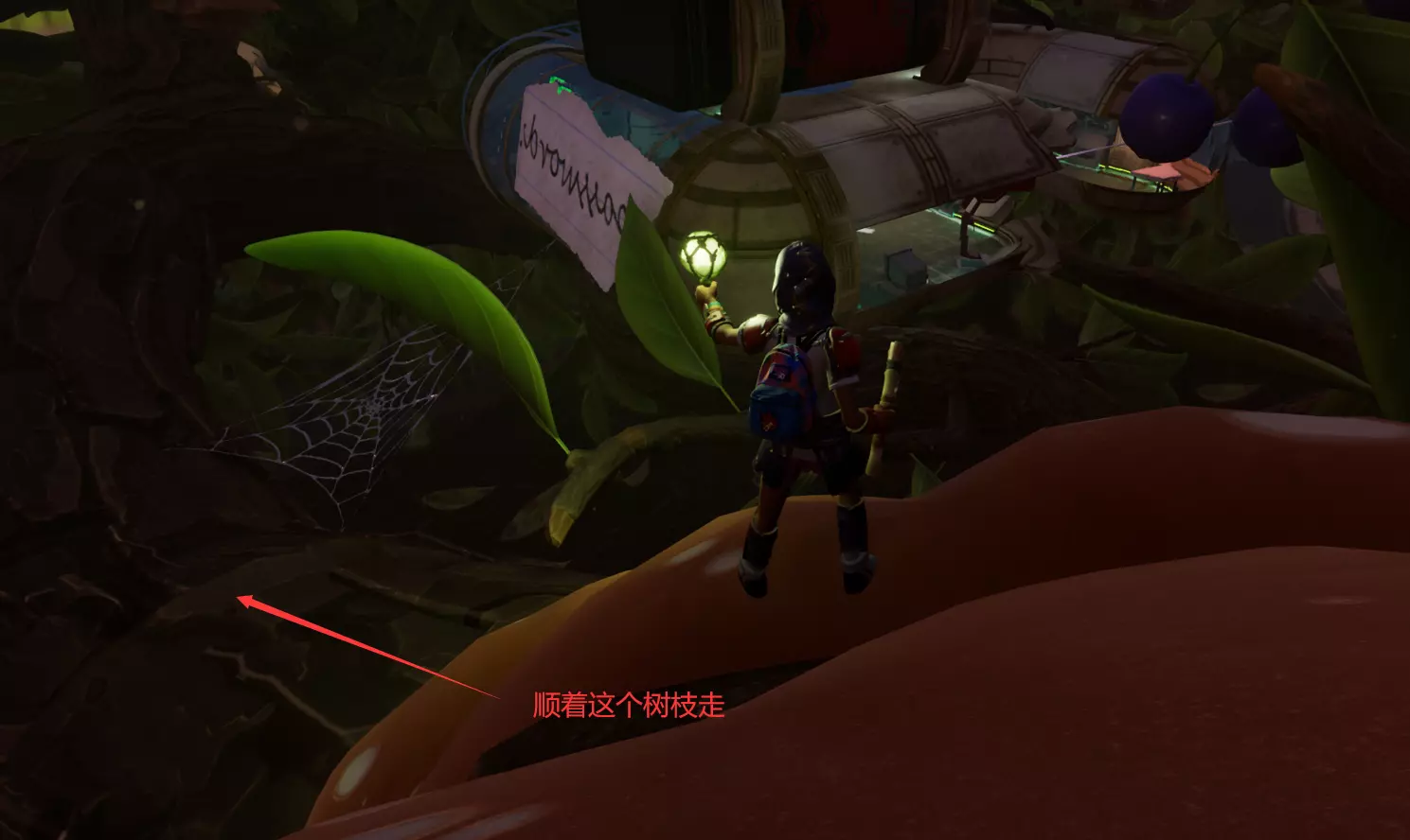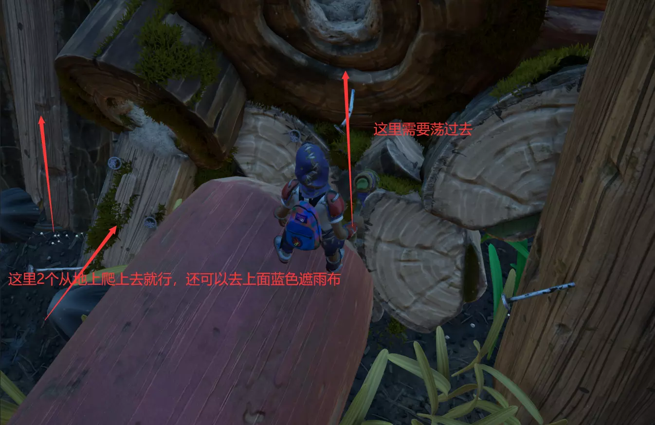最右边的野外科学站在上方的墙壁缝隙里,或许可以沿着藤蔓跳到独轮车把手上过去,我们选择了搭过去