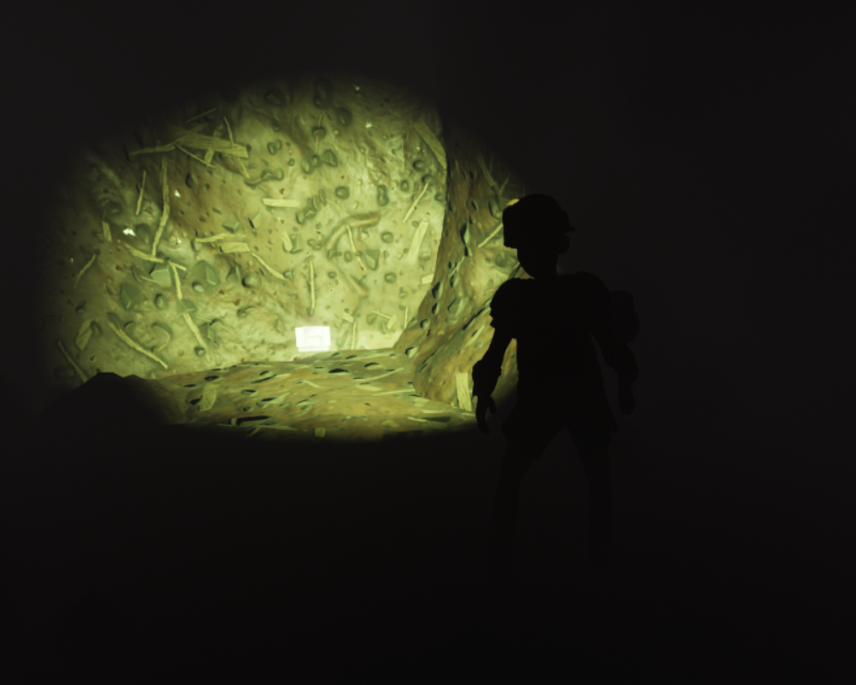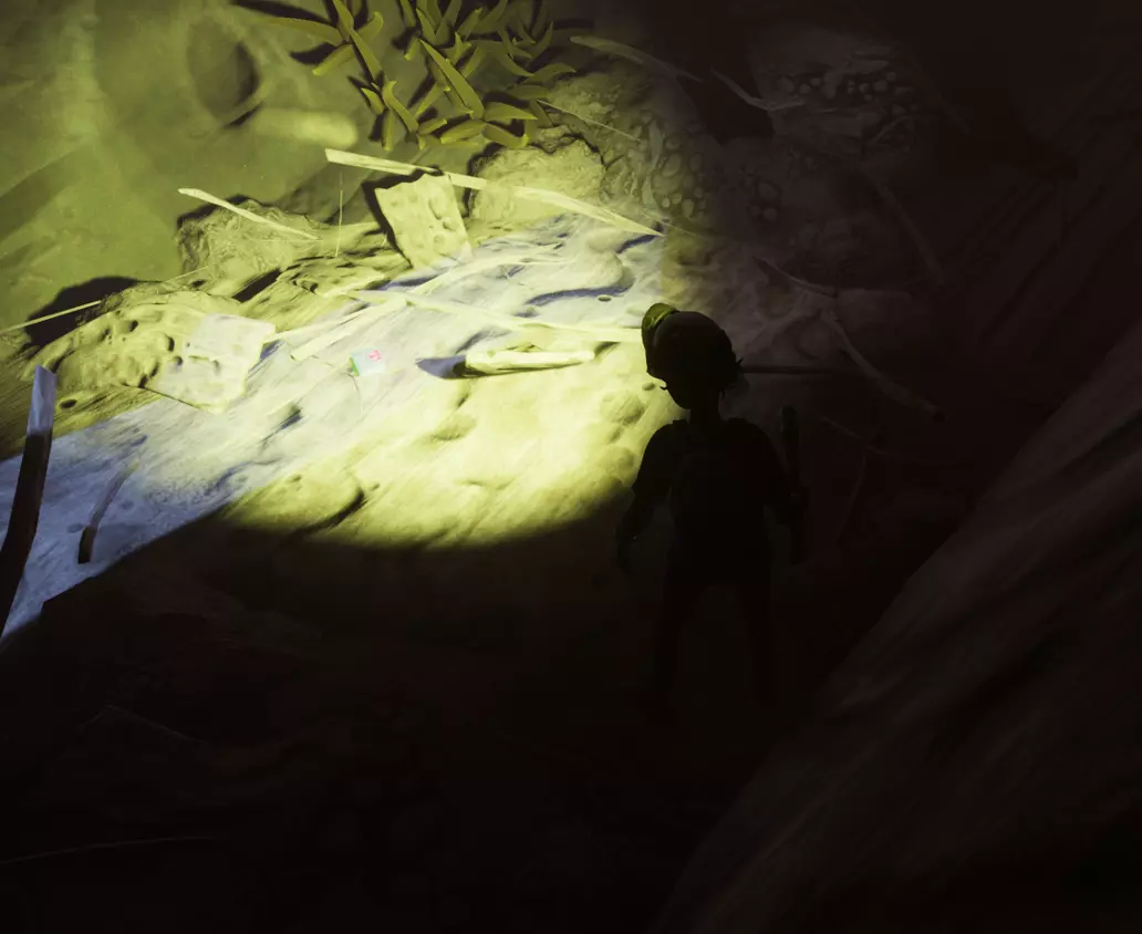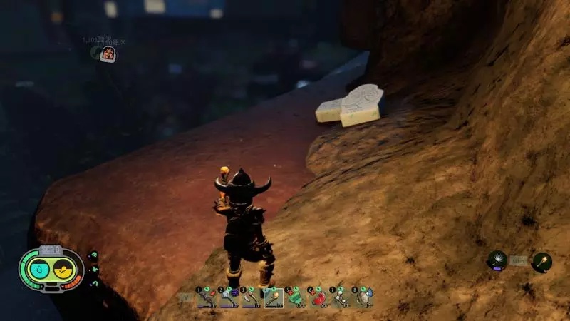 往里走,向左拐,看到一块石头先不要打掉(洞里还有很多白蚁)。踩着石头跳上去可以找到金牙,并且在披棚前面有一本笔记【棘手的情况】。如果不小心把石头打掉了也没关系,右侧有一条可以用炸弹炸开的路,顺着这条路走,从洞往下跳也能到达平台(还可以获得科学点数)。 树篱区的这个位置,石头墙壁处有一个入口,里面有【侦察日记:实习生】和蚂蚁图腾配方。