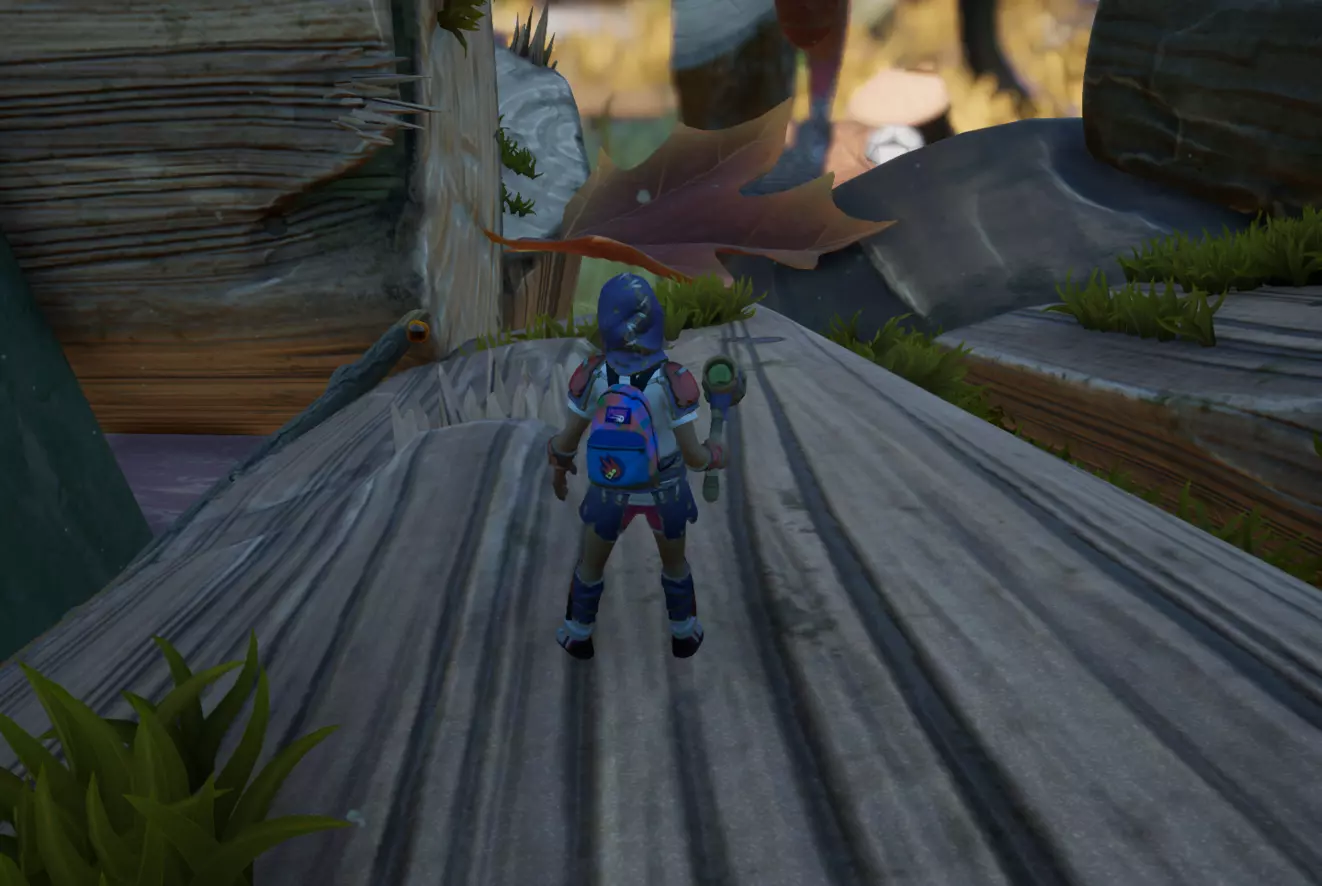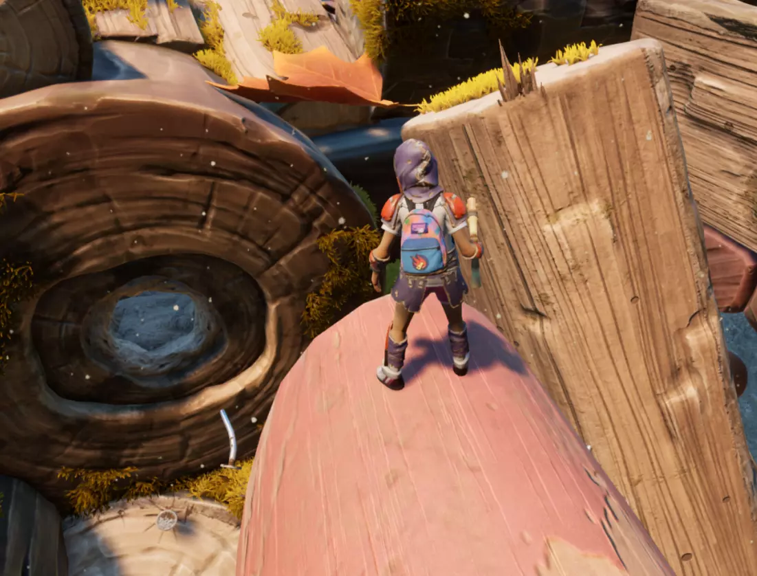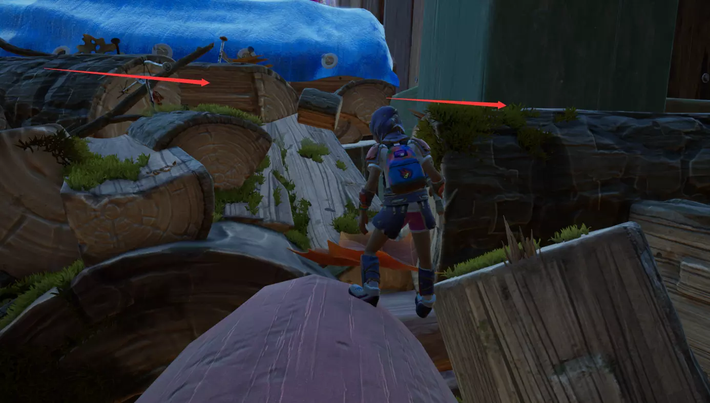 顺着这块木头上去,可以看到一把正在劈砍木头的斧子。爬到斧子上后,沿着斧柄往前走。