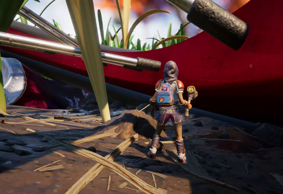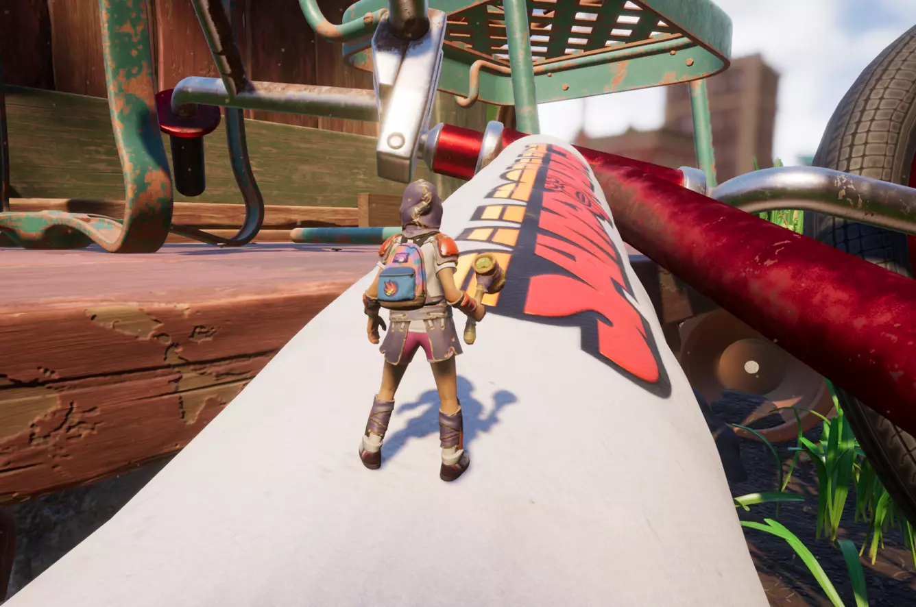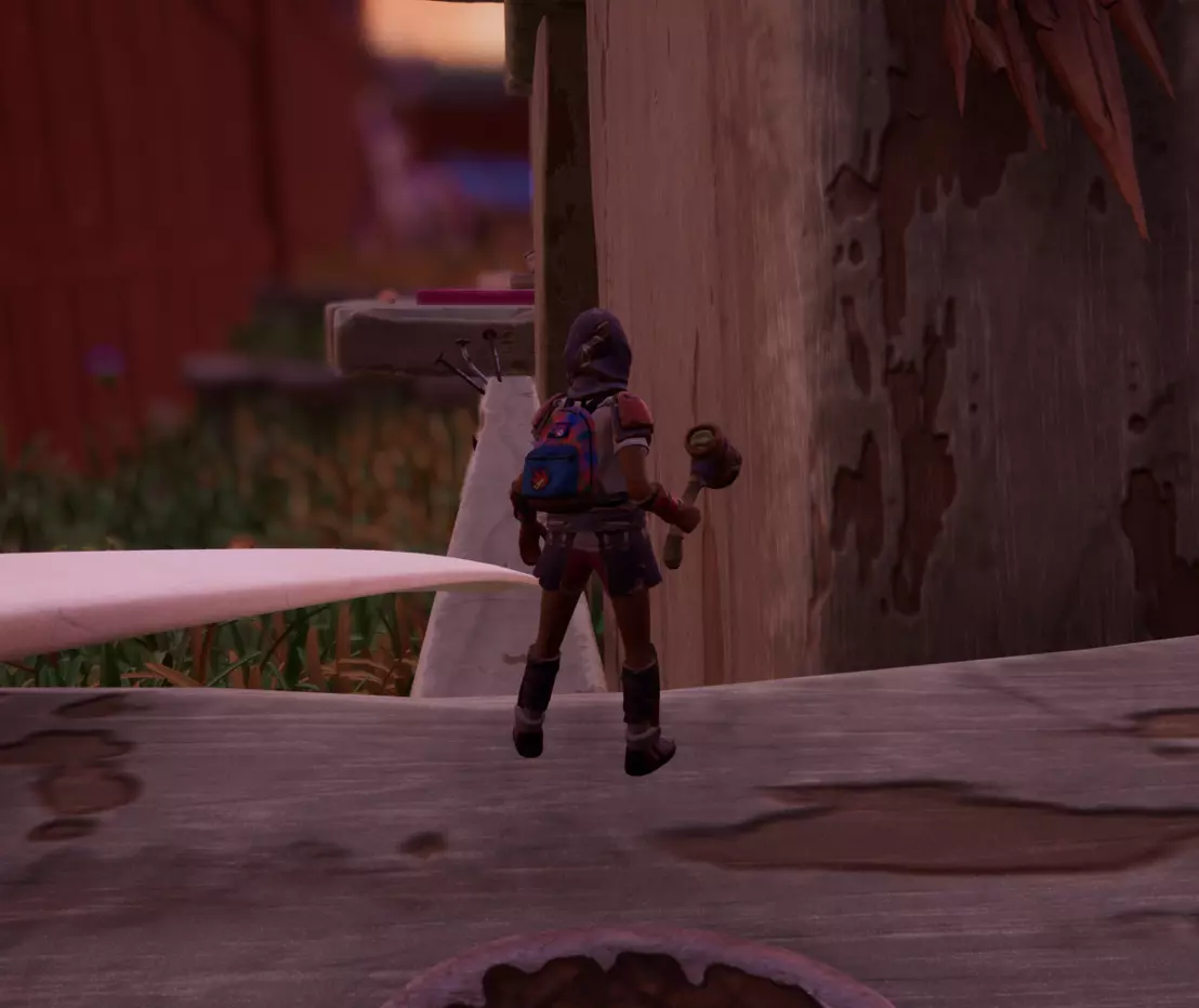 顺着这块木头上去,可以看到一把正在劈砍木头的斧子。爬到斧子上后,沿着斧柄往前走。