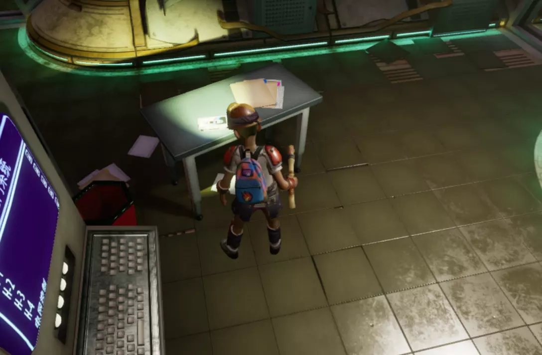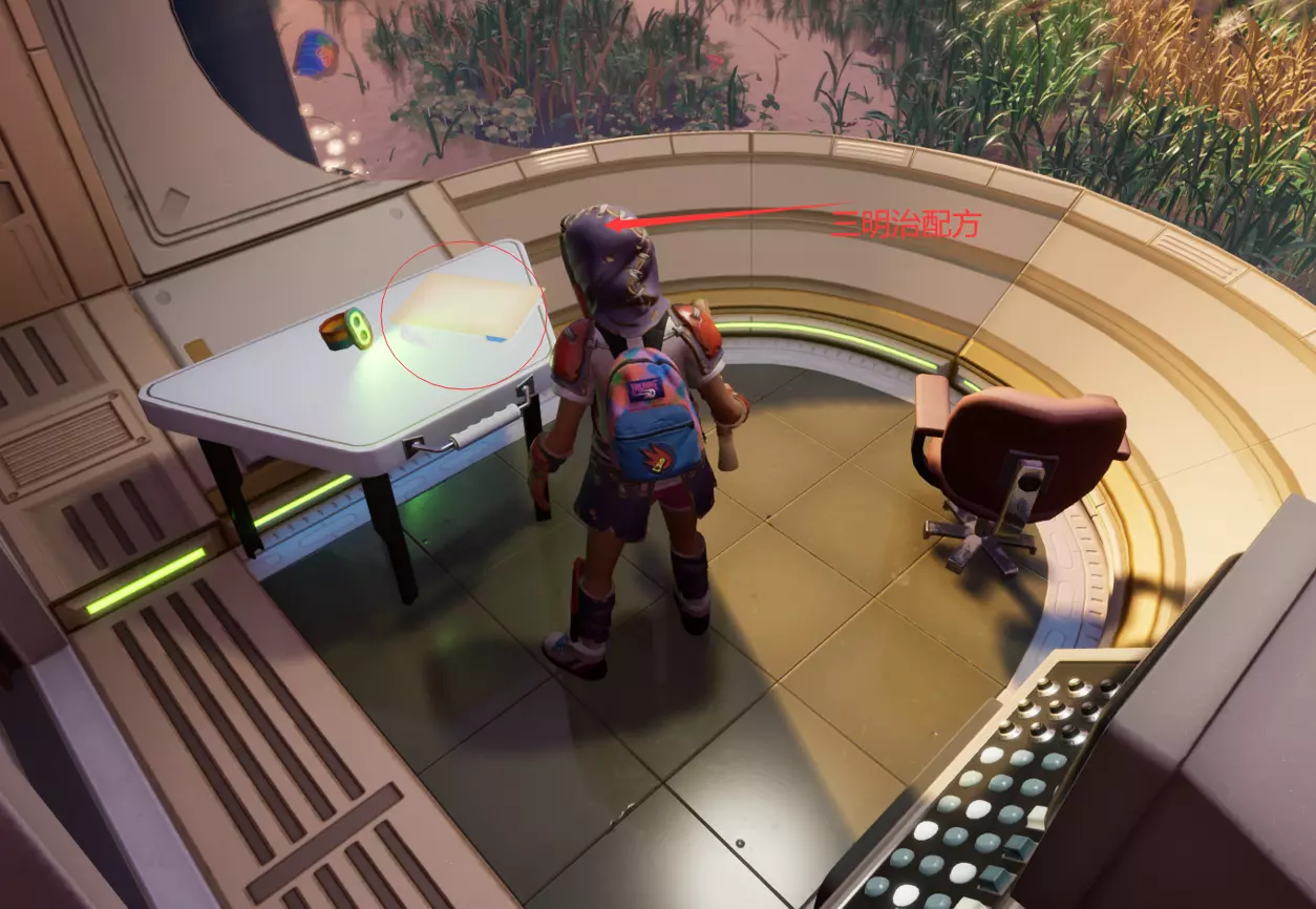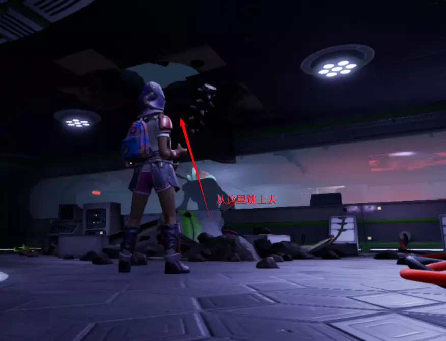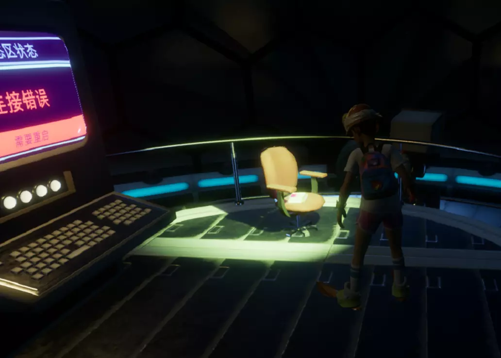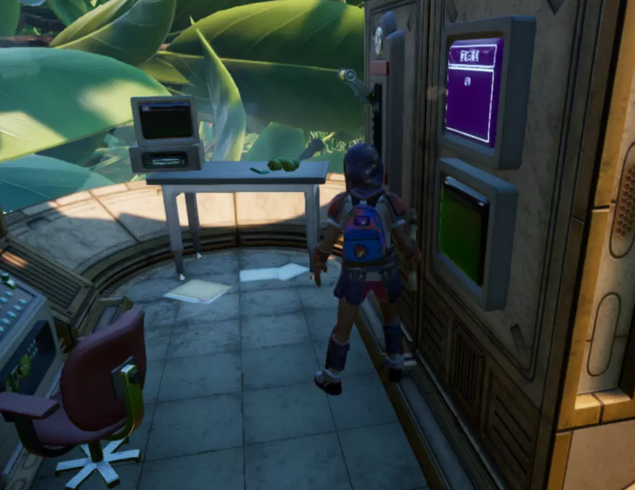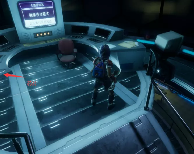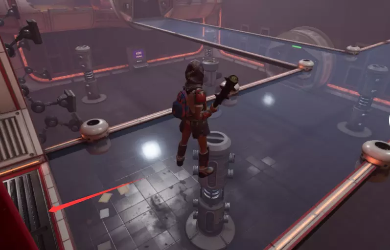 从这个位置跳下去,转过身看向墙的另一边,会看到一个小舱口,靠近它门就会打开。 进入后开门往里走,有一个开关,触摸开关后,树桩实验室的门就会开启。 在地图右上角找到缺失的汉堡小哥芯片的位置,到达后寻找这样的一个实验室。