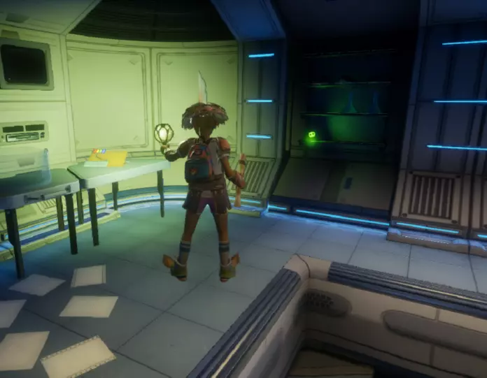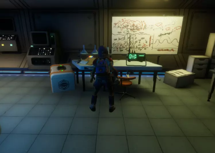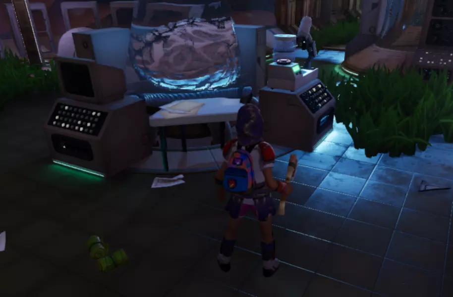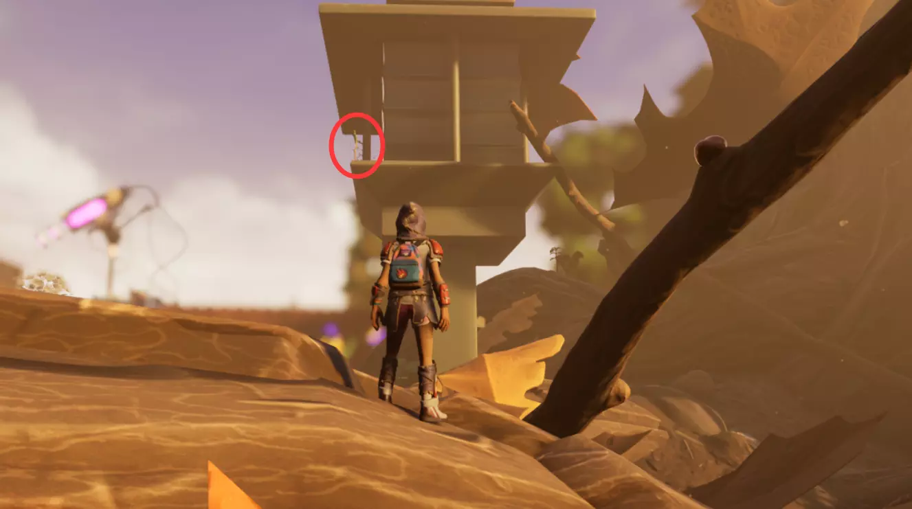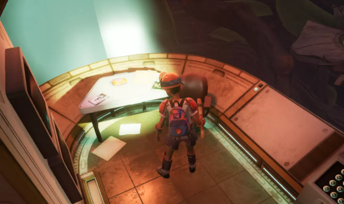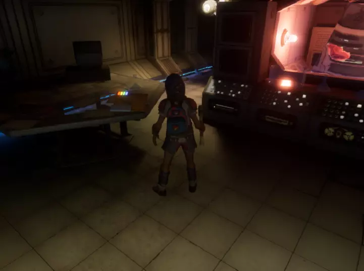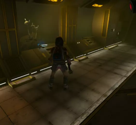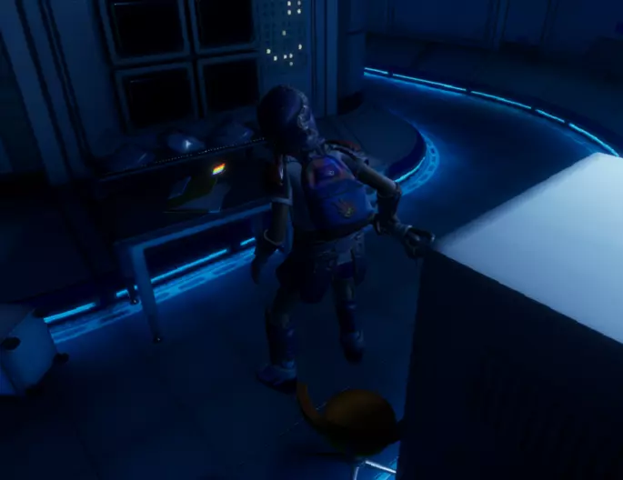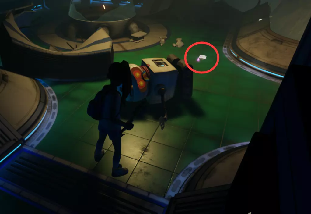 从这个位置跳下去,转过身看向墙的另一边,会看到一个小舱口,靠近它门就会打开。 进入后开门往里走,有一个开关,触摸开关后,树桩实验室的门就会开启。 在地图右上角找到缺失的汉堡小哥芯片的位置,到达后寻找这样的一个实验室。