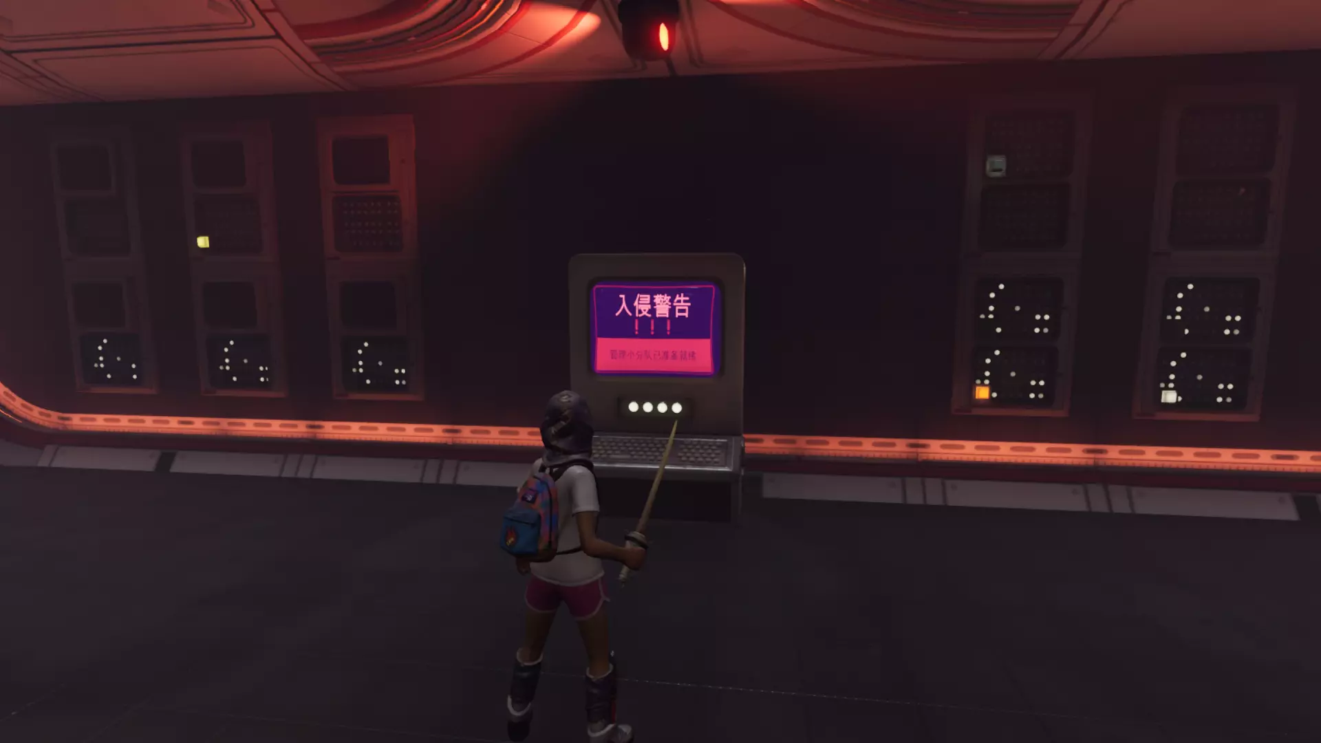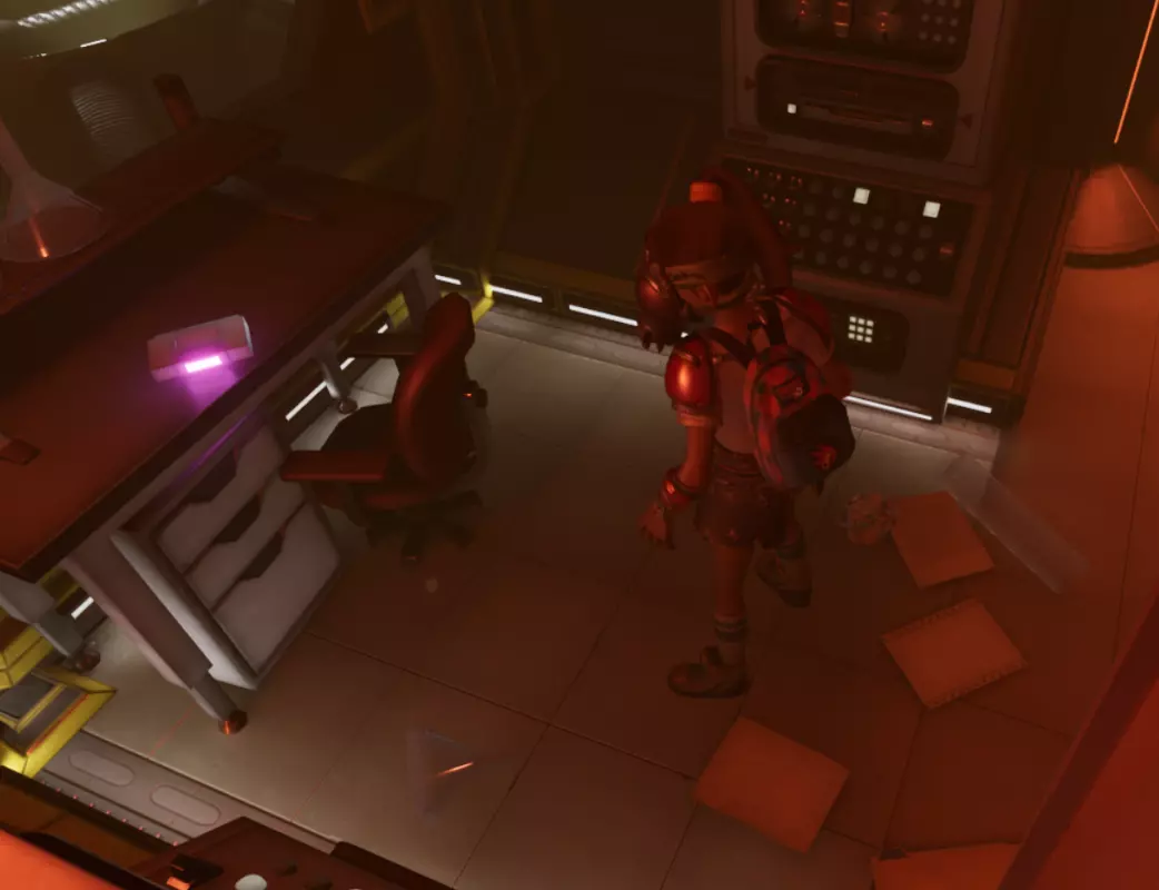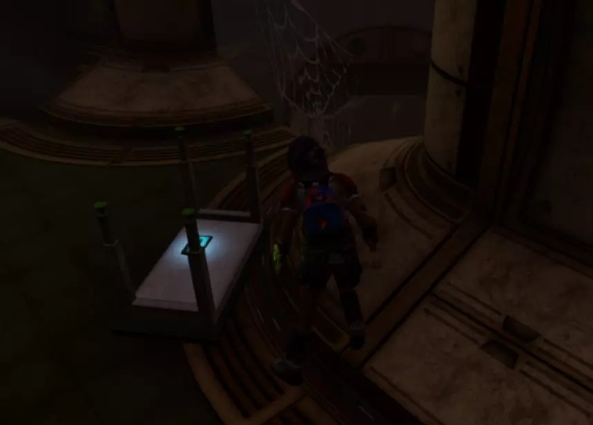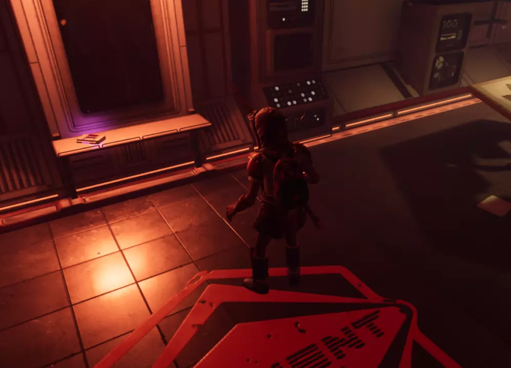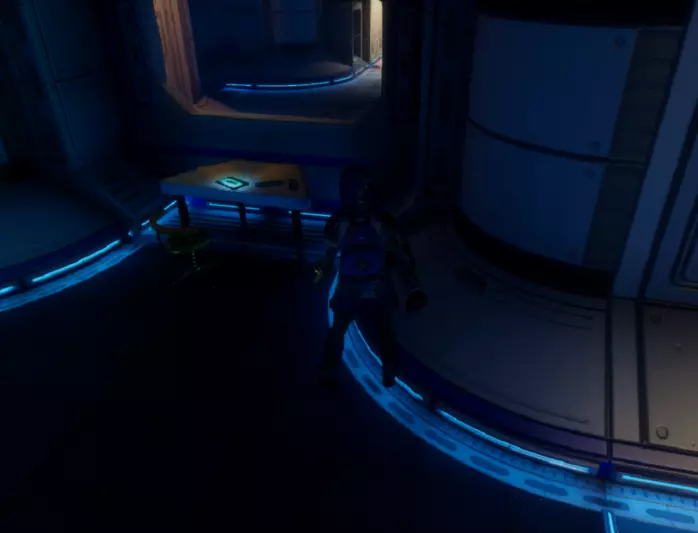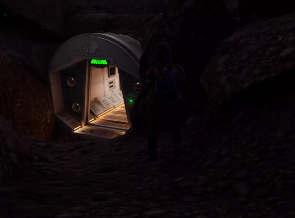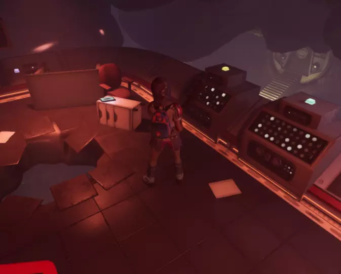 从这个位置跳下去,转过身看向墙的另一边,会看到一个小舱口,靠近它门就会打开。 进入后开门往里走,有一个开关,触摸开关后,树桩实验室的门就会开启。 在地图右上角找到缺失的汉堡小哥芯片的位置,到达后寻找这样的一个实验室。