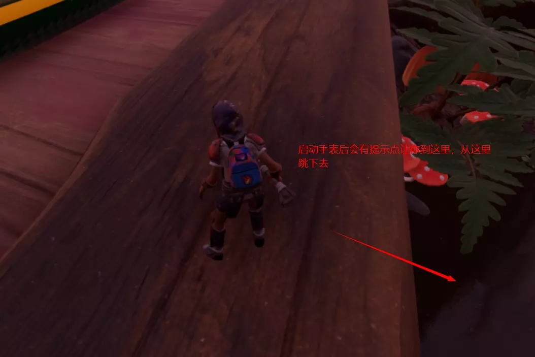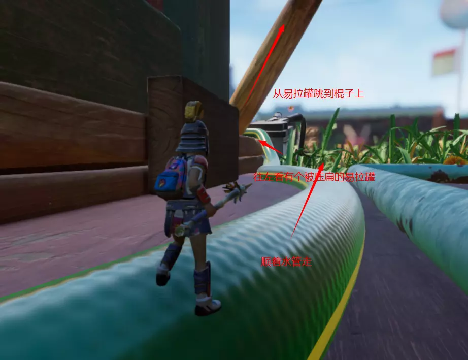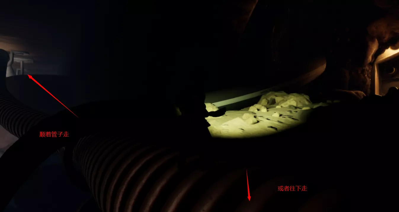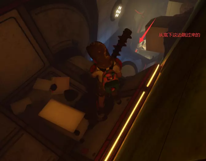 然后贴着右边走,上面是白色的管子,跟着管子走到这个位置,跳下去受虎蚊攻击的可能性会小,路也更短一些
