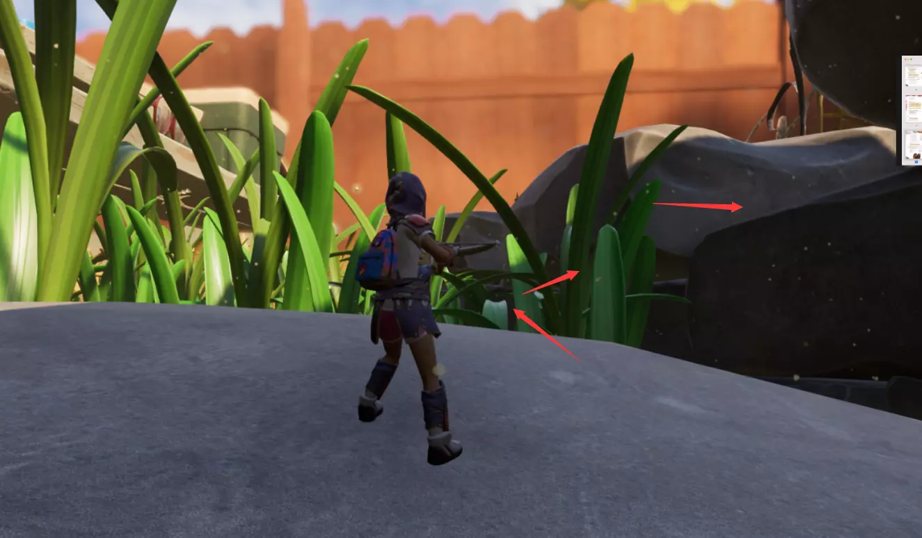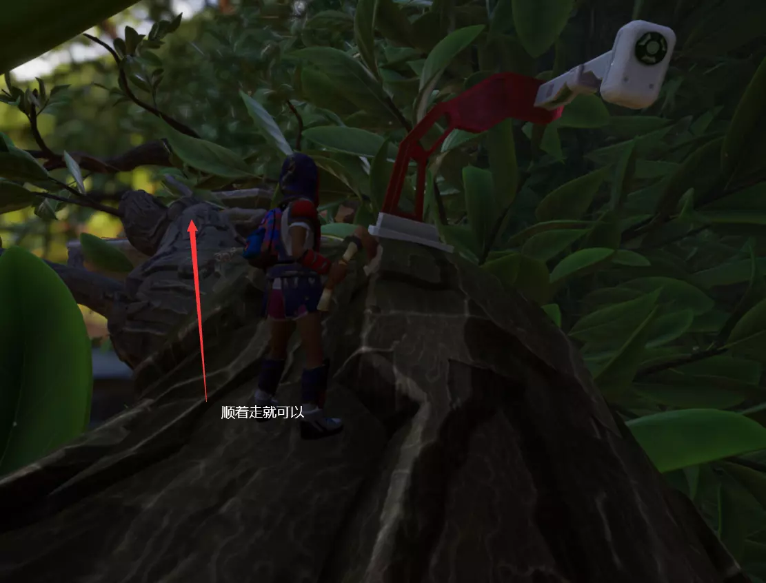 我们先上到图中的这个石头台子上,因为最后需要到桌子上,顺着石头走就行。