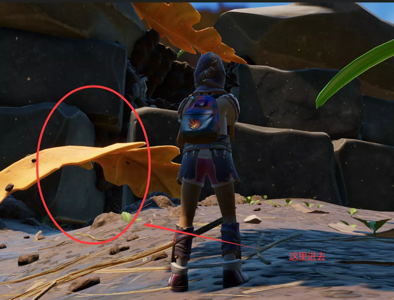 然后走到叶子的尖端跳下去,往下潜到较浅的位置,在石头夹缝处有一个小小的三角形洞口,一直往里游就能找到。