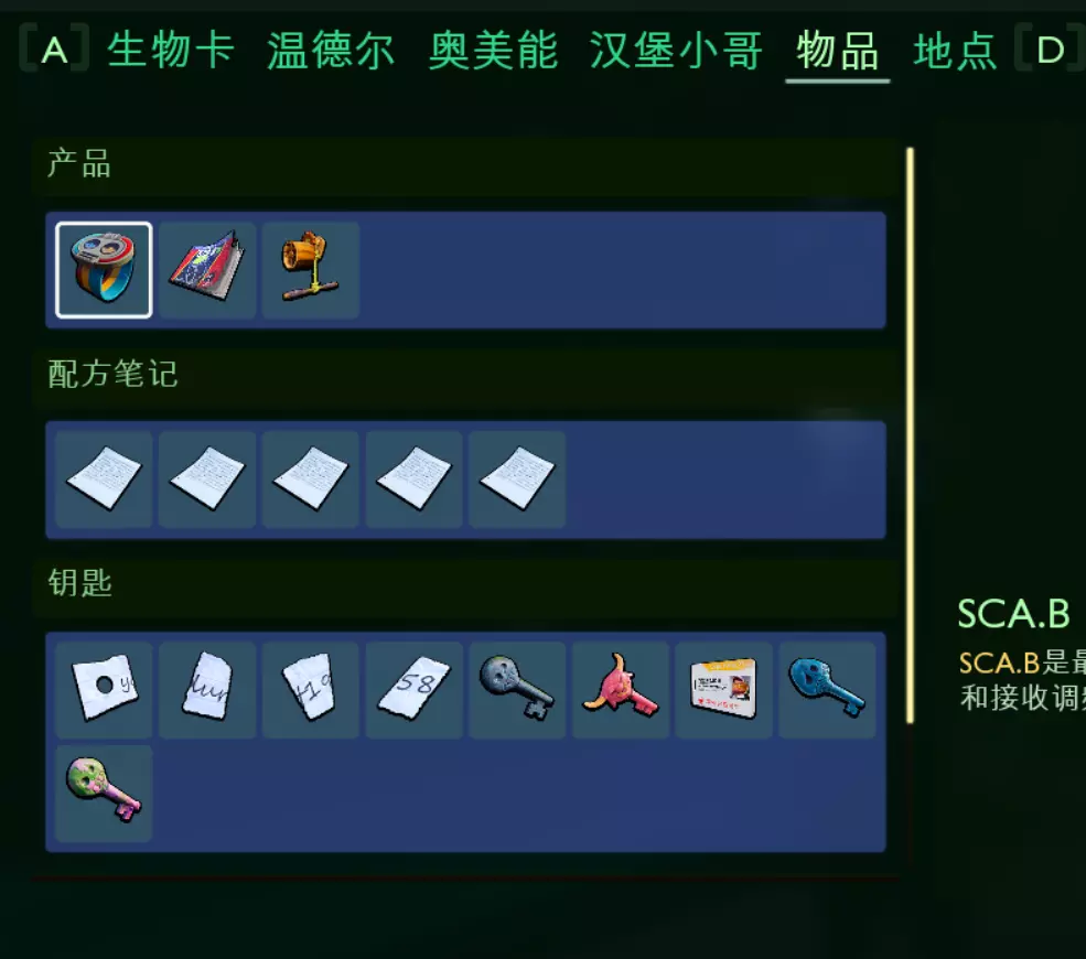 关于成就获取及简易攻略 这份攻略终于完成了。期间遇到了无数bug和成就无法解锁的情况,不得不多次开启新存档,攻略内容也是反复修改,如今终于告一段落,我也松了一口气。这份攻略耗费了我大量心血和时间,若能对喜欢收集成就的玩家有所帮助,我便心满意足了。 补充内容: 1. 物品全收集方面,雾霭区的【大脑时间】和【焦土协议】(第三和第五个文件)拿起后在资料中不显示的bug现已修复,需要回到实验室重新获取。 2. 冰箱的配方位置已调整至实验室入口处显眼位置,但目前存在无法看见的bug。请注意!由于本人表达能力有限,此指南中包含大量图片! 我在B站看到了有人分享记载了所有【sca.b】和【乳牙】位置的网站,比我在这里截图更直观。