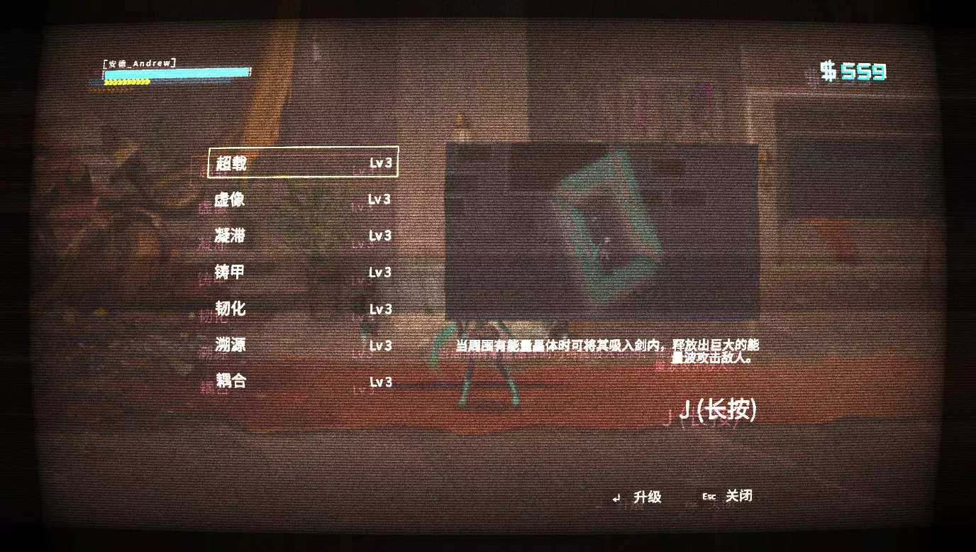 看到这几个技能了吗?没错就是这几个。 这几个技能都很实用。【虚像】【溯源】有独立按键,【溯源】【超载】伤害高,【虚像】是范围攻击。【铸甲】【韧化】和【耦合】属于被动技能,对于不熟悉操作的新手能很大程度提高容错率。而【凝滞】可以和一个技能配合,就是第一部分所说到的【激发】了。(不得不说太实用了)如果你用【wj】把敌人挑空但是又有另外一波攻击朝你冲来,最好的方法就是【sj】而不是自由落体(笑)。不要说用冲刺,在冲刺限制次数之后,这东西太宝贵了,宝贵到只用于撞闪反。 其余的就是看哪些操作单一升哪些了。对于不习惯记技能表的人(比如我),除了几个常用的基本其他技能都是撞出来的。《艾希》这个游戏其实不需要太多花里胡哨的操作,掌握好攻击规律就能水到渠成,所以除了上面提到的技能其他都没什么用了。(主要原因还是在施展技能时不能中断,就很容易被破甲,在这个游戏里甲太重要了,因为它意味着减伤和霸体。) 4.关于金钱 金钱有些时候真的很头疼,因为它意味着技能的等级。 幸好有宝箱! 以个人观点,效率最快的就是地铁传送口后的两个宝箱,打完一波并不强的怪之后就可以开始收割。 一个在这: