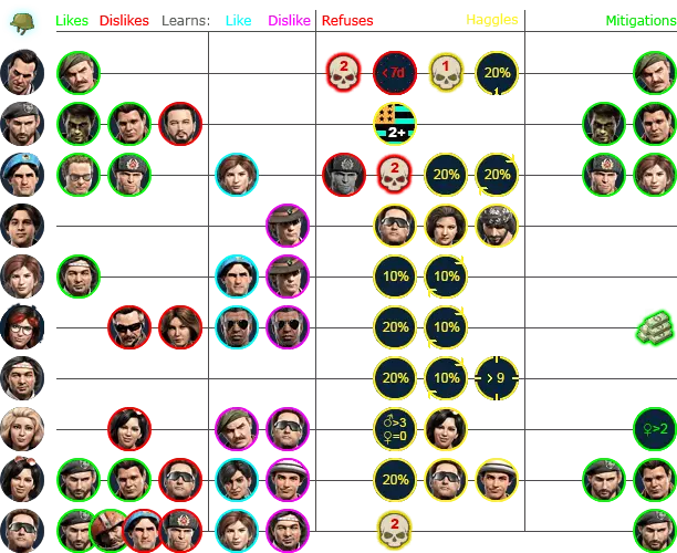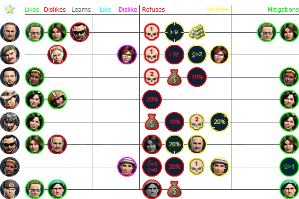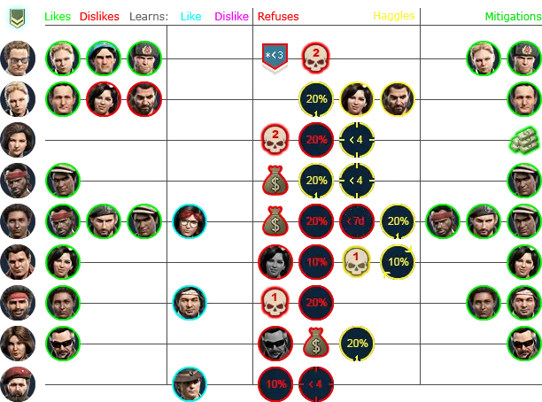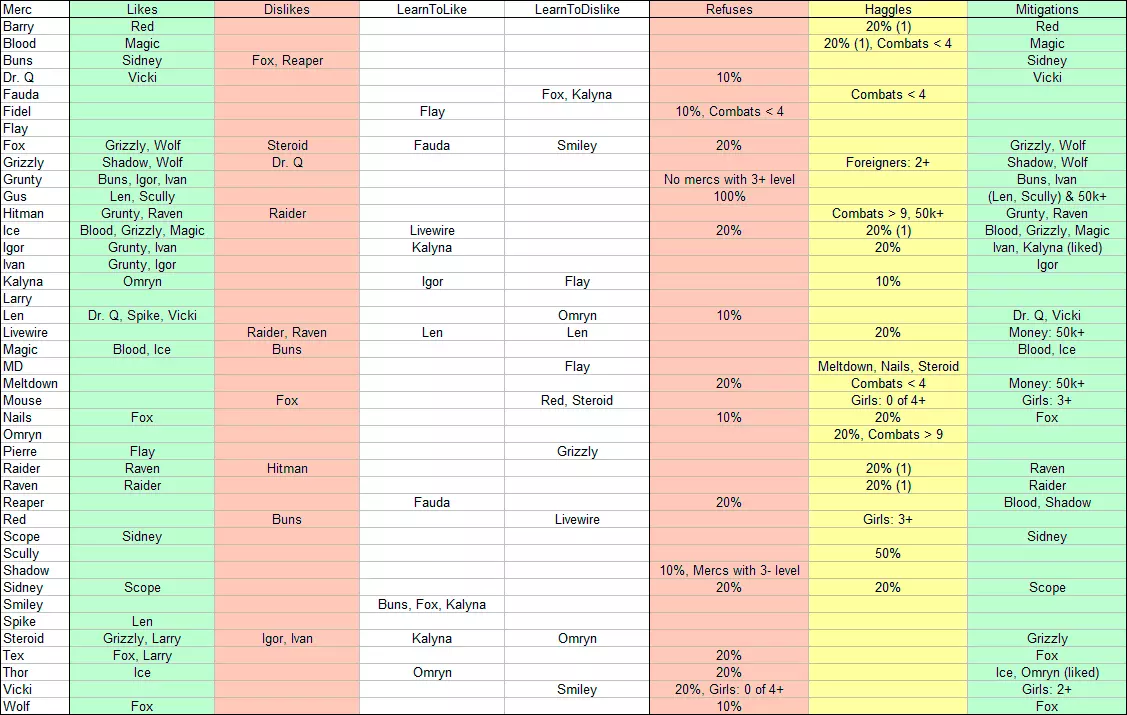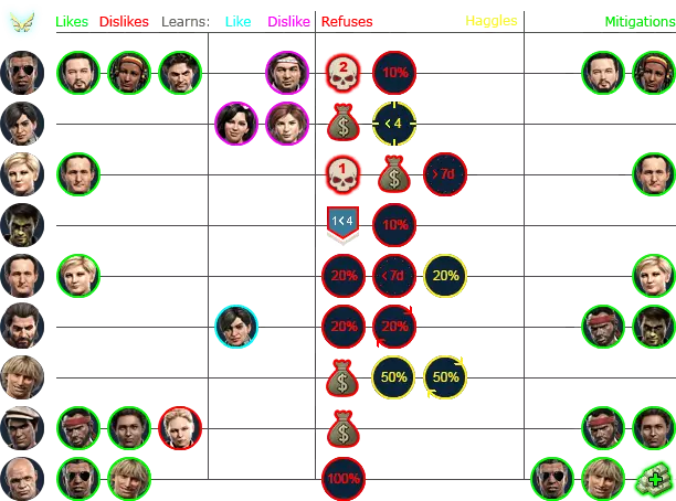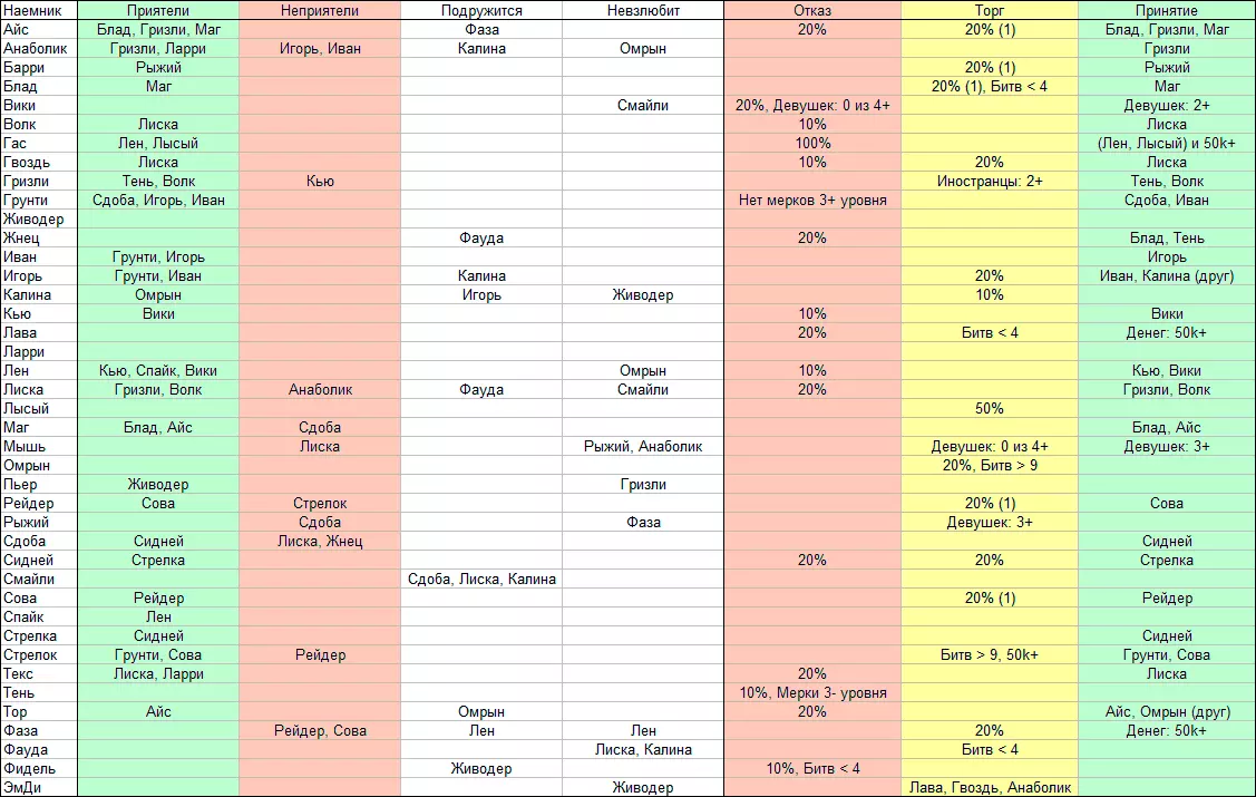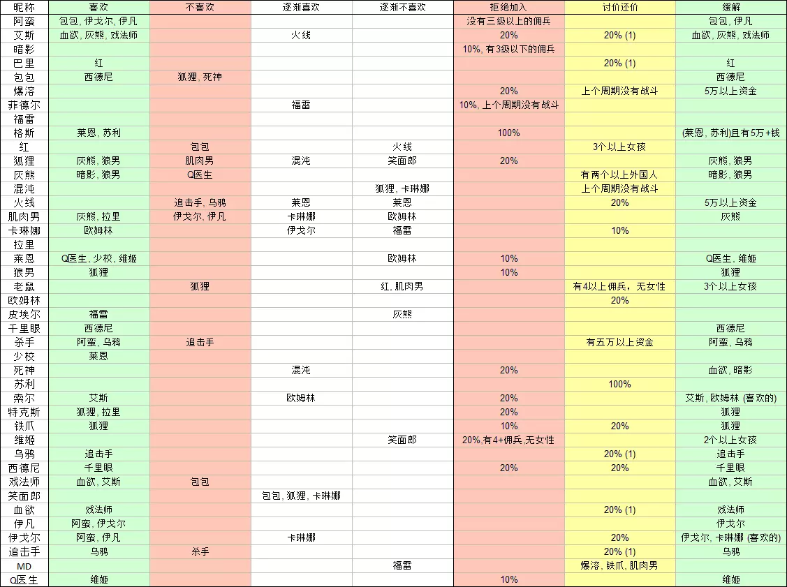 雇佣兵朋友敌人结交厌恶拒绝交易接受冰布拉德、灰熊、魔术师阶段20%20%(1)布拉德、灰熊、魔术师合成代谢灰熊、拉里伊戈尔、伊万卡林娜奥姆林灰熊巴里红毛20%(1)红毛布拉德魔术师20%(1),战斗<4魔术师维基笑脸20%,女孩:0/4+女孩:2+狼狐狸10%狐狸加斯伦、光头100%(伦、光头)和50k+钉子狐狸10%20%狐狸灰熊影子、狼邱外国人:2+影子、狼格伦蒂面包、伊戈尔、伊万无3+级汞面包、伊万暴君收割者福阿德20%布拉德无法识别或无法翻译,已删除。无法识别或无法翻译,已删除。莉娜。这可能是一个漏洞,也可能是独特的行为表现。 从LUA文件中提取的所有数据。当心剧透! 团队中有喜欢的人可以提高士气,而与讨厌的人在一起则会降低士气。