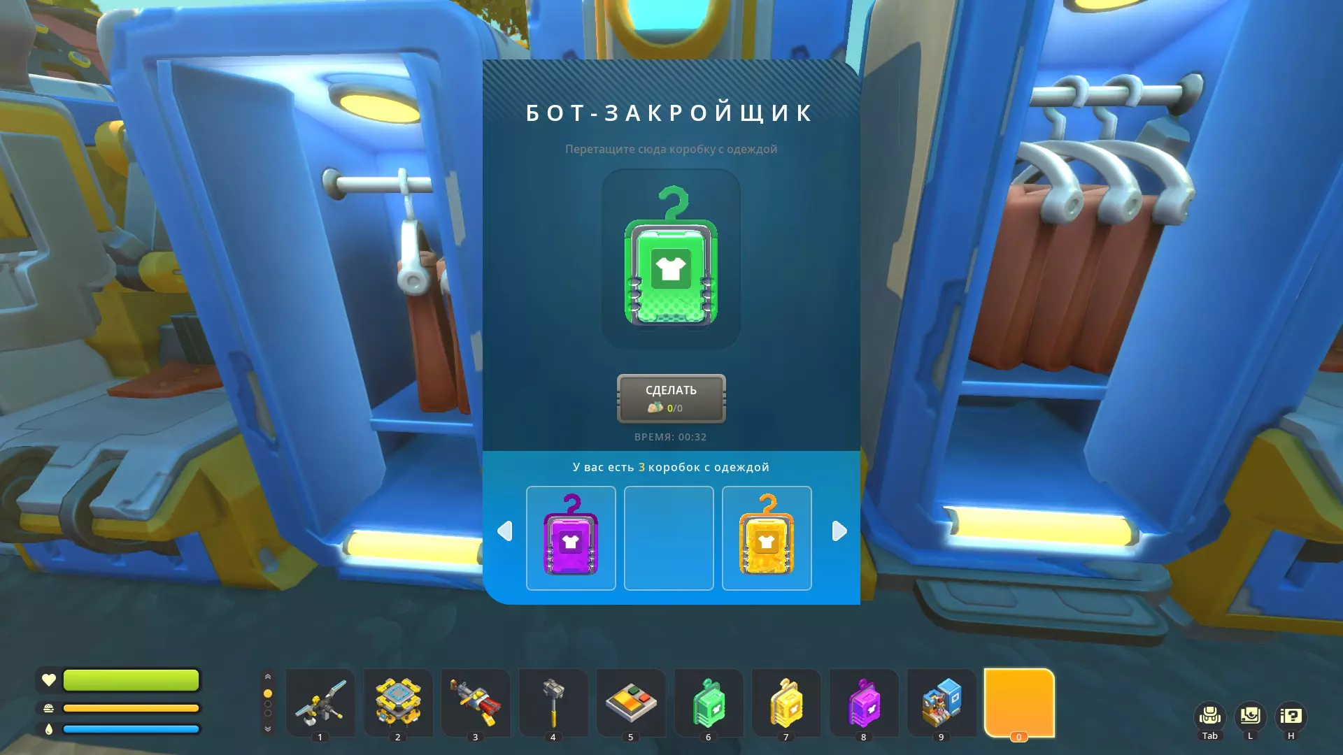 第三步 5. 生成后,放置一些着装机器人 6. 拿取每种服装盒(共3种) 7. 将服装盒放入着装机器人中 8. 开始拆盒!当你解锁某个服装箱中的所有服装后,开箱按钮会变为灰色(而非蓝色),如下所示: