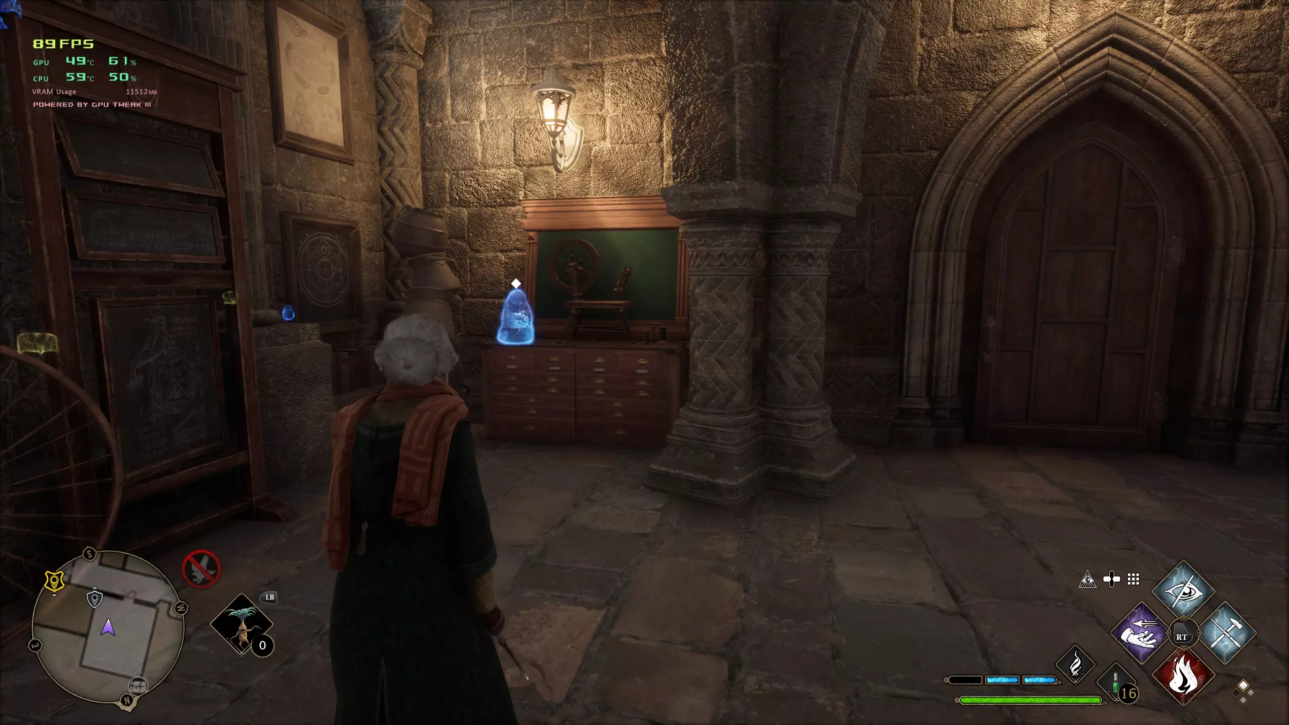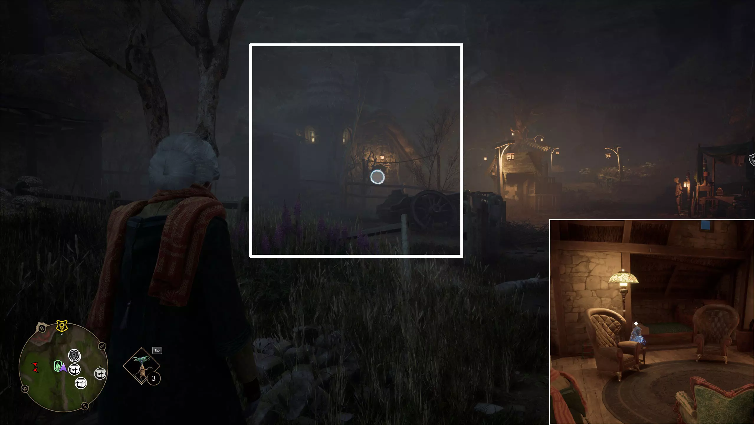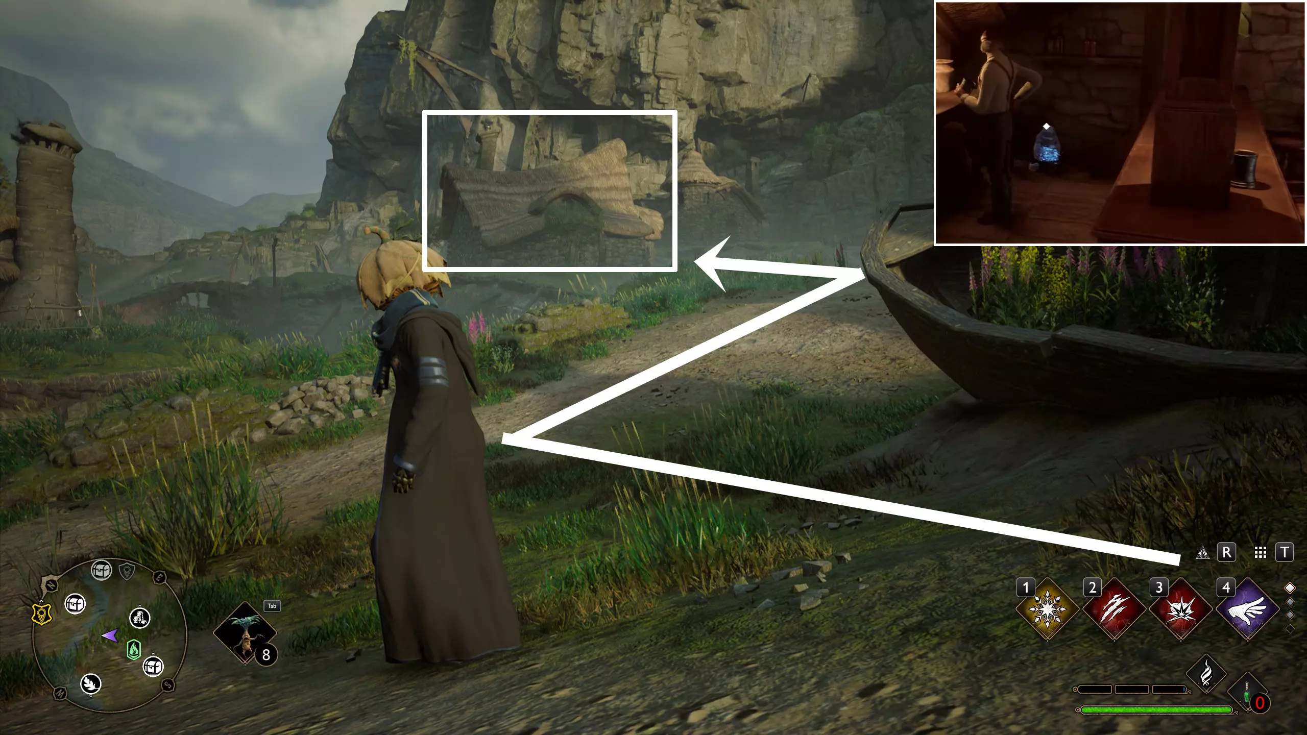 21.霍格沃茨谷地,上霍米格村飞路之焰往前走,左侧有一个门旁放着车轮的建筑,开锁,进门凳子上