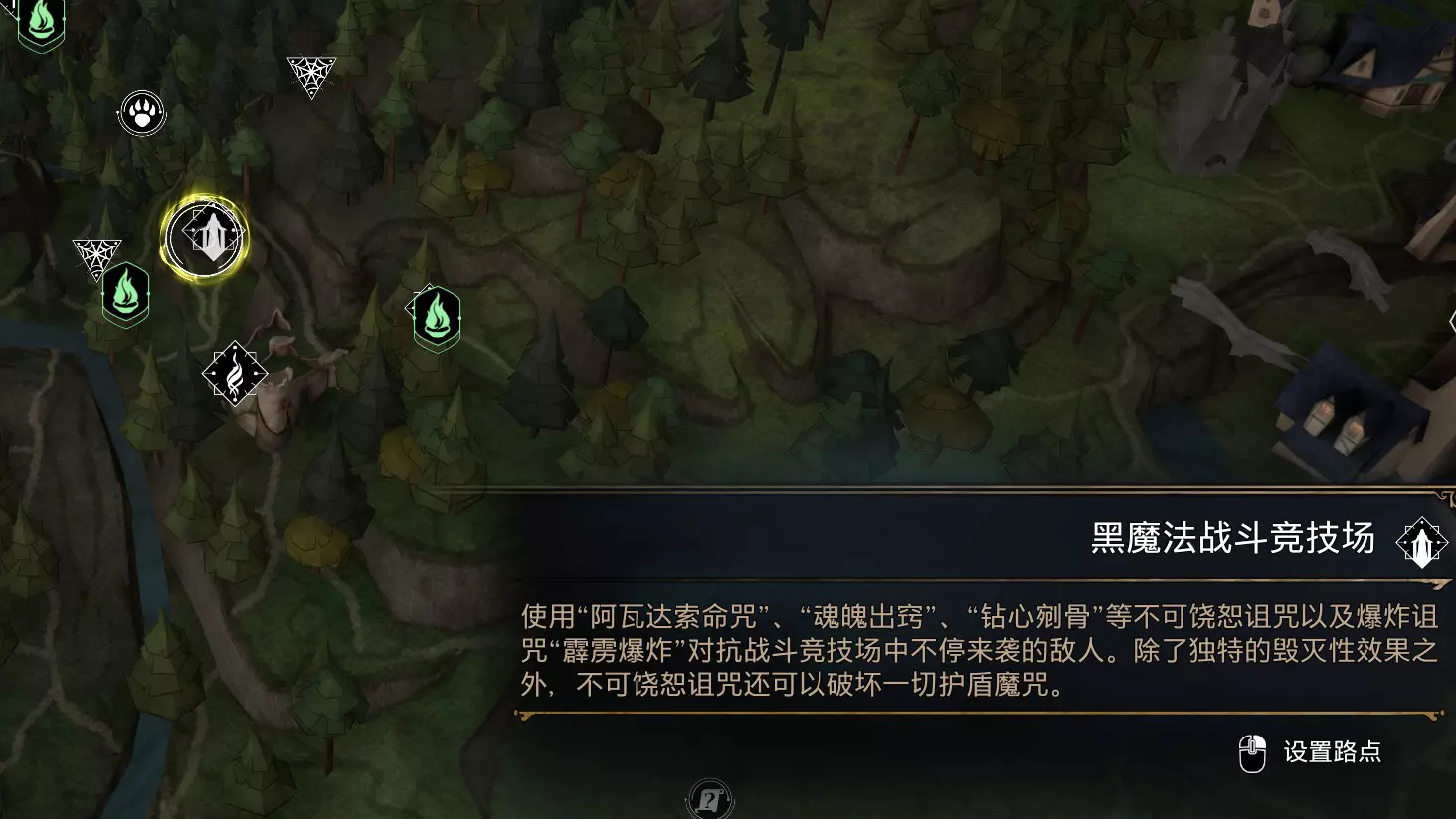 开启战斗竞技场需要摧毁散落在战斗竞技场区域的所有20个瓶子。使用原形立线能够将这些瓶子用蓝色高亮显示。 之后互动竞技场内的雕像进入竞技场,击溃5波敌人即可完成该处竞技场,如果觉得太难,可以立即在设置内调至故事难度。 死亡后会从第1波重新开始,而且好像有bug不重置道具,所以建议进入竞技场前囤有足够应付5波敌人的回复药水,竞技场内也可使用雷酿或中国咬人甘蓝等道具,也可以准备一些,一次性完成。 另:黑魔法战斗竞技场是数码豪华版的DLC【黑魔法包】,需要拥有豪华版或单独购买【黑魔法包】。 3.北霍格沃茨——东北霍格沃茨地区飞路之焰