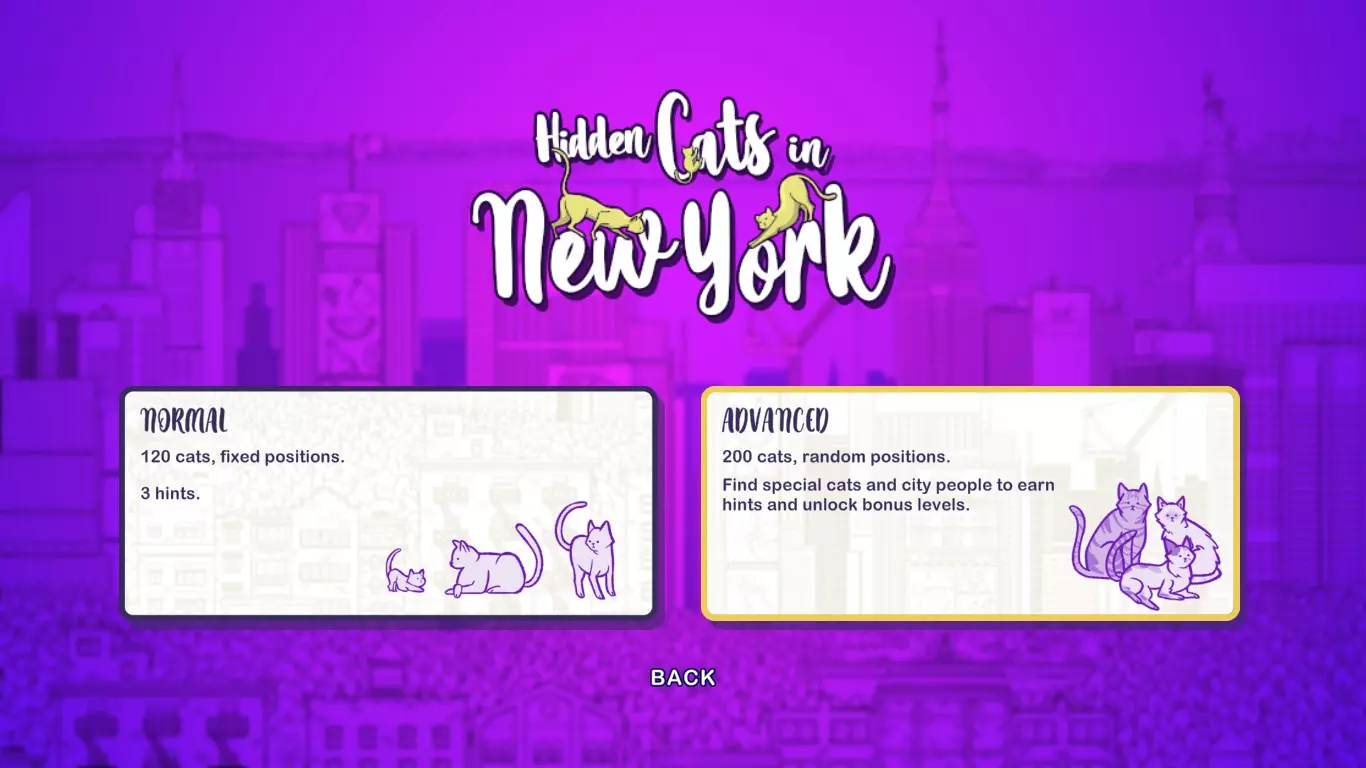 详细的截图会向你展示所有奖励关卡中隐藏猫咪的位置。这将帮助你解锁6个额外的游戏成绩。 解锁奖励关卡 你首先需要游玩纽约高级模式,并找到12只隐藏的特殊猫咪。