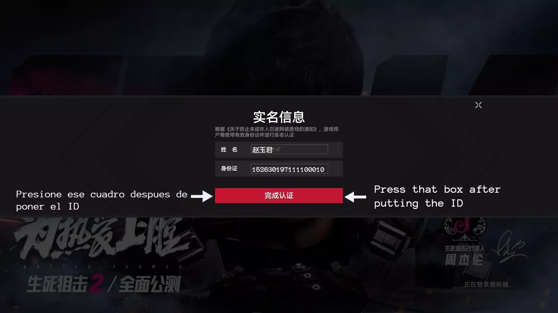 简短教程:如何使用中国身份证登录。所需的所有信息将在我接下来提供的图片和信息中。 简介 许多非中国用户在登录时遇到问题,因为需要中国身份证。这里为你提供解决此问题的方法,让你可以顺利游戏。接下来我会提供一个中国身份证,你可以用它顺利登录。许多非中国地区的用户在登录时遇到需要中国身份证的问题。这里提供解决此问题的方法,以便正常游戏。以下是可用于登录的身份证信息: 在第一个输入框填写:赵玉君 在第一个输入框下方填写:152630197111100010如果您需要帮助,可以参考详细说明登录步骤的图片。无法翻译,已删除。无法识别或无法翻译,已删除。