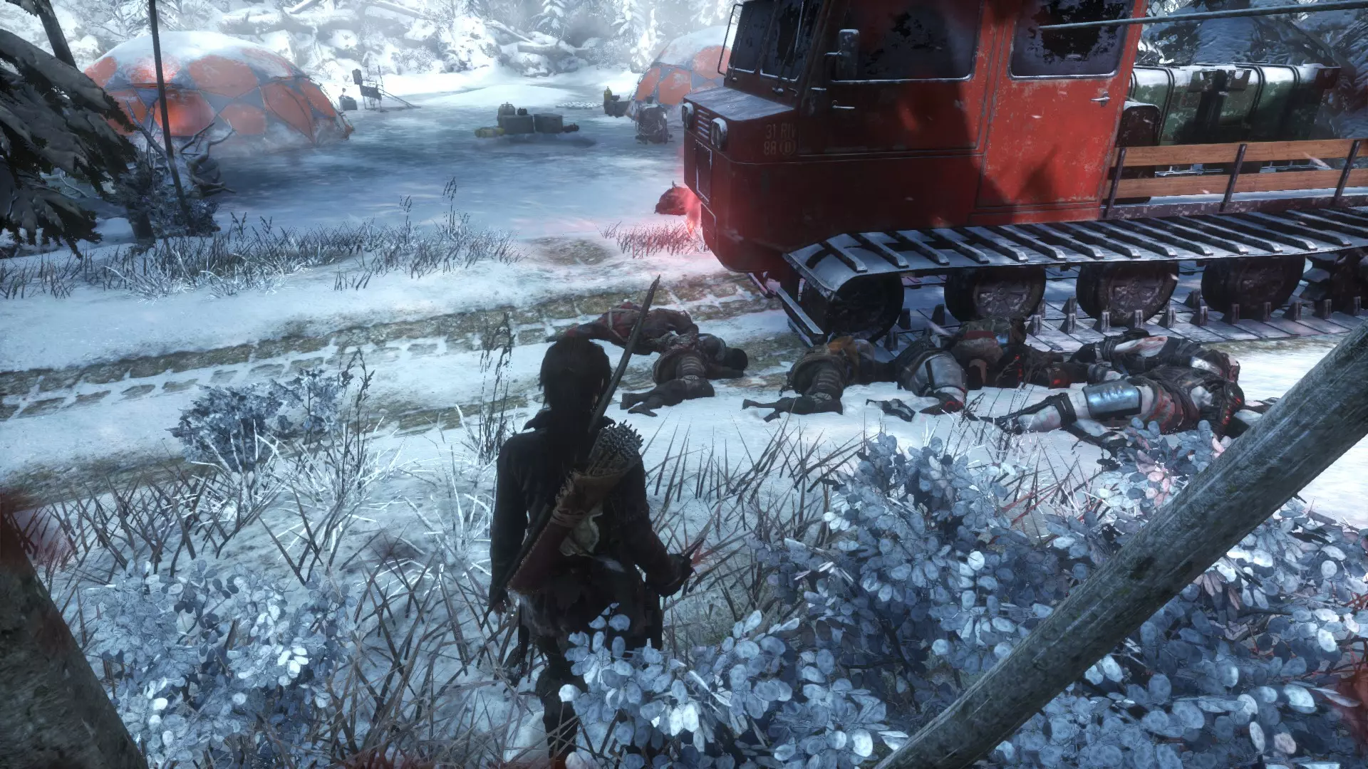化学战争 用一支毒箭击杀5名敌人 你需要升级毒箭的射程。我是在到达气象站后获得这个成就的。潜入冰下,悄悄杀死出口附近的一名敌人,然后出水。惊动另一名敌人,很快就会有5到6名敌人从拐角处出现。尝试将箭射向红色车辆旁形成一个 choke point(瓶颈区域),希望他们都会被毒到。我记得在射箭前他们好像就卡住了,所以可能需要一点运气。截图应该能帮上忙。