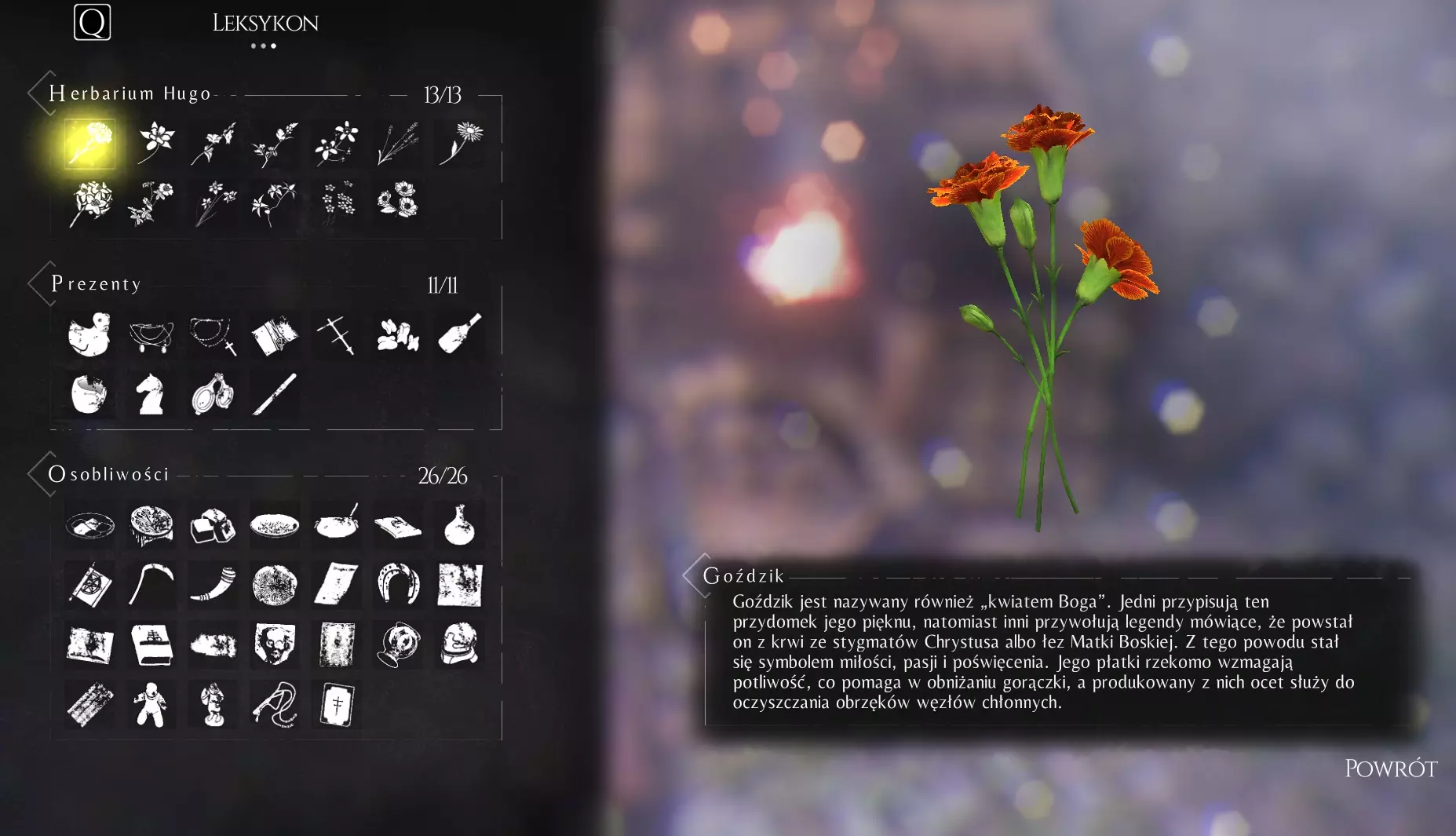 找到所有特殊物品。阅读末尾的说明。 收集品详情 游戏中共有50个收集品,分为三类。 雨果植物图鉴 - 此类需要收集花朵,共13个。 礼物 - 此类需要收集给同伴的礼物,共11个。 特殊物品 - 此类数量最多,共26个。 幸运的是,游戏中可以查看已收集的收集品。默认按I键可打开图鉴,其中包含所有已收集的收集品。