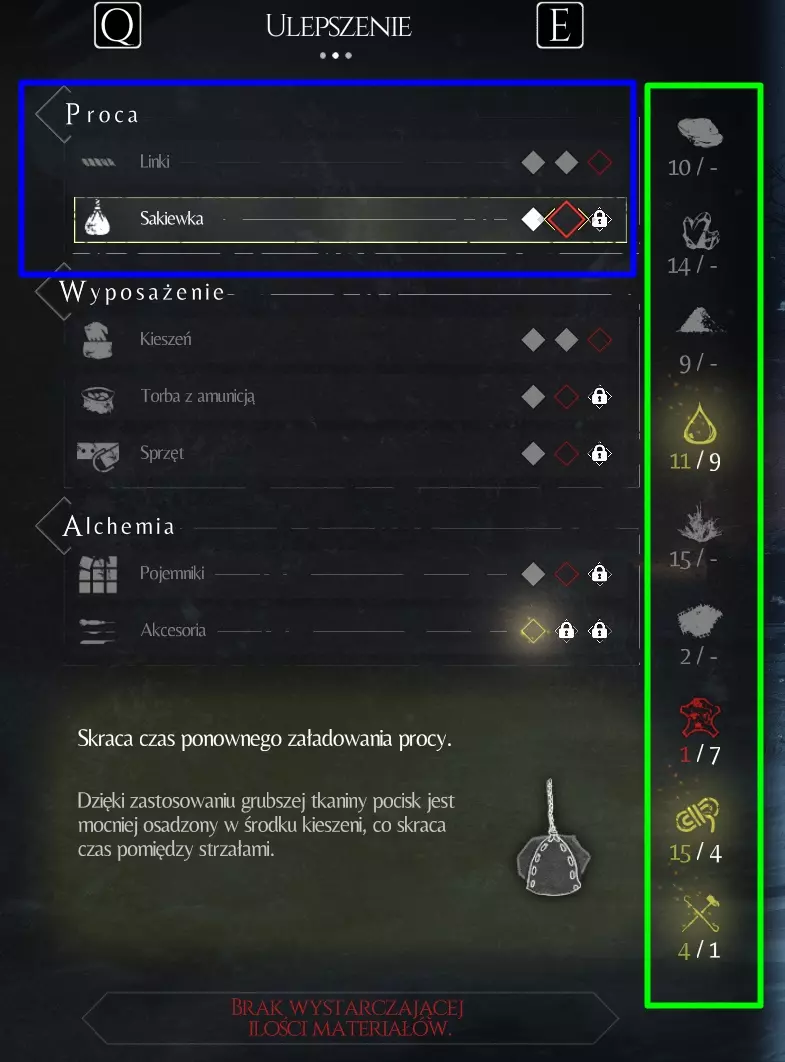 我们所有的装备都可以升级到3级。蓝色方框中我标记了进度:白色方块表示已完成的升级,红色空心方块表示因缺少材料而无法进行的升级。所需材料清单在绿色方框中已标出。 升级需在工作台进行,使用在游戏世界中找到的材料。