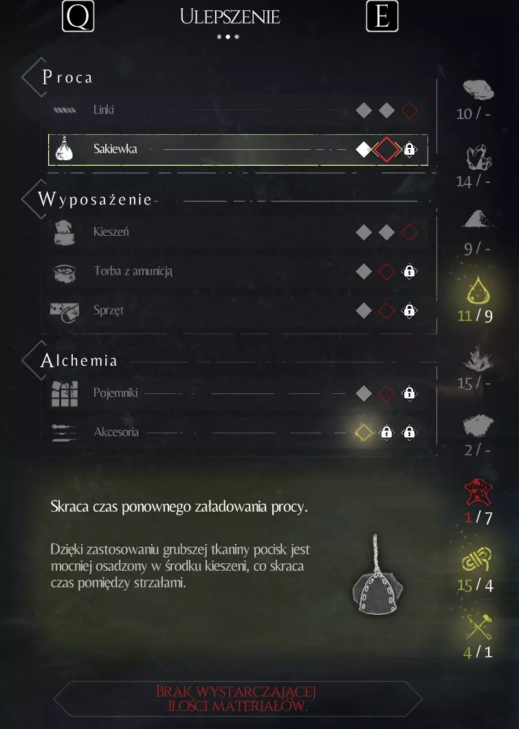 该成就奖励用于装备的最高级强化。 口袋 - 等级1 - (5x硫磺,3x材料,1x工具) 口袋 - 等级2 - (10x硫磺,6x材料,2x皮革,1x工具) 口袋 - 等级3 - (16x硫磺,10x材料,3x皮革,1x工具) 弹药袋 - 等级1 - (6x酒精,4x皮革,1x工具) 弹药袋 - 等级2 - (11x酒精,5x皮革,4x绳子,1x工具) 弹药袋 - 等级3 - (16x酒精,7x皮革,8x绳子,1x工具) 装备 - 等级1 - (5x硝石,5x材料,1x工具) 装备 - 等级2 - (11x硝石,6x材料,3x皮革,1x工具) 装备 - 等级3 - (18x硝石,9x材料,4x皮革,1x工具) 炼金术士