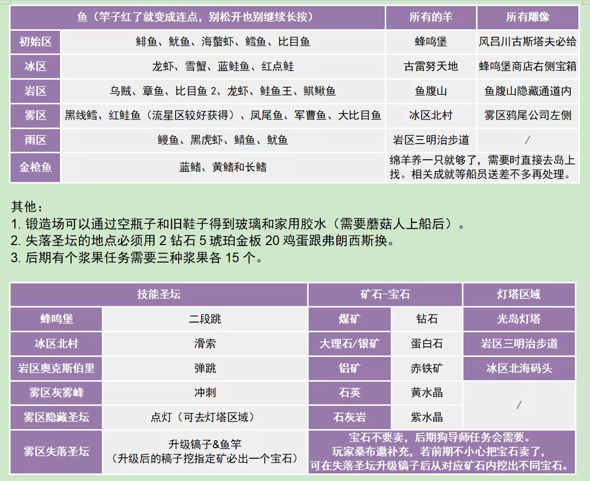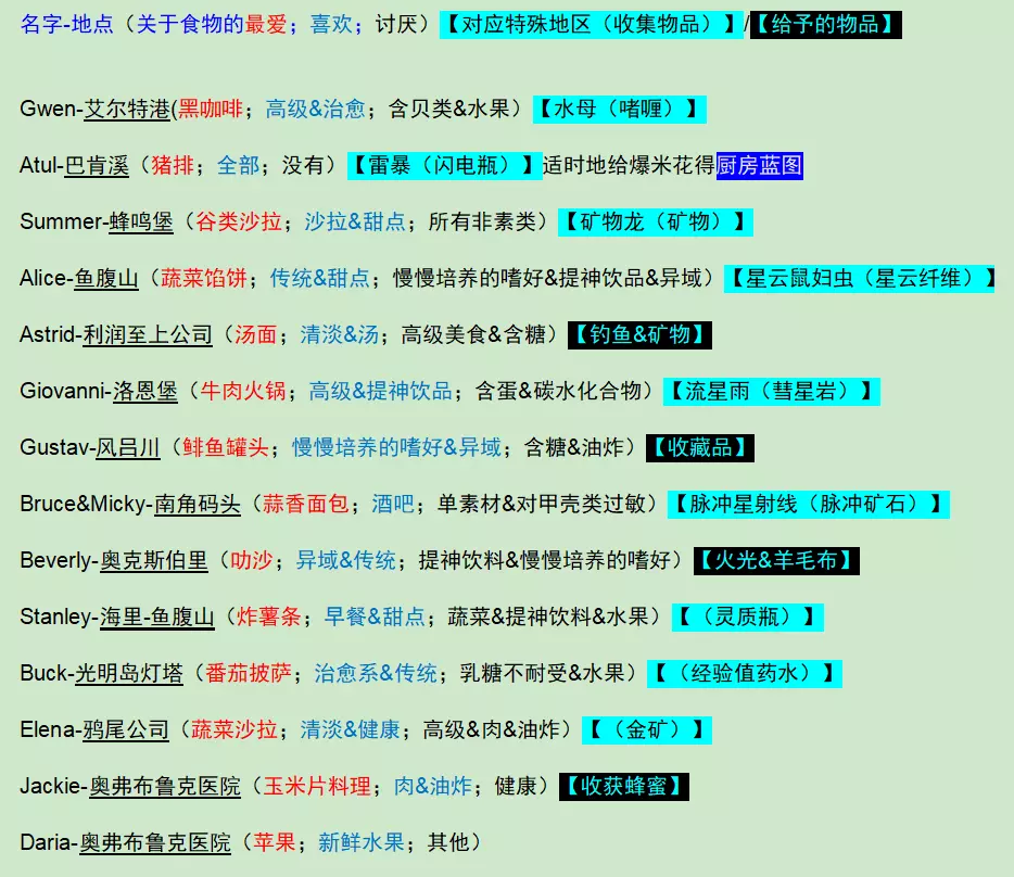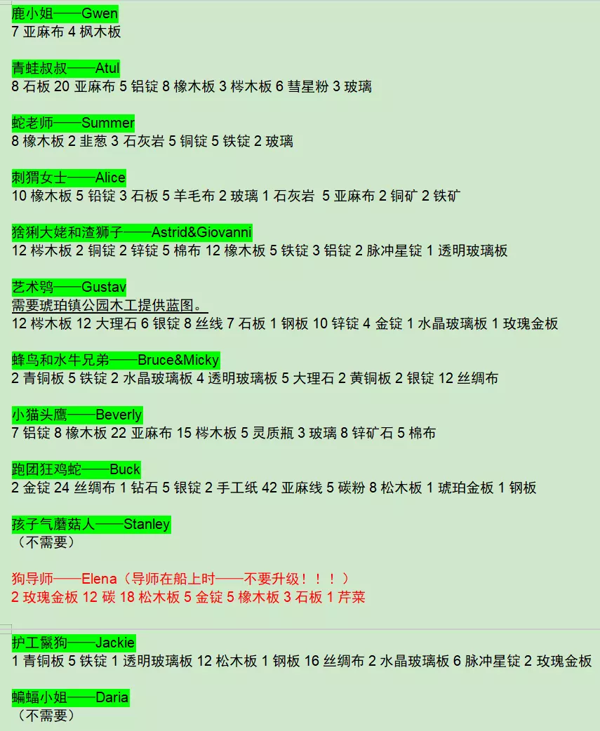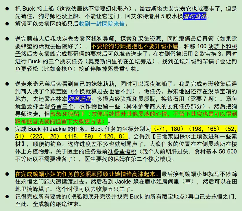 简单来说就是……我在游玩过程中把感觉需要的内容稍微整理了一下,希望能对其他人有所帮助。 是的,这是新版指南,也是全成就版本。 我非常建议在远程同乐时拉上好友一起玩。 以下是大致顺序: 本指南为本人原创,仅发布于Steam,不授予任何人授权,禁止搬运至其他平台。 关于更多内容:可以购买设定集和原声DLC,这里只记录游戏内部分。 个人建议先大致浏览一遍整个指南,记住一些注意事项再开始游戏。 全成就所需时间不超过50小时。 如果感觉卡住了,就看看任务,首先要把船的蓝图和功能升级到可以进入雾区的程度。个人顺序如下,仅供参考(共16位): 鹿小姐格温(优雅又带着一些叛逆的大小姐) 青蛙叔叔阿图尔(不挑食的工人叔叔) 蛇老师萨默(素食主义者) 刺猬女士艾丽斯(一位和善的女士) 猞猁大佬阿斯特丽德(能晚点送走最好,钓鱼挖矿大佬——姐你是我唯一的姐) 渣男狮子乔瓦尼(虽然但是甜言蜜语没人能拒绝,流星雨更是宇宙级浪漫) 艺术家鸮古斯塔夫(独特的叼钻寿司啊哈) 蜂鸟和水牛布鲁斯&Micky(要把雾区开了才能送走,带上船需慎重——会欺负其他灵魂) 小猫头鹰贝弗莉(可以提前一点来获得额外羊毛布) 跑团狂人鸡蛇巴克(学完弹跳后去接然后推任务寻宝) 大男孩蘑菇人斯坦利(怪家伙)妹妹蝴蝶莉莉(……) 狗导师埃琳娜(苛刻的导师) 护工鬣狗杰姬(可以提前一点让它来照顾船上的事务——虽然我不知道是如何照顾的) 蝙蝠小姐达莉亚(怪诞又可爱)