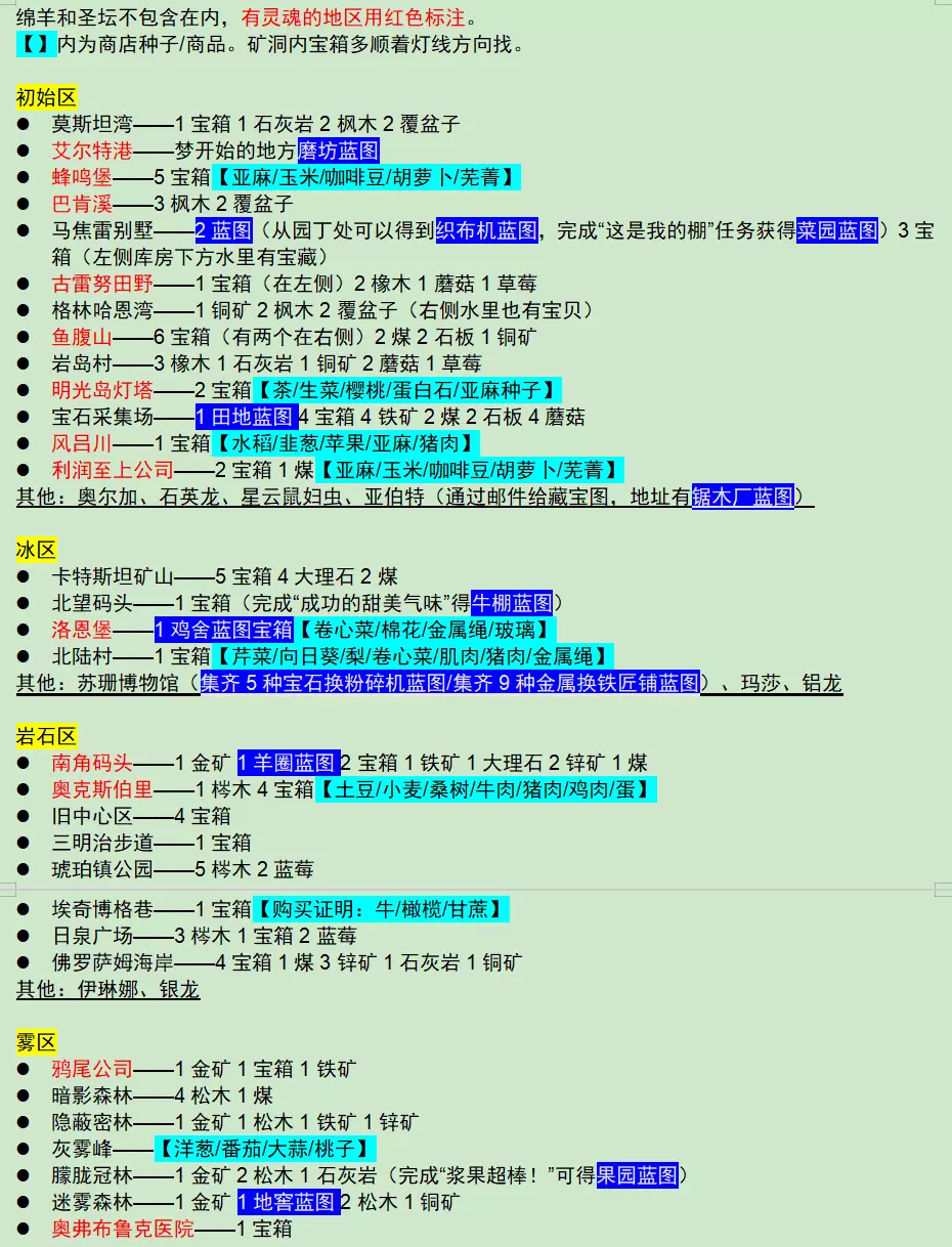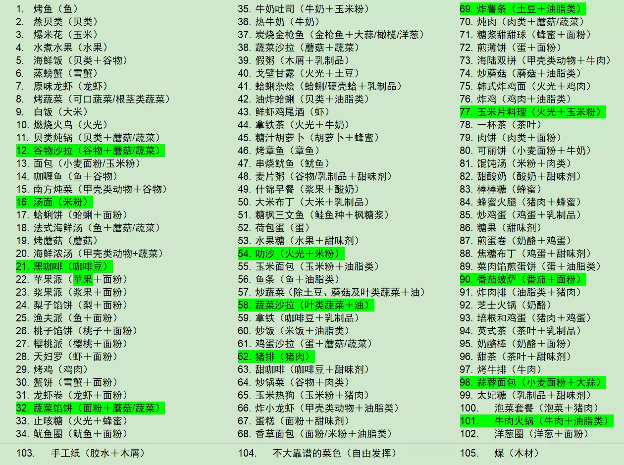 岩区有个金矿,可以通过踩垃圾箱弹跳积累高度后往左飘过去,然后种在乌龟背上。操作难度较高但可行。 厨房食谱 早期值得售卖的食品价格: 鲜虾鸡尾酒/串烧鱿鱼——250 猪排——320 一杯茶——400 桃子——175 作物产量参考: 生菜/卷心菜/洋葱——1 咖啡/茶/甘蔗/大蒜——2 亚麻/胡萝卜/芜菁/水稻/梨/芹菜/番茄——3 韭葱/桃子/土豆/番茄/棉花/苹果——4 玉米/桑树——5 樱桃/橄榄——7 地窖相关: 鲱鱼→鲱鱼罐头 卷心菜→泡菜 牛奶→酸奶→奶酪
