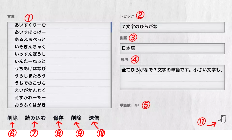 #項目説明1言葉ここに登録したいお題を入力します。 1行=1つのお題として登録されます。2トピックお題リストの名前を設定します。3言語お題が何語で構成されているかを設定します。4説明お題リストの説明文を設定します。5単語数現在登録した単語数が表示されます。 作成した単語を実際のゲームで使用したり、送信(ワークショップに登録)する場合 単語数が80以上である必要があります。6削除現在入力している①~⑤の項目を、全てクリアします。7読み込む現在所持しているお題リストを読み込みます。8保存現在編集中のお題リストを保存します。9削除現在編集中のお題リストを削除します。10送信現在編集中のお題リストをSteamのワークショップに送信します。 これをすることで、あなたが作成したお題リストを他の人が使うことができます。 ※送信が出来ない場合: 下記「FAQ的なもの」内の「お題を送信できない」を参照してみてください。11ドアタイトル画面に戻ります。 FAQ的なもの Draw&Guessをやっている中で、何度か聞く疑問点と対応策です。 参加できるルームが無い/ホストしても人が来ない残念ながら、曜日や時間帯によっては全く人が居ない事が多いです。 人が来るのをひたすら待つか、フレンドを誘ってプレイするか、運営本家のDiscordの募集チャンネル等で募集してみましょう。 ルームコードを指定しても入れない当たり前ですが、そのルームコードの部屋が作成されている必要があります。 また、対象のルームがロビーで待機中である必要があります。 ゲーム進行中は途中参加できません。 プライベートからフレンドの部屋に参加する場合も同様に、途中参加は出来ませんのでご注意ください。 みんなの絵を保存したいDraw&Guessをやっていると、時折「この絵素敵!保存したい!」という事が(私は)よくあります。 その場合の保存方法は2つ。 「F12」キーを押す F12キーを押すと、Steamの機能によりスクリーンショットを撮ることが出来ます。 この場合、撮ったスクリーンショットは Steamのメニューから「表示」>「スクリーンショット」 を選択することで確認できます。 保存(フロッピー)ボタンをクリック ゲーム中、画面の右上に保存ボタンが表示されるので、それをクリックすればスクリーンショットが保存されます。 この場合のスクリーンショットはPC>ピクチャ>Draw&Guess(パスは"C: Users (ユーザー名) Pictures Draw&Guess")に保存されます。 (上記はWindowsの場合。他環境の場合は分かりません。。) 自動保存も可能です スクリーンショットを撮り損ねてしまう場合や、毎回ボタンを押してられない人は メニュー画面から設定を開き「図面の自動保存」を「全部」にすれば 全ての絵が勝手に保存されます。 ※1ファイル200KB程度ですが、放っておくと相当数のファイルが貯まるのでご注意ください お題を送信できない自分で作ったお題を送信するには、ある程度(80個くらい?)のお題が書かれている必要があります。 また、「トピック」「言語」「説明」も入力されている必要があります。 なお、送信出来ない数しか書かれていないお題は、実際のゲームでも使用することが出来ません。 (お題が赤字で表示されて選択できない) 送信する前でも「自分が出すお題」としての使用は可能なので、実際に選択できるか・そのお題で遊んだ時に楽しかったか等を確認しておくと良いかも知れません。 他の人が公開したお題リストが欲しい!SteamのライブラリからDraw&Guessを選択し、メニューの中から「ワークショップ」をクリックします。 Draw&Guessのワークショップでは他の人が公開しているお題が並んでいるので、気に入ったものをサブスクライブすれば、次回のゲームで利用することも可能です。 どんなものがあるかって?例えばこんなものが(露骨な宣伝) https://steamcommunity.com/sharedfiles/filedetails/?id=2532476201 https://steamcommunity.com/sharedfiles/filedetails/?id=2572607599 ゲーム中に落ちる!残念ながら、よくある事です。 再接続(失敗することもよくある)を待つか、ログを運営に送って今後のアップデートに期待しましょう。 音が二重に聞こえる伝言ゲームの答え合わせ時、ドラムロールが二重に聞こえる事がありますが ゲームに支障は無いので気にせずにやりすごすか、今後のアップデートに期待しましょう。 全員チェックしたのにゲームが進まない!たまに発生するバグです。 復旧できないので、一旦ルームを解散してもう一度作成してください。 既知の問題なので、今後のアップデートで治る可能性が高いです。 おわりに ご指摘や編集リクエスト等ありましたら、コメントや運営公式のDiscord等で 私(JoyNus#7897)にメンションを飛ばしていただけたら嬉しいです。 それでは長文、乱文失礼しました。 Happy drawing!