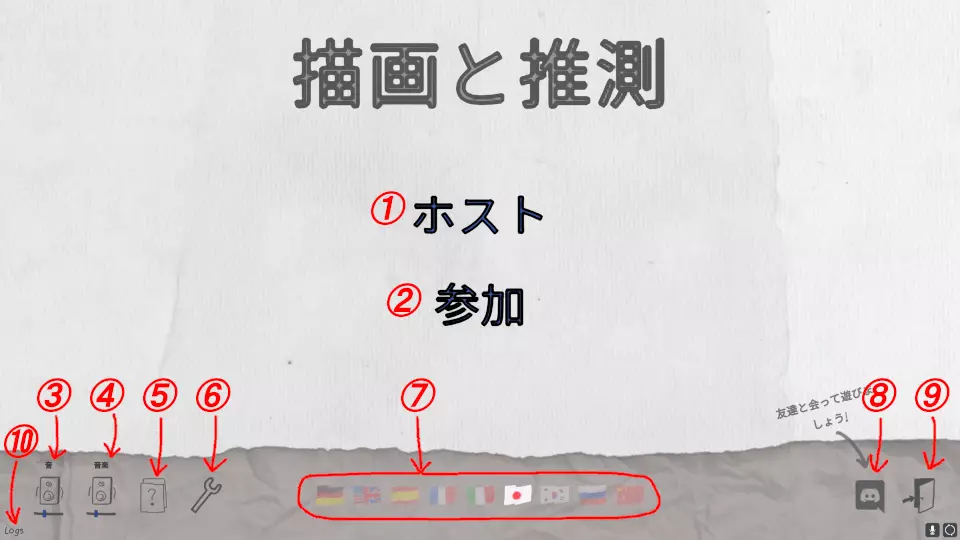 1. 创建主机游戏房间。可选择公开或私人。 2. 加入主机创建的游戏房间。除公开、私人外,还可通过指定房间代码加入。 3. 调节游戏内音效音量。 4. 调节游戏内音乐音量。 5. 问号图标:进入题目创建画面。 6. 扳手图标:显示设置画面。 7. 国旗:切换自己使用的语言。(不仅游戏界面会切换,房间的搜索范围也会改变)国旗下方的数字是当前可加入的房间数量。8【Discord图标】连接官方Discord。 9结束门游戏。 10打开Draw&Guess日志文件输出的文件夹。 此处的文件可能用于错误报告等。 游戏房间(大厅)画面