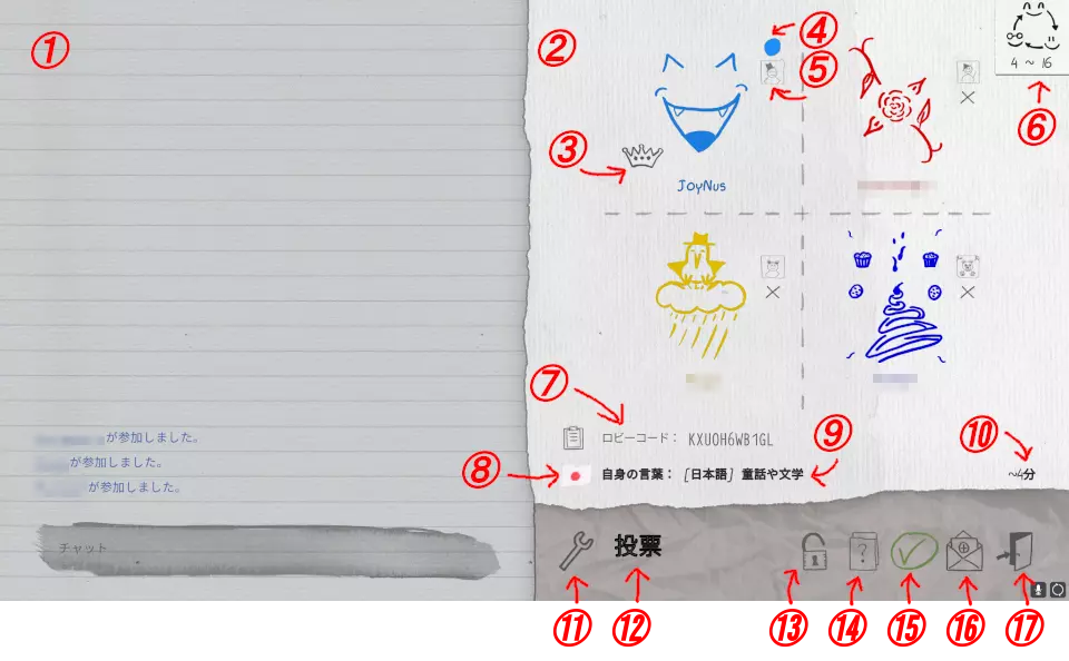 1. 聊天区域(左半部分):与房间参与者进行聊天的区域,系统消息也会在此显示。 2. 参与者区域(右半部分):显示房间参与者(最多16人)。 3. 王冠:房间主持人会带有王冠标记。 4. 颜色更改:可以更改自己的图标颜色,无法直接更改图标本身(退出房间后重新进入即可更改)。 5. 个人资料:可以查看玩家的Steam个人资料。 6. 游戏模式:显示当前游戏模式是【传话游戏】还是【问答游戏】。作为房主,可以在此处切换游戏模式。也可以在此处切换“从三个题目中出题”或“自由决定题目”。7 房间代码:当前所在房间的代码。将此房间代码告知他人,对方即可直接加入当前房间。点击左侧的剪贴板即可复制。8 国旗:显示房主设定的语言。9 自身的词语:显示房主设定的题目列表。10 预计游戏时间:显示根据当前人数和当前规则开始游戏时预计所需的时间。11 扳手图标:可以查看当前游戏设置和规则。 如果是房主,可以更改游戏设置,例如是否开启投票、游戏回合数等。 12 投票: 访客:可以对绘画时间限制、可用颜色数量、可用画笔等规则进行投票。 房主:和访客一样可以参与投票,但房主可以通过上述扳手图标切换投票的开启/关闭。 关闭投票时,游戏将按照房主选择的设置和规则进行。 13 锁形图标:如果不想再增加参与者,房主可以给房间上锁。 14?房主可以选择自己持有的题目。15 切换准备完成/取消完成。 当所有人都准备完成后,5秒后游戏开始。16 打开邀请标记好友的界面。17 返回标题画面。 题目创建界面