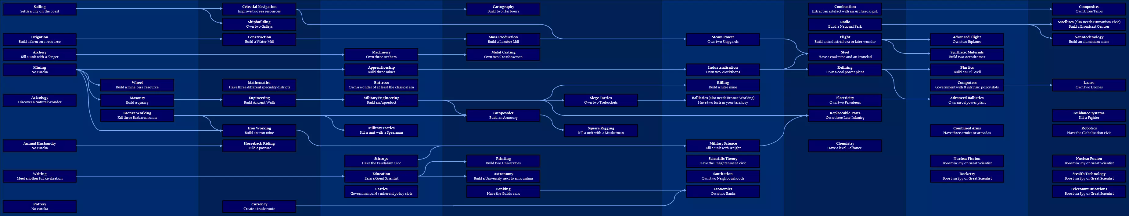 Tricks Civilization Ability: Workshop of the World Military Engineers If you use all but one Military Engineer charge on other things, you can rapidly rush an Aqueduct, Dam, Canal or Flood Barrier by moving in a succession of 1-charge Military Engineers and using their final charge. You can switch production from an Aqueduct, Dam, Canal or Flood Barrier to something else before you end your turn and switch back the following turn so you can use Military Engineer charges. This essentially allows you to build two things at once. Training Military Engineers and then using their charges to rush districts or Flood Barriers will be more efficient than directly building them if the former costs less than 80% of the latter's price. Military Engineers are support units, unlike Builders. It is possible to stack them both on the same tile, and use the Military Engineer to clear a feature followed by using the Builder to place an improvement, or vice versa. Eleanor of Aquitaine's Leader Ability: Court of Love Build Art Museums in border cities as it is easier to move Great Works of Art than it is to move artefacts, allowing you to quickly move them in to place extra loyalty pressure, and move them out when that is no longer needed. Pack your cities tightly together and grow them as large as you can to maximise your loyalty pressure. Rock Bands with the Indie promotion can take 40 loyalty off a rival city. Three Indie Rock Bands can entirely remove a city's loyalty in a single turn if they have sufficient venues to play at, allowing you to flip even the most powerful cities to your control so long as they're within 9 tiles of one of your own cities. The future-era Cultural Hegemony civic grants you access to the Hallyu wildcard, allowing you to choose any promotion for Rock Bands. This allows you to reliably take the Indie promotion. Victoria's Leader Ability: Pax Britannica With the Ancestral Hall Government Plaza building, you'll get a Builder in all new cities. Add the Serfdom economic policy card (requires the medieval-era Feudalism civic) and they'll have five charges. This allows you to chop down woods or rainforest to rapidly build a Royal Navy Dockyard for the second free unit, while still having charges left to improve the city in other ways. Victoria's Unique Unit: Redcoat Military Science is a particularly easy technology to beeline, which makes it easier to have a military advantage over other civs. Unique Unit: Sea Dog Retiring the renaissance-era Great Admiral Francis Drake allows you to receive a Sea Dog even without the Mercantilism civic. Because units are more likely to be captured if they're weaker than the Sea Dog, forming fleets and armadas is a good way to improve your odds of capture. Unique District: Royal Navy Dockyard Take the Free Inquiry Golden Age dedication in the classical or medieval era for masses of science based on Royal Navy Dockyard adjacency bonuses, boosted further with the Naval Infrastructure economic policy card (requiring the medieval-era Naval Tradition civic). This can support a beeline to the MIlitary Science technology for early Redcoats. The extra Great Admiral Points allow you to fairly reliably take both Santa Cruz and Yi Sun-Sin in the renaissance era for an early Ironclad armada. Remember they can only heal through pillaging and promotions until you have access to coal resources! Hidden Features Eleanor of Aquitaine's Leader Ability: Court of Love If a city loses enough loyalty to become a free city, if Eleanor is placing any loyalty pressure on the city whatsoever, it will flip to her control - even if other civs are placing more pressure on it. Clarifications Civilization Ability: Workshop of the World The exact bonuses to powered buildings are as follows: Airport: +4 production Broadcast Centre: +4 culture Factory: +4 production to all cities within six tiles unless they are already in range of this building Food Market: +4 food Research Lab: +4 science Shopping Mall: +4 gold Stock Exchange: +4 gold The bonus yields from Broadcast Centres, Research Labs and Stock Exchanges can be boosted with the appropriate policy cards. Eleanor of Aquitaine's Leader Ability: Court of Love Relics and artefacts count as Great Works for the purposes of this ability. The 9-tile area of effect for Great Works, relics and artefacts is centred on the city centre, regardless of the district or wonder the Great Works are stored in. Victoria's Leader Ability: Pax Britannica Duel-sized maps only have a single continent by default, so you will be unable to get the extra trade route or free melee unit. Cities may be founded, but not captured or received in a deal to get a free melee infantry unit. However, the free naval units can be generated in any city which builds a Royal Navy Dockyard. The free melee infantry unit will be the strongest one you can currently train based on your technology. Strategic resource requirements do not matter! The same rules apply to the free naval units. There are three special cases where naval units have the same strength: Sea Dogs take priority over Frigates which take priority over Caravels, and Missile Cruisers take priority over Nuclear Submarines. You can never receive Aircraft Carrier units from this ability as they arrive on the same technology as, and are weaker than, Destroyers. The free units will start will full health and can move and fight immediately. Victoria's Unique Unit: Redcoat Duel-sized maps only have a single continent by default, so you will be unable to use Redcoats' foreign-continent strength bonus. After disembarking, the Redcoat cannot have more movement points remaining than its limit on land, minus one. Unique Unit: Sea Dog The chance of capturing an enemy naval unit scales based on the strength difference between the Sea Dog and the unit it defeats. Weaker units are more likely to be captured. Captured units will start at 25 health. Unique District: Royal Navy Dockyard The +2 gold bonus Royal Navy Dockyards get 