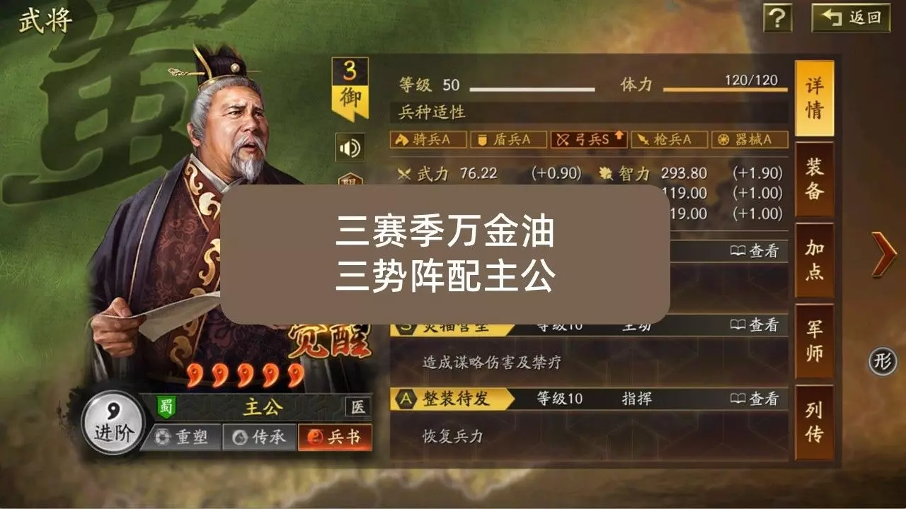 三赛季的三势主公,可能是平民玩家最容易配出战斗力的一直队伍。主公的强大在S3赛季配合三势阵的登场到达了巅峰, 可以说是赛季T0武将。