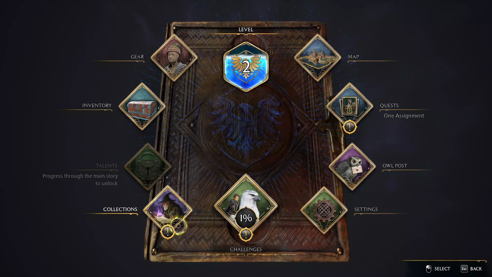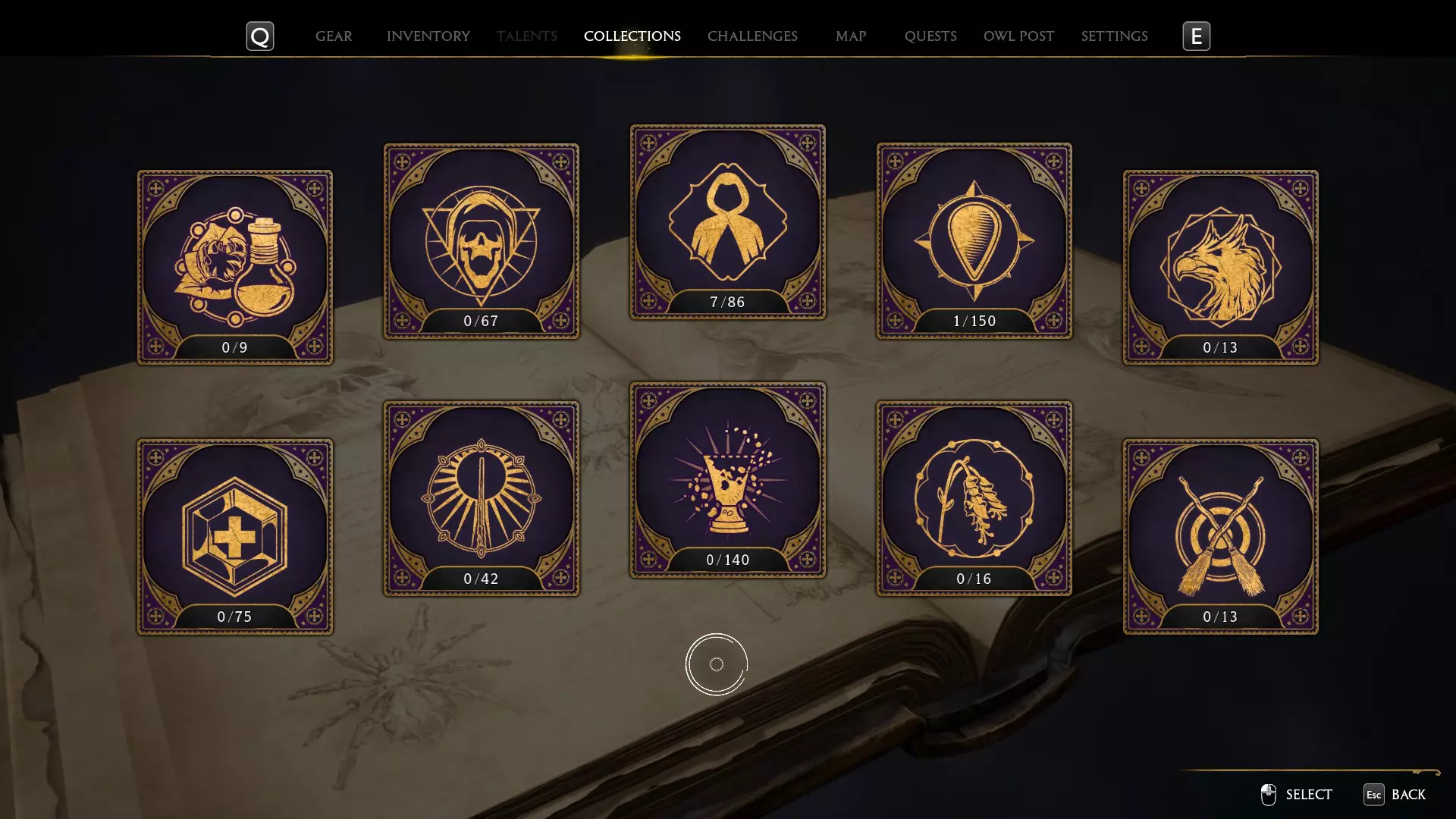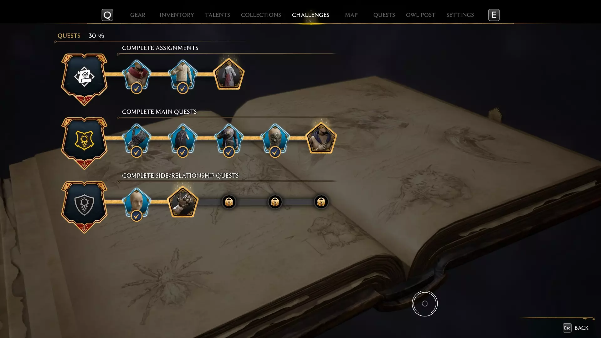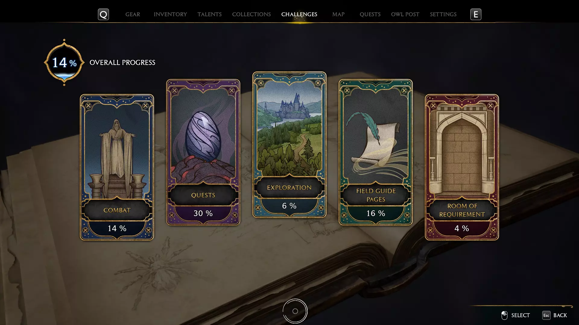 在这里你可以看到战斗、任务、探索、魔法指南书页和有求必应屋的挑战。所有挑战都不会错过,所有内容都可以在主线故事结束后完成。你需要完成几乎所有挑战的所有等级,因为这些会奖励你收集品,而收集品是解锁收藏家版成就所需的。