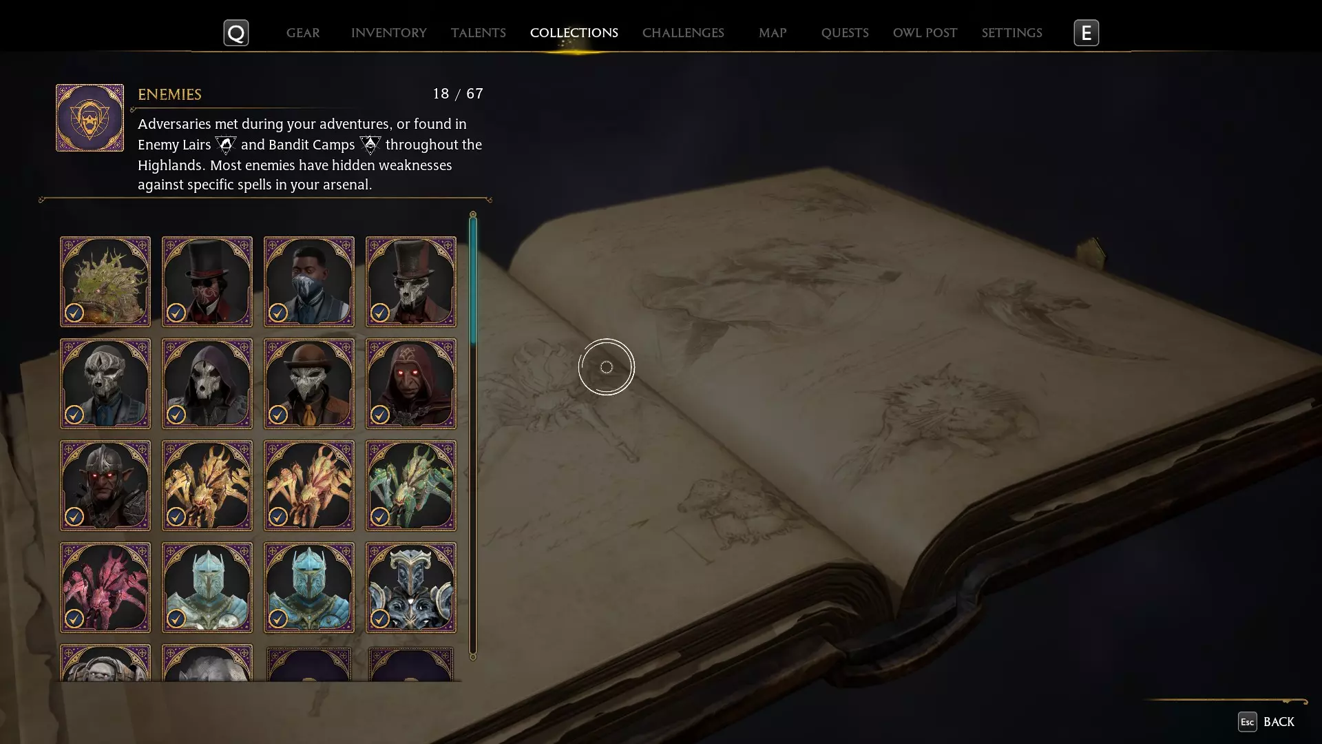 在此你可以查看解锁该成就所需寻找的所有收集品类型: 10个工具 69个敌人 89种外观 150张 Revelio 书页 13只野兽 75个特性 42个魔杖柄 140个召唤物 16个材料 13把扫帚
