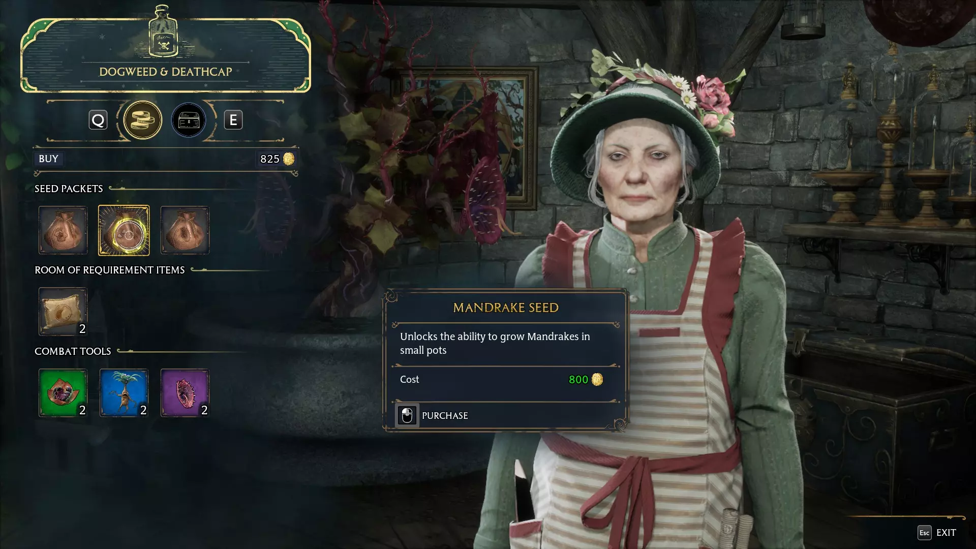 在霍格莫德北部的【狗草与毒帽】商店(地图上的蘑菇图标)购买“曼德拉草种子”,价格为800金币。