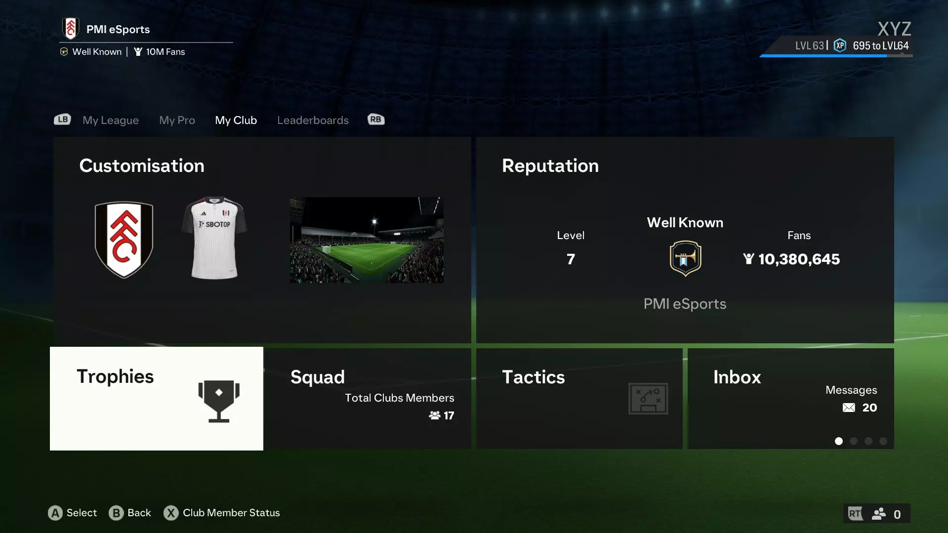 通过Alt + F4或在任务管理器中关闭游戏 重新打开游戏并重新进入俱乐部窗口 如果进入俱乐部窗口后仍未解锁成就,请参见下文 方法2:加入在上一赛季赢得季后赛的职业俱乐部队伍。你也可以使用我加入过的同一支队伍,如果他们仍在开放的PMI eSports中 在俱乐部界面,导航至【我的俱乐部】标签页,然后选择左下角的【奖杯】