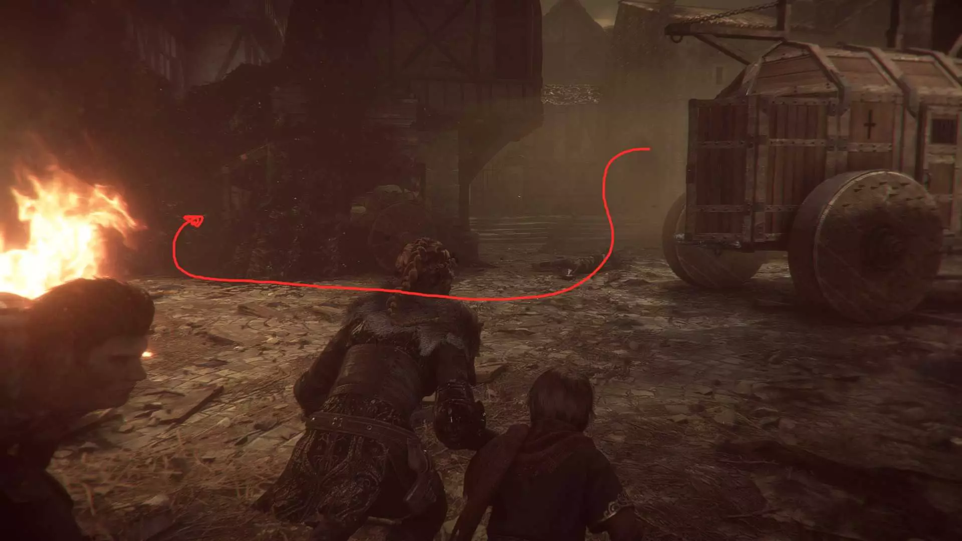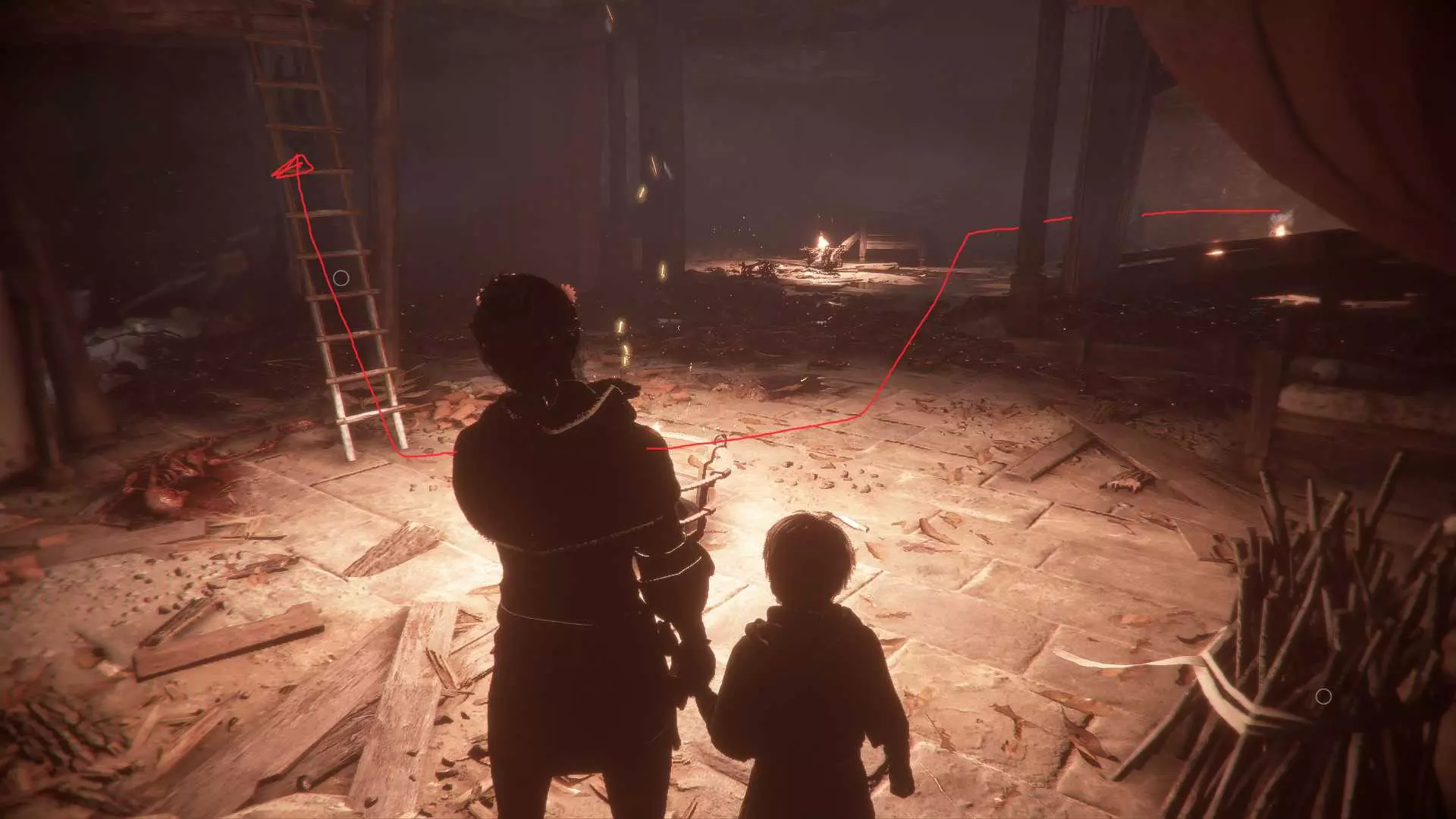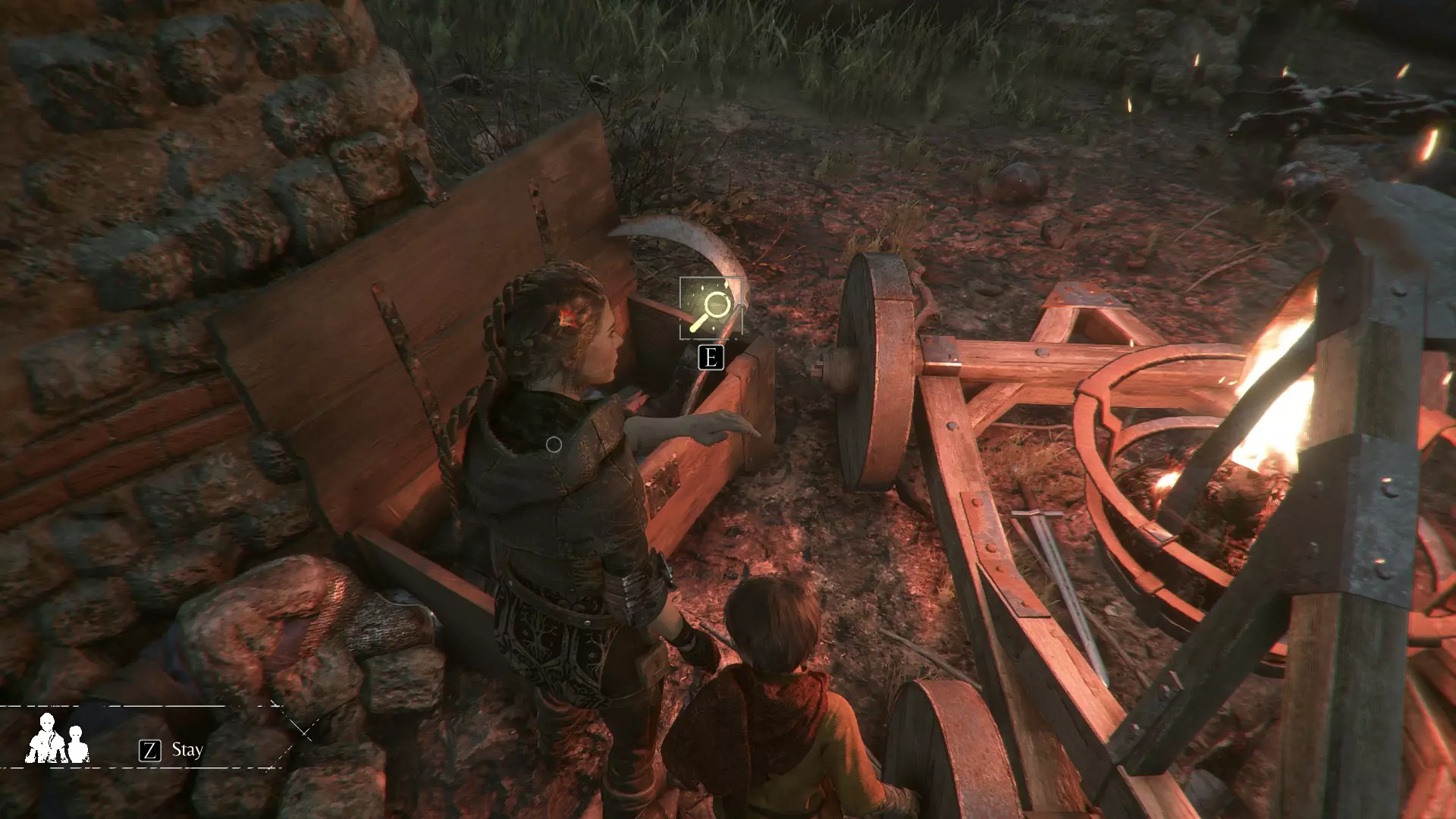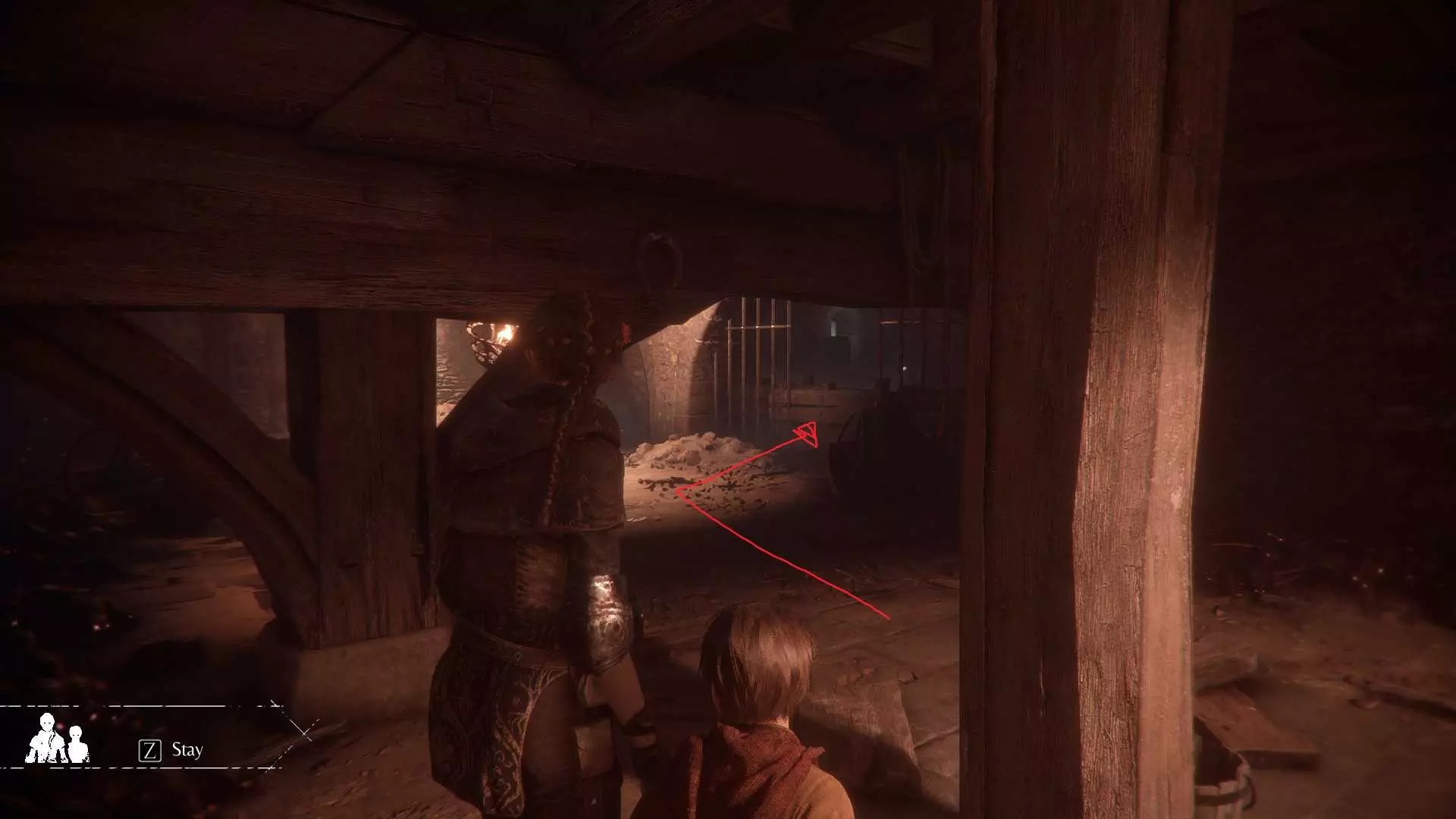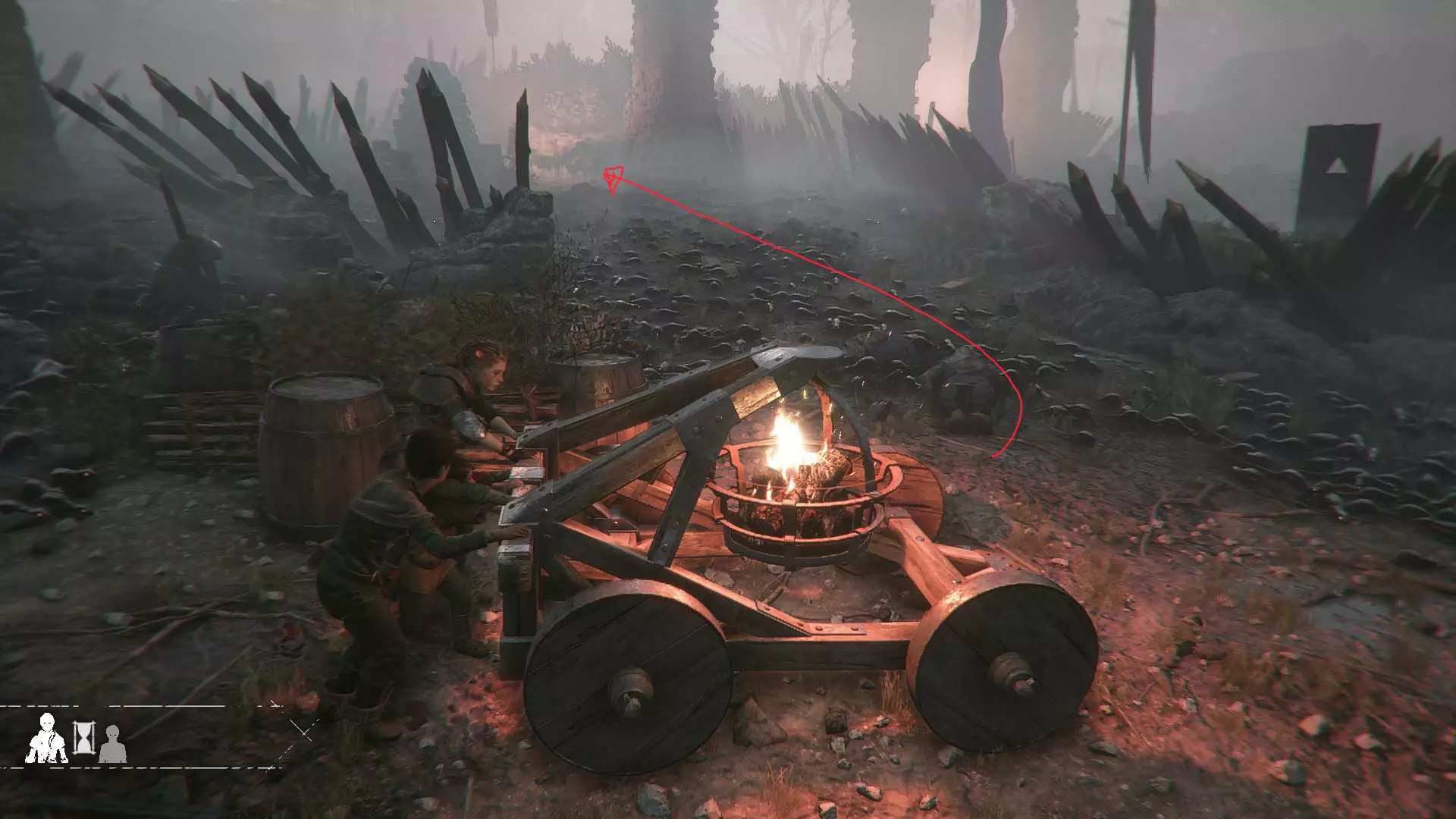 在指引卢卡斯操作附带燃烧篮的投石机的区域,雨果取回木棍后,点燃木棍并向右走到石围栏处。围栏内有一个可点燃的篝火、更多木棍,以及篝火旁的【压舱石】。