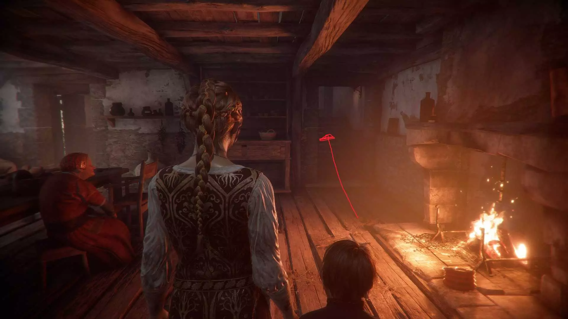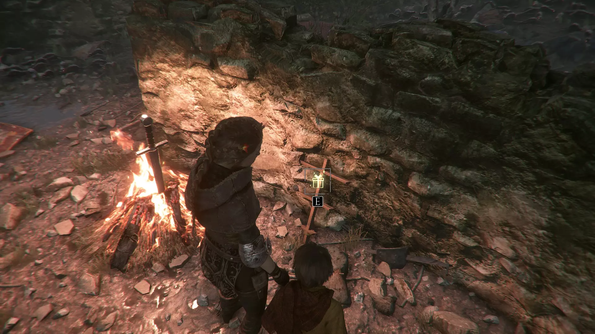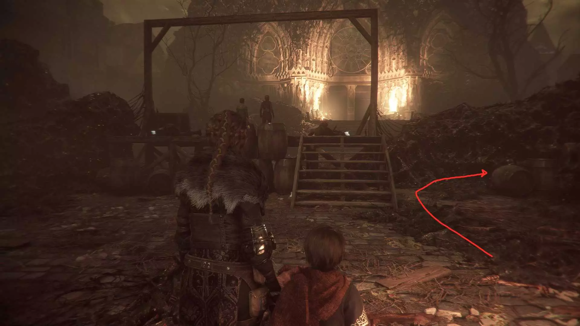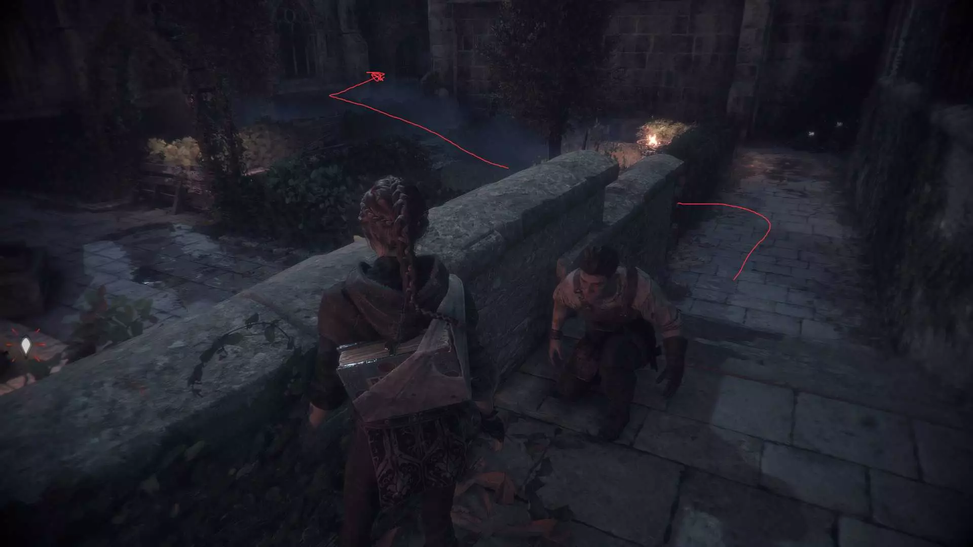 在指引卢卡斯操作附带燃烧篮的投石机的区域,雨果取回木棍后,点燃木棍并向右走到石围栏处。围栏内有一个可点燃的篝火、更多木棍,以及篝火旁的【压舱石】。