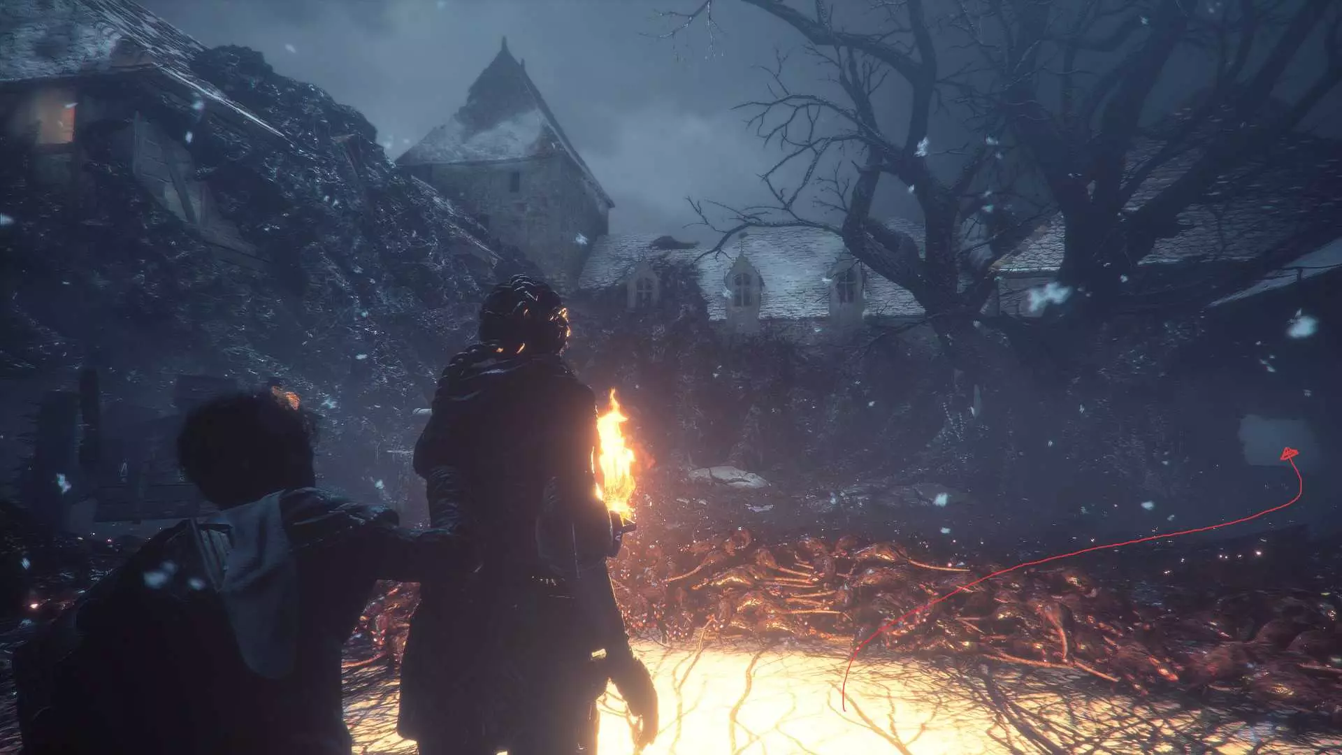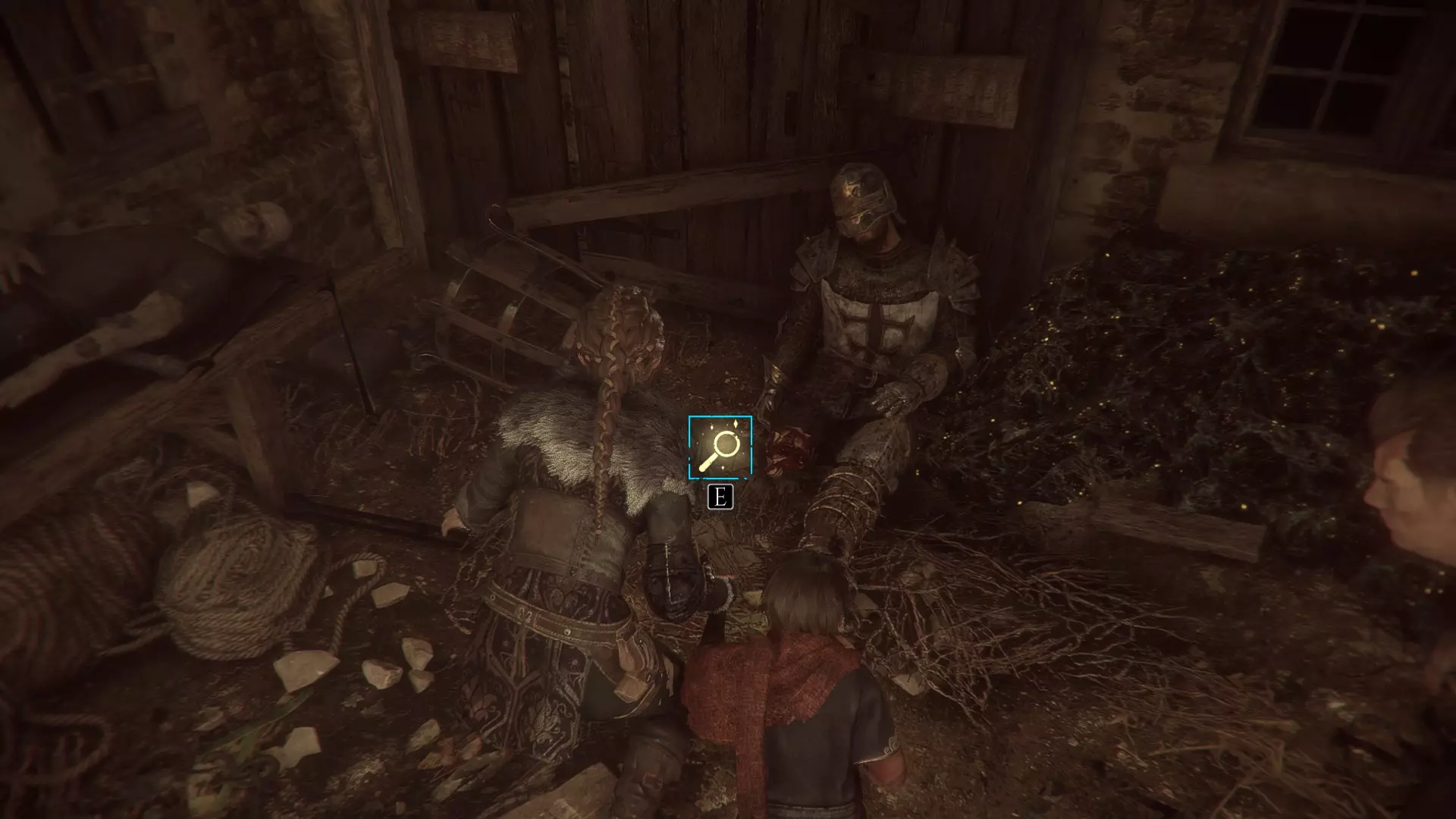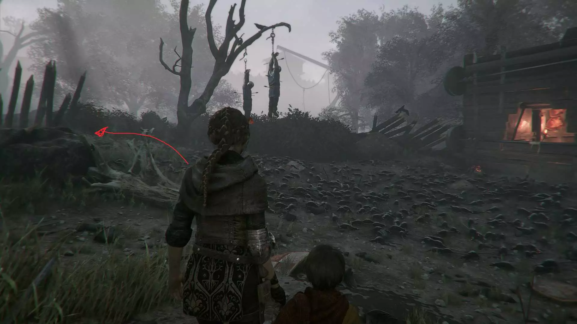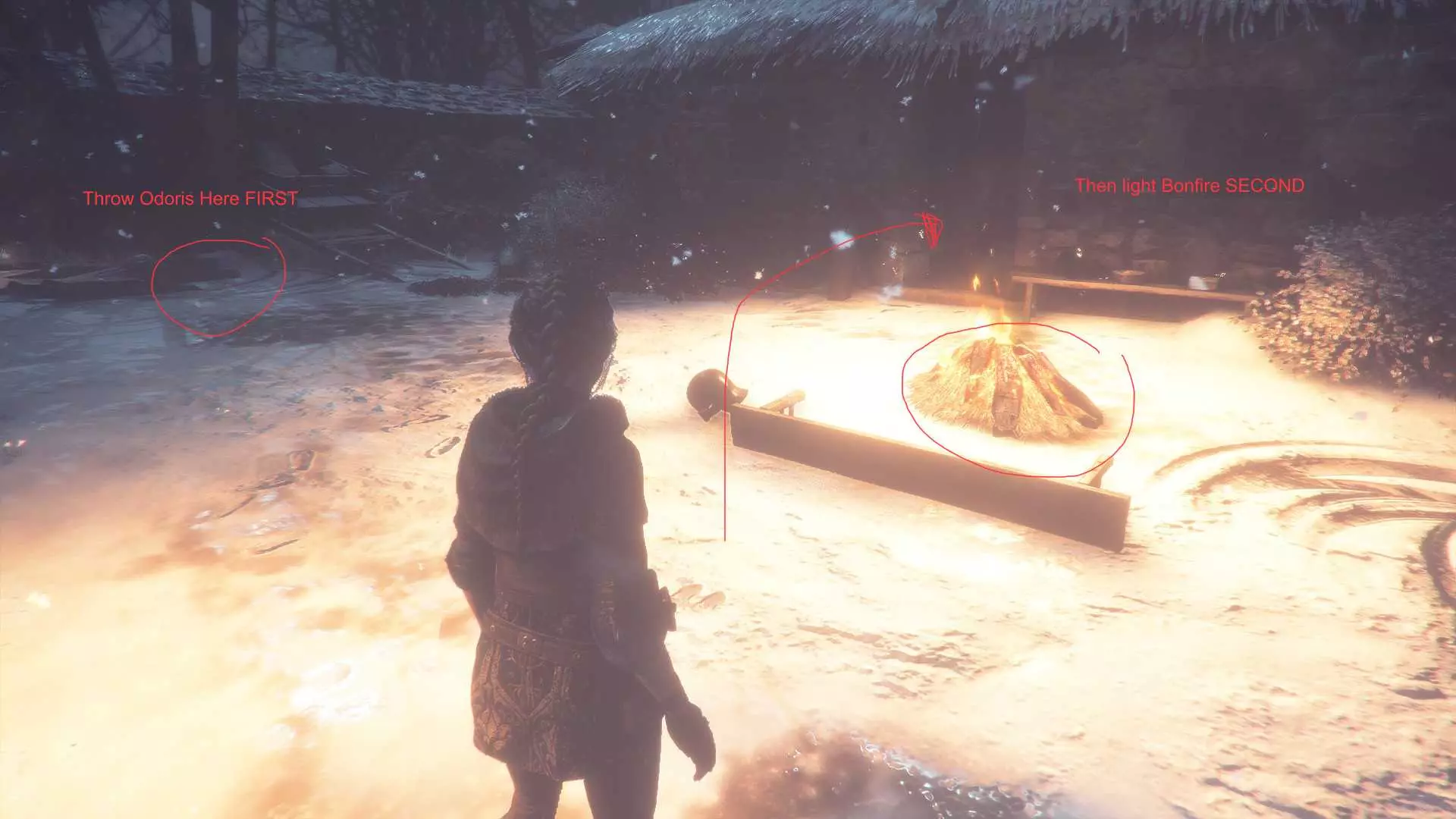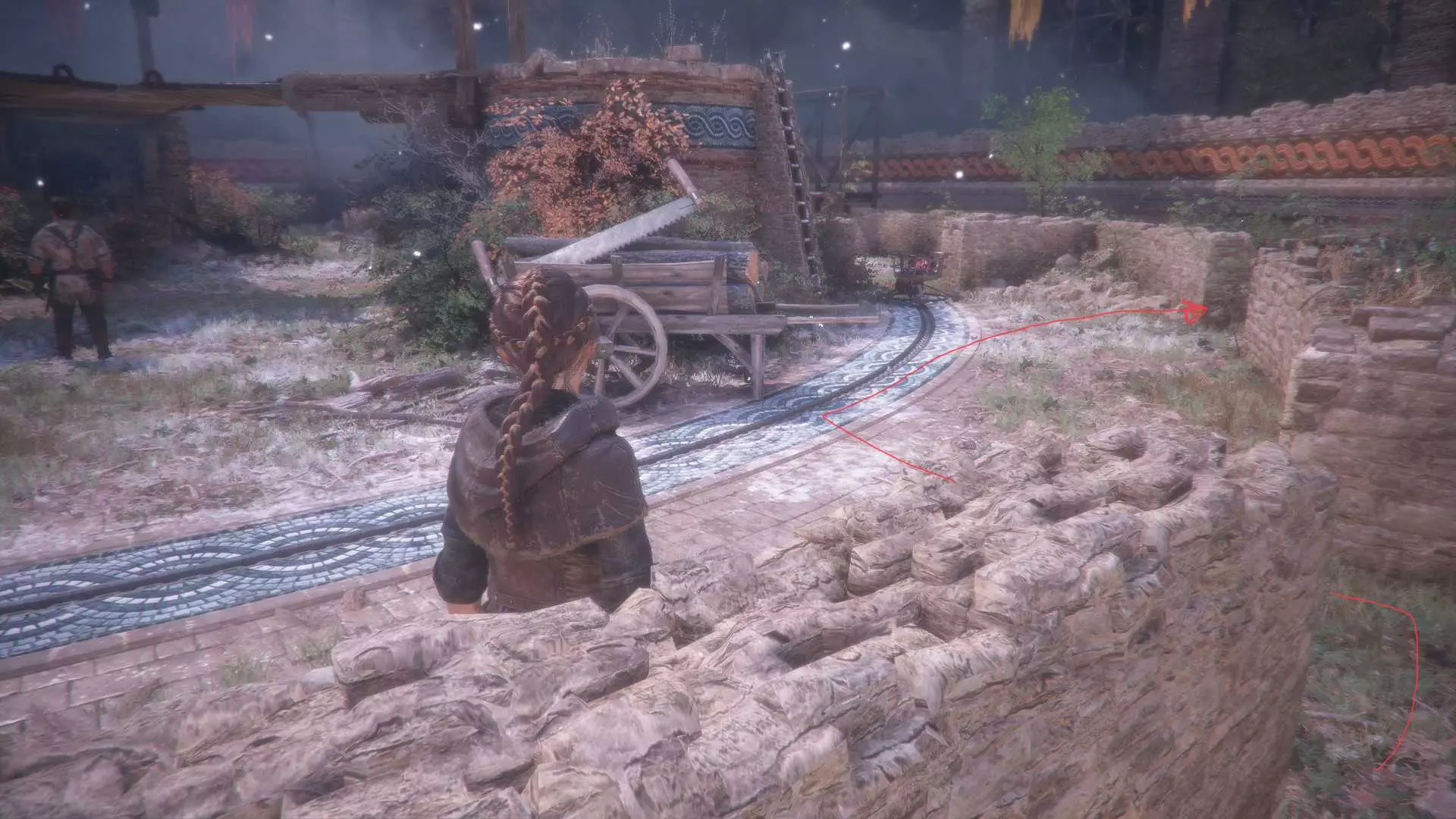 在指引卢卡斯操作附带燃烧篮的投石机的区域,雨果取回木棍后,点燃木棍并向右走到石围栏处。围栏内有一个可点燃的篝火、更多木棍,以及篝火旁的【压舱石】。